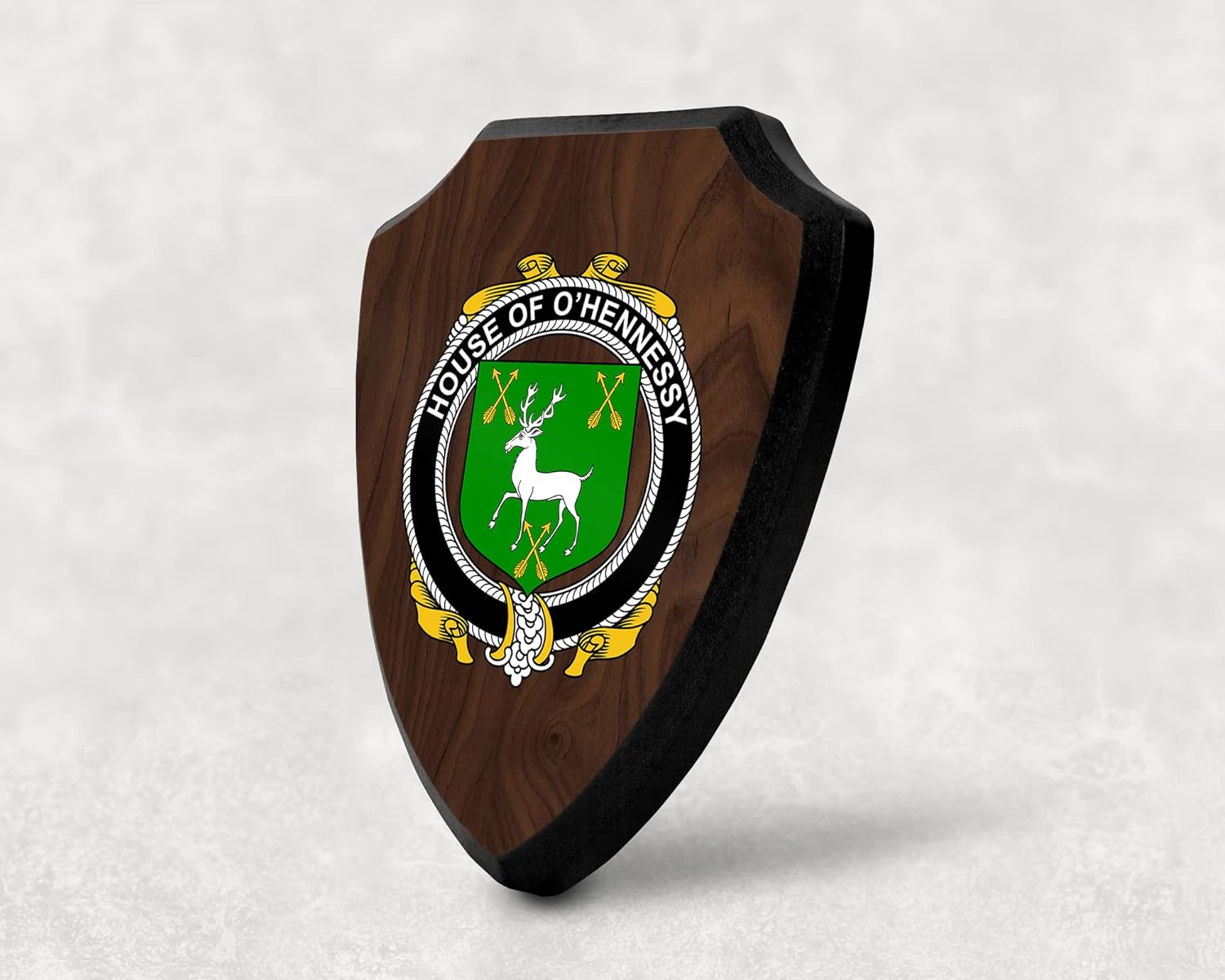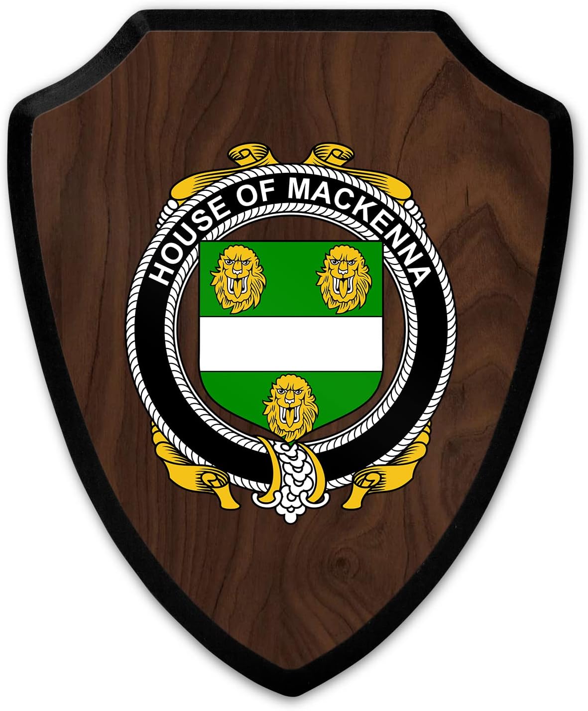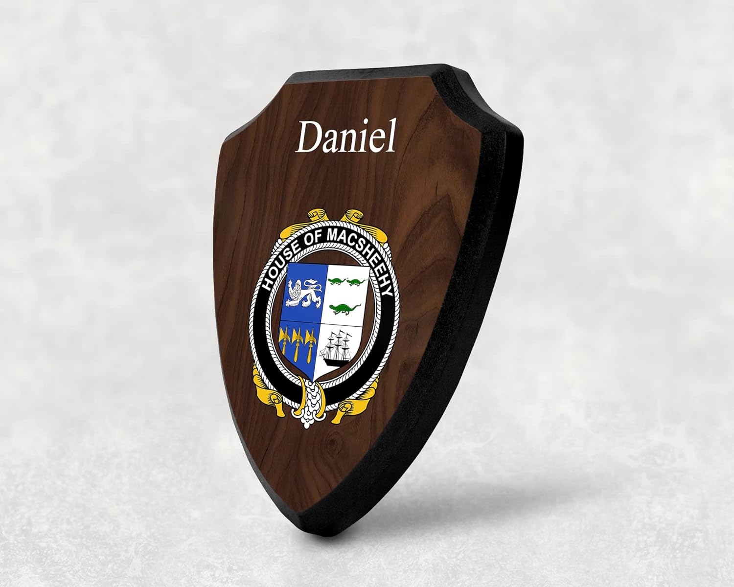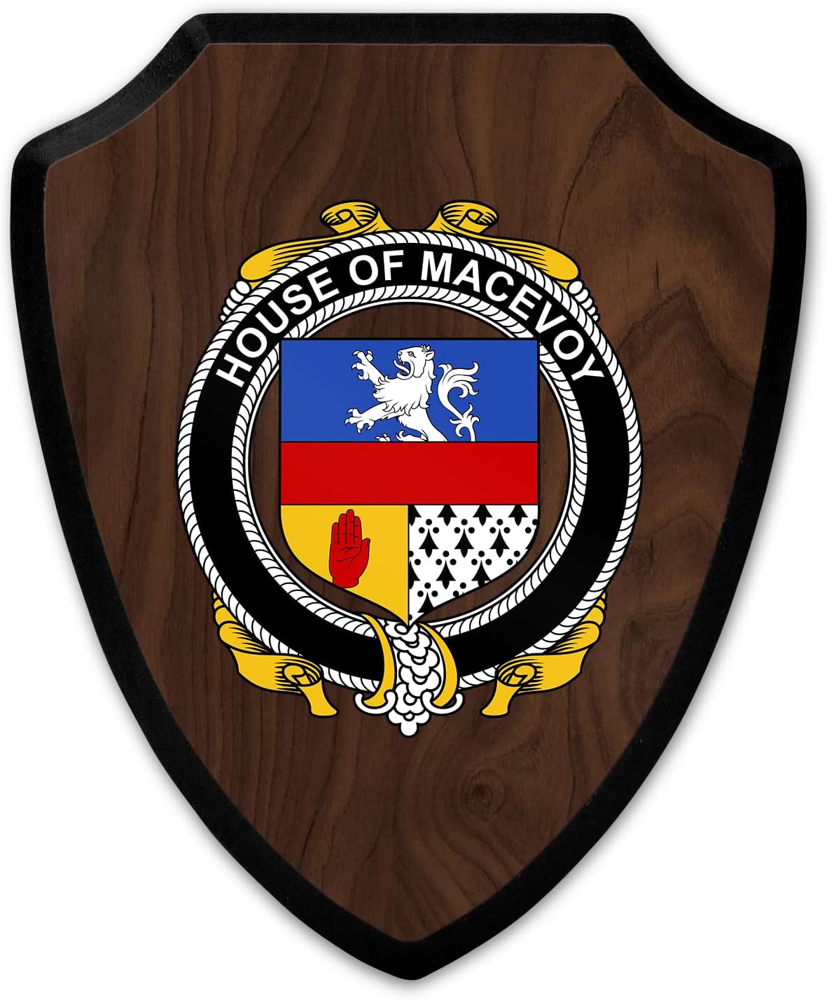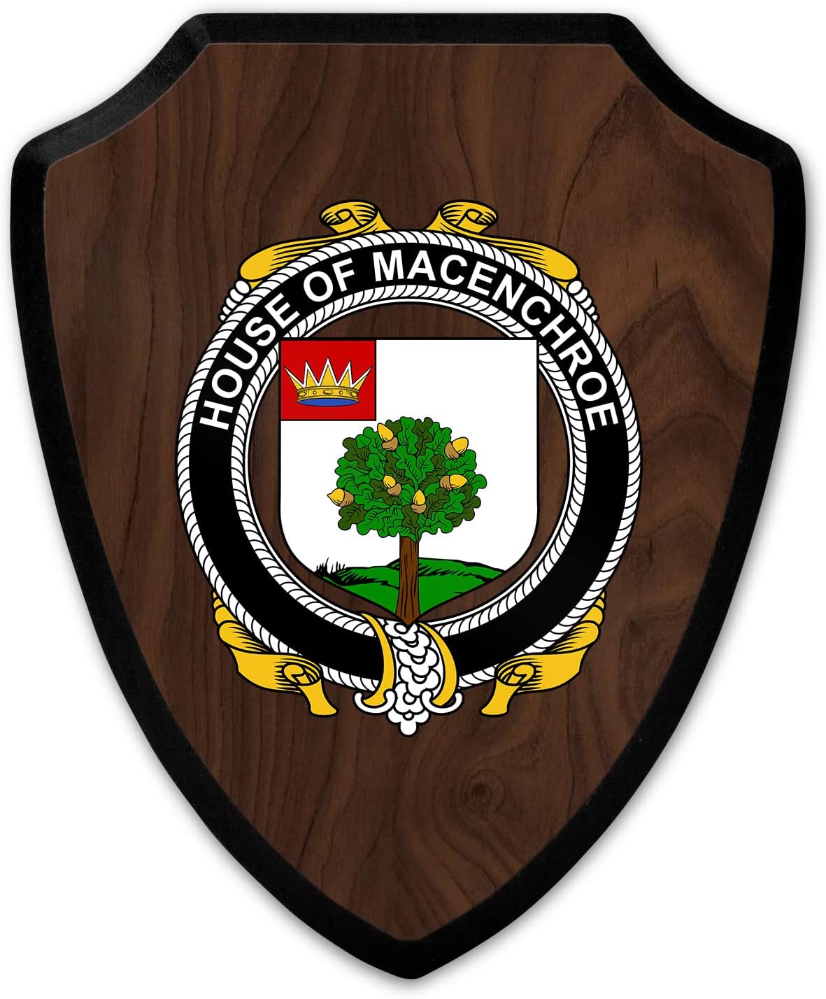 This beautifully crafted shield-shaped plaque is the perfect way to display your family crest. Measuring 7.75 inches wide by 9.125 inches tall, this plaque is the ideal size to be displayed on a wall, door or any other place of your choice. The plaque is sublimated, meaning the image of your family crest is infused into the surface of the plaque, ensuring the design will not fade or peel over time. This process also allows for vibrant and long-lasting colors that truly make your crest stand out. With its smooth edges and high-quality finish, this plaque is sure to be a treasured family heirloom for years to come. The back of the plaque has an inset hole which enables easy hanging, giving you flexibility in where to showcase it. Whether you choose to display it in your home, office, or give it as a gift, this sublimated shield-shaped plaque is a stunning way to celebrate your family heritage.