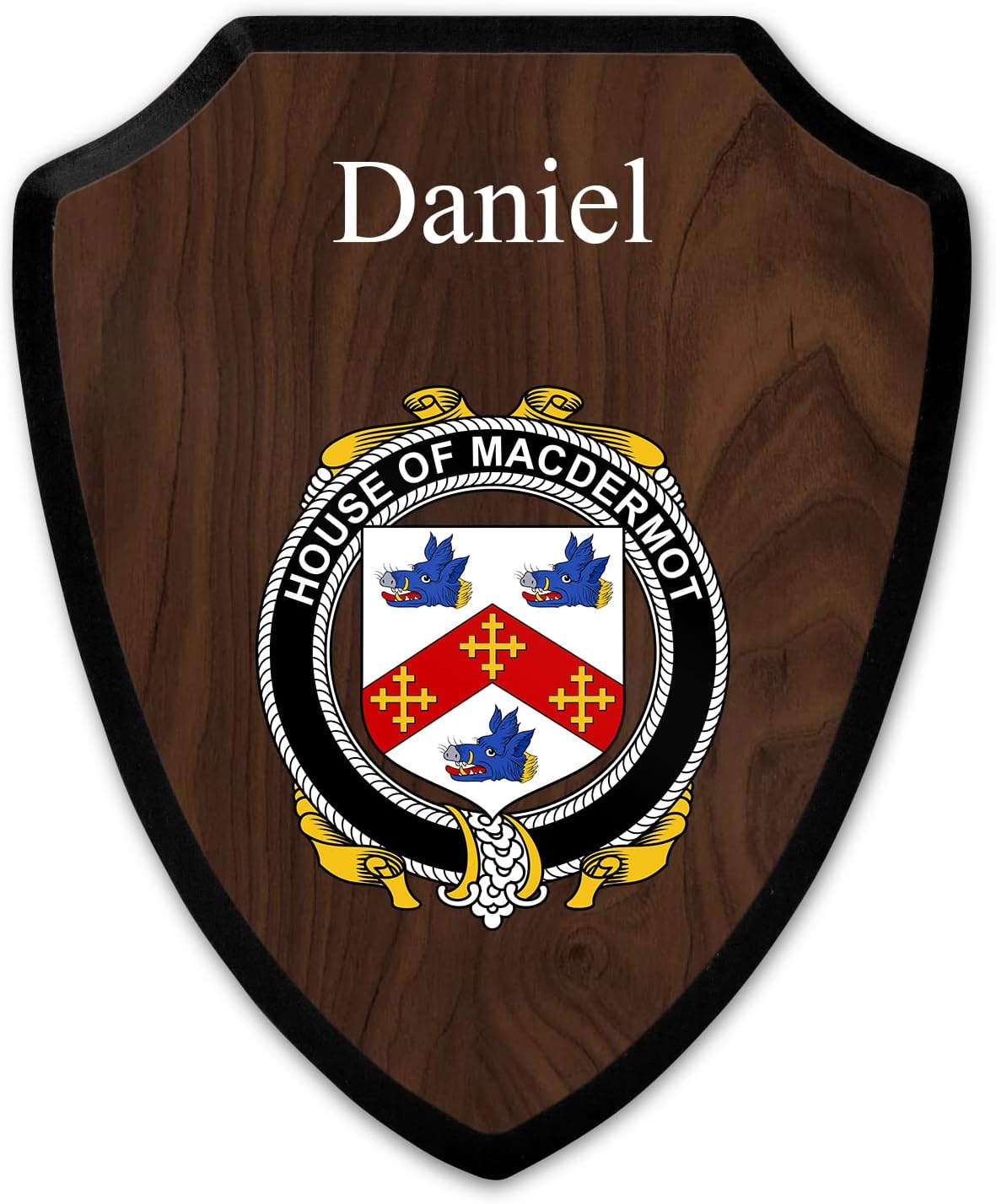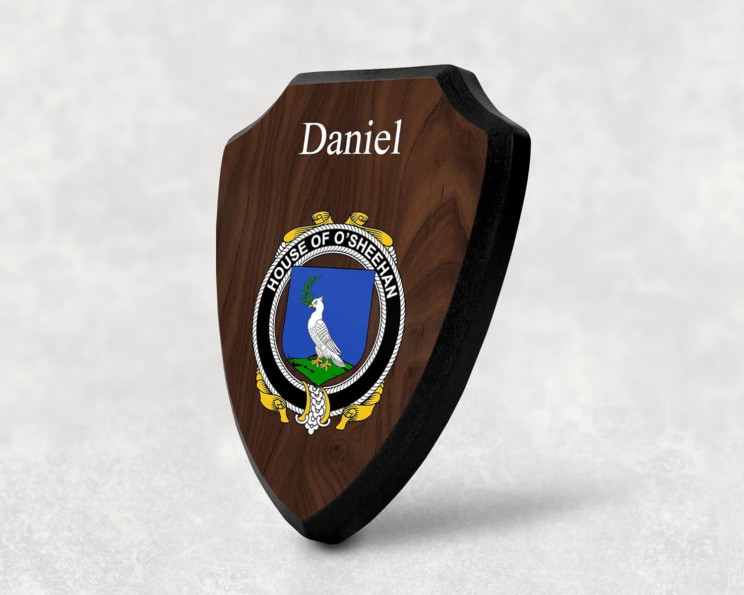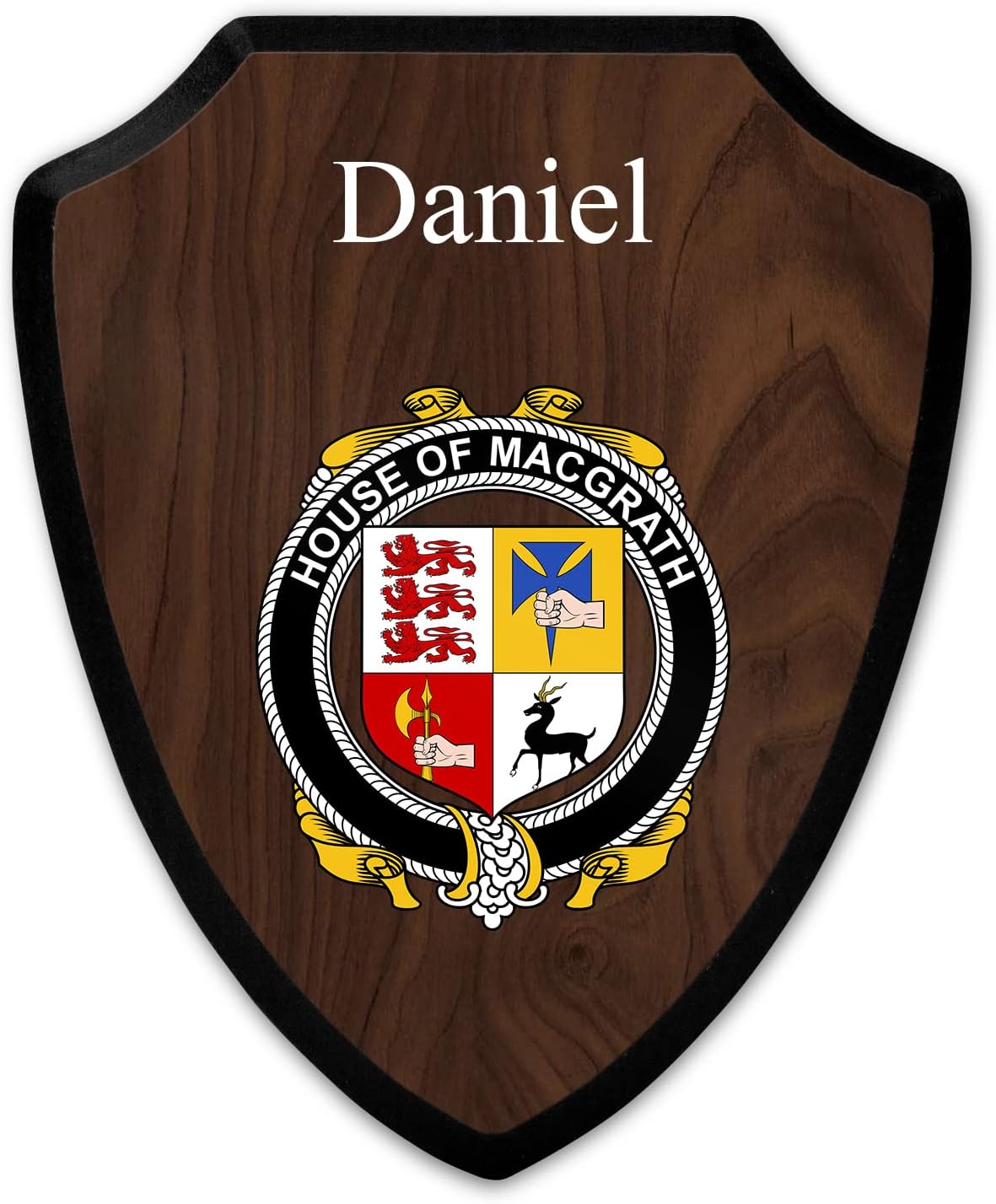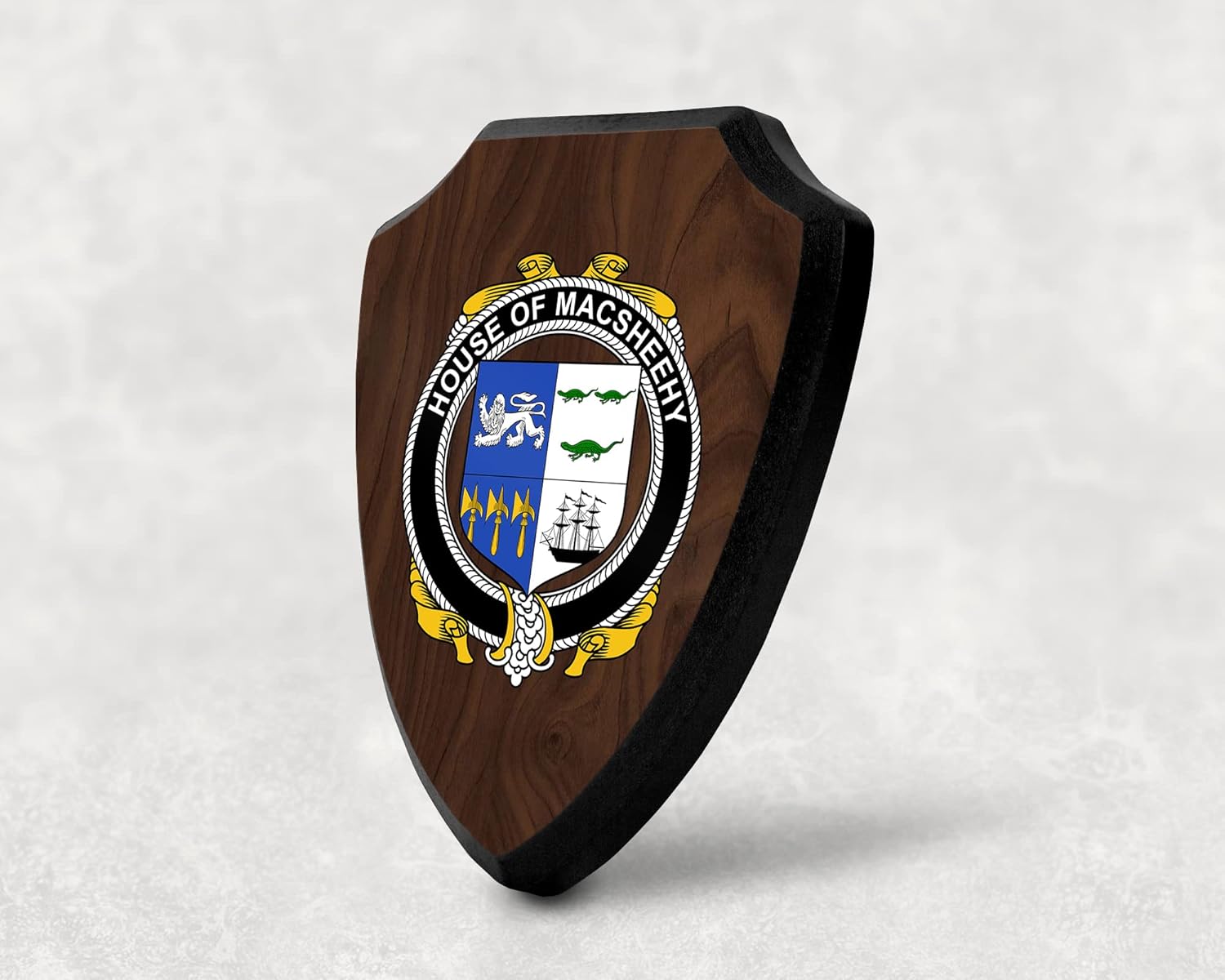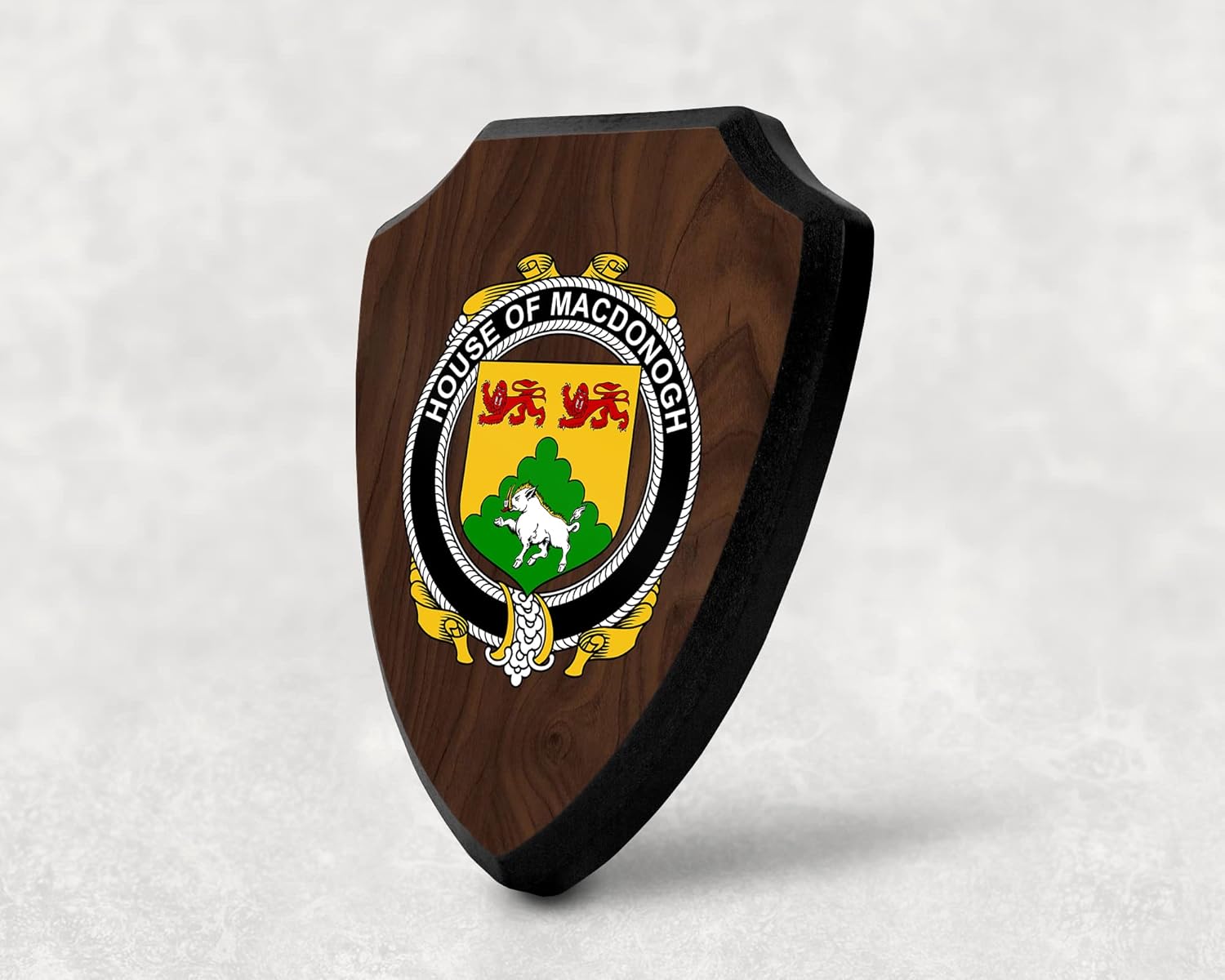 This beautifully crafted shield-shaped plaque is the perfect way to display your family crest. Measuring 7.75 inches wide by 9.125 inches tall, this plaque is the ideal size to be displayed on a wall, door or any other place of your choice. The plaque is sublimated, meaning the image of your family crest is infused into the surface of the plaque, ensuring the design will not fade or peel over time. This process also allows for vibrant and long-lasting colors that truly make your crest stand out. With its smooth edges and high-quality finish, this plaque is sure to be a treasured family heirloom for years to come. The back of the plaque has an inset hole which enables easy hanging, giving you flexibility in where to showcase it. Whether you choose to display it in your home, office, or give it as a gift, this sublimated shield-shaped plaque is a stunning way to celebrate your family heritage.