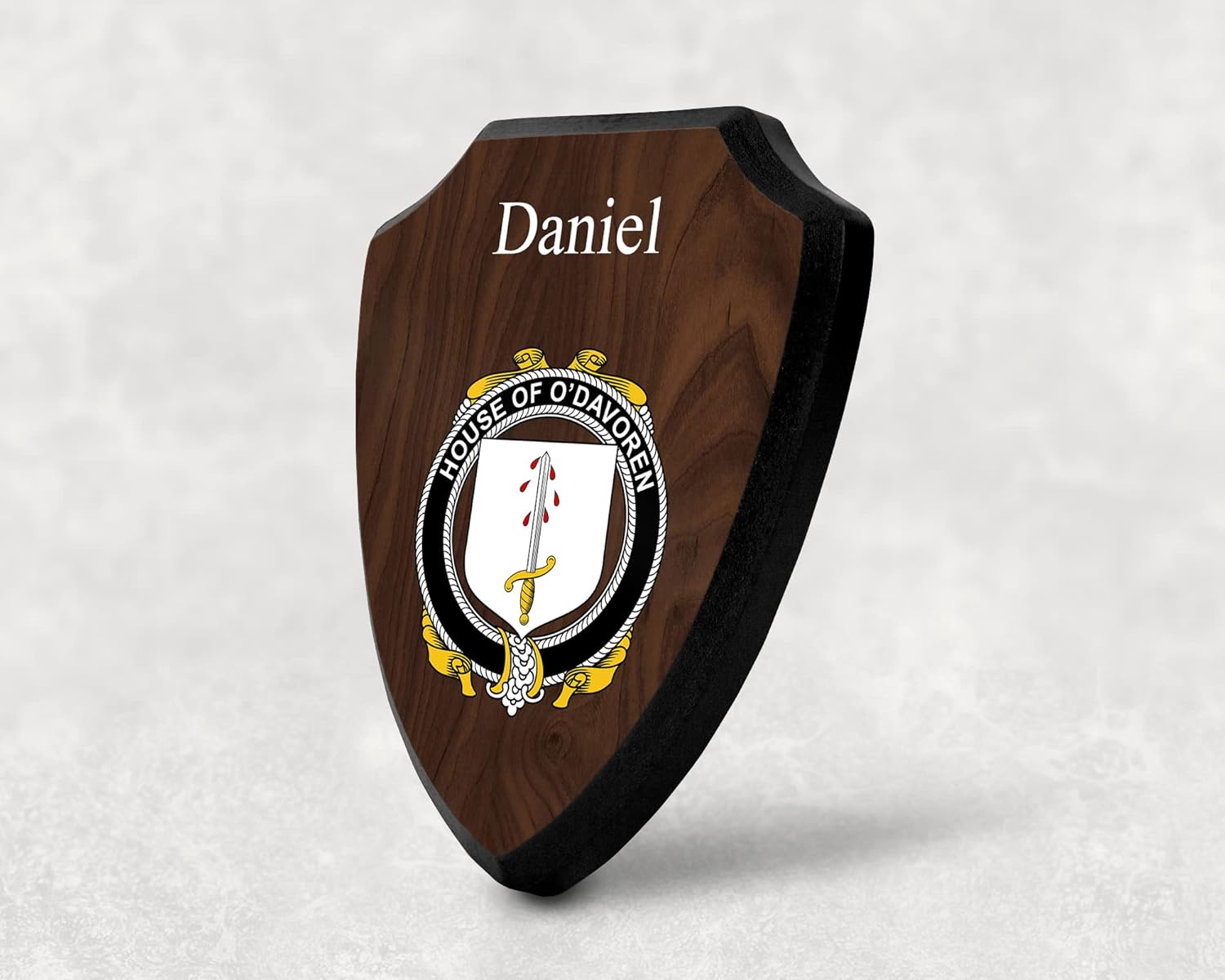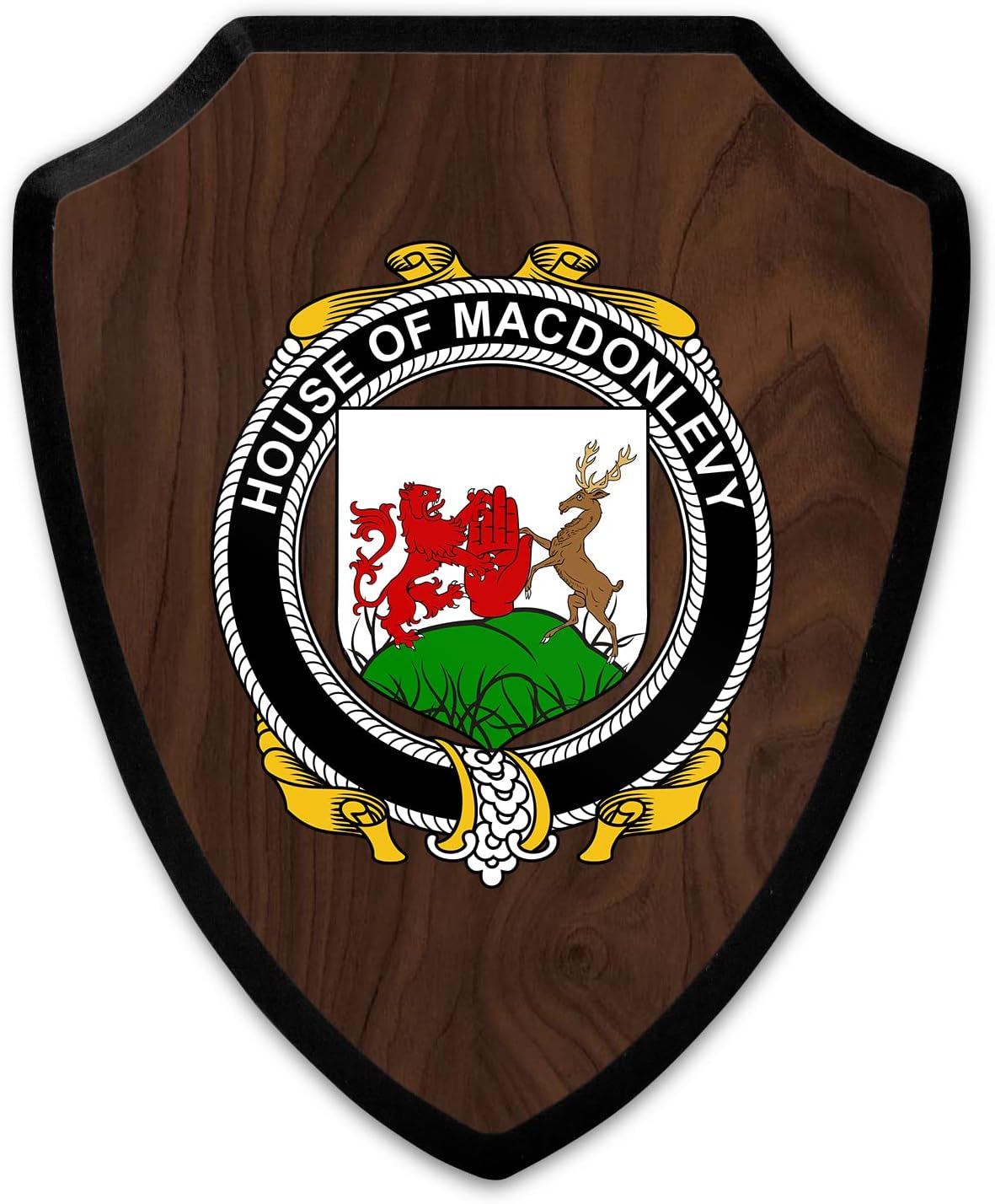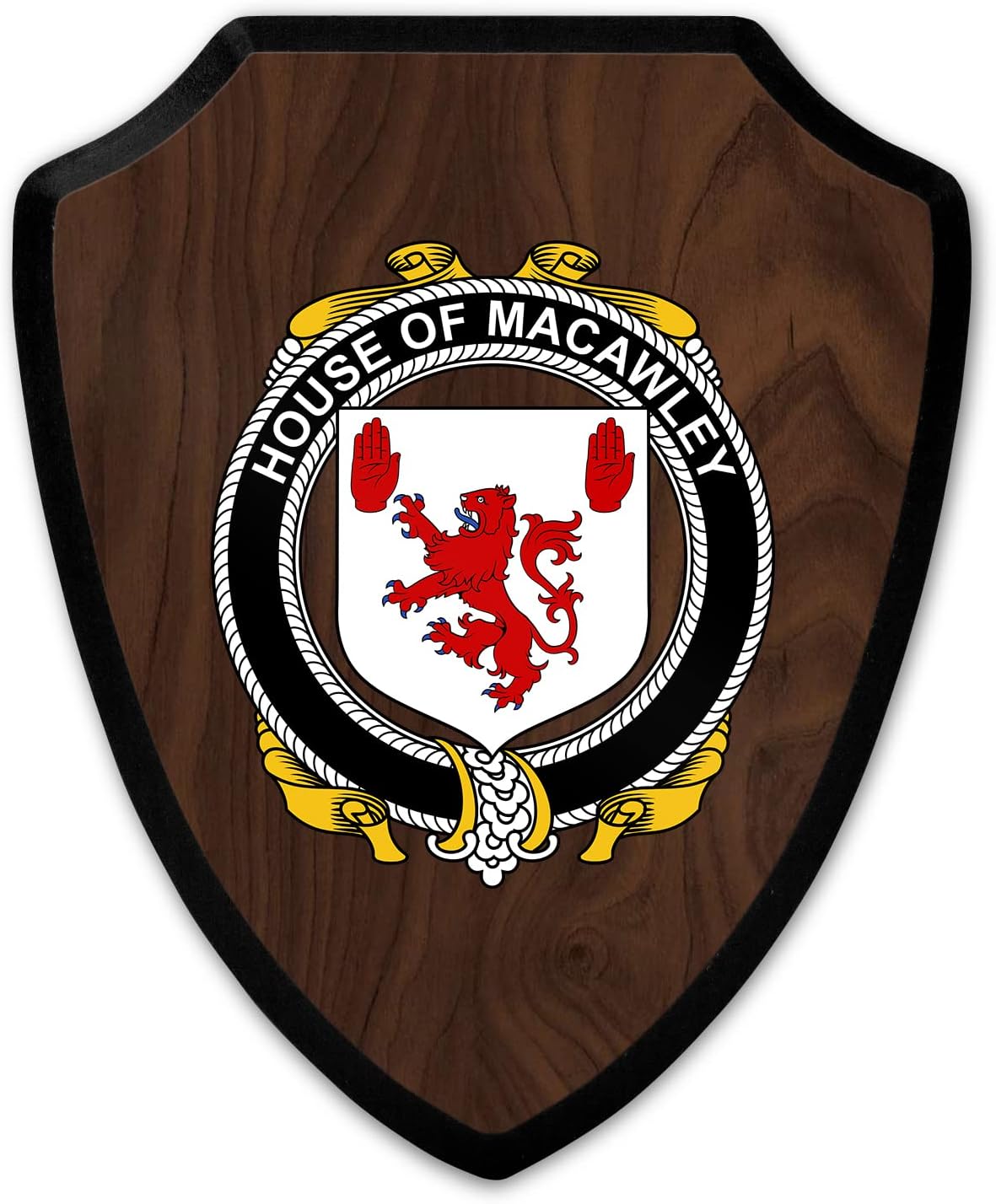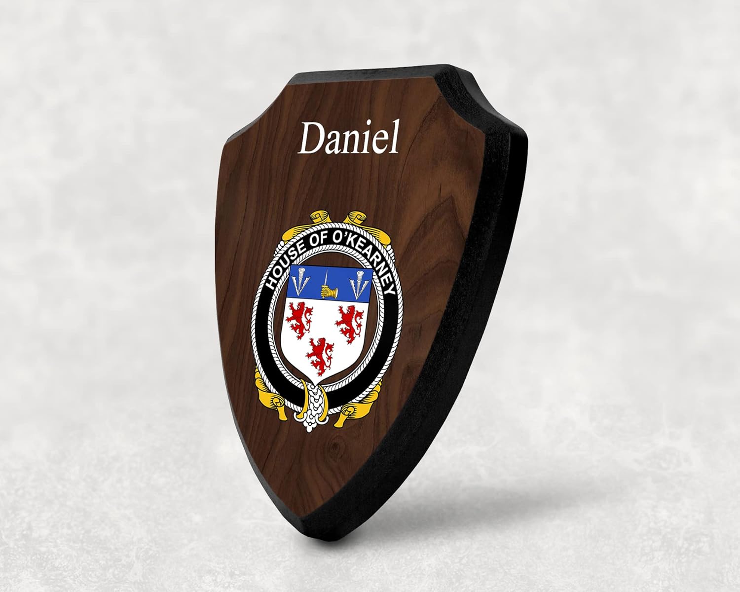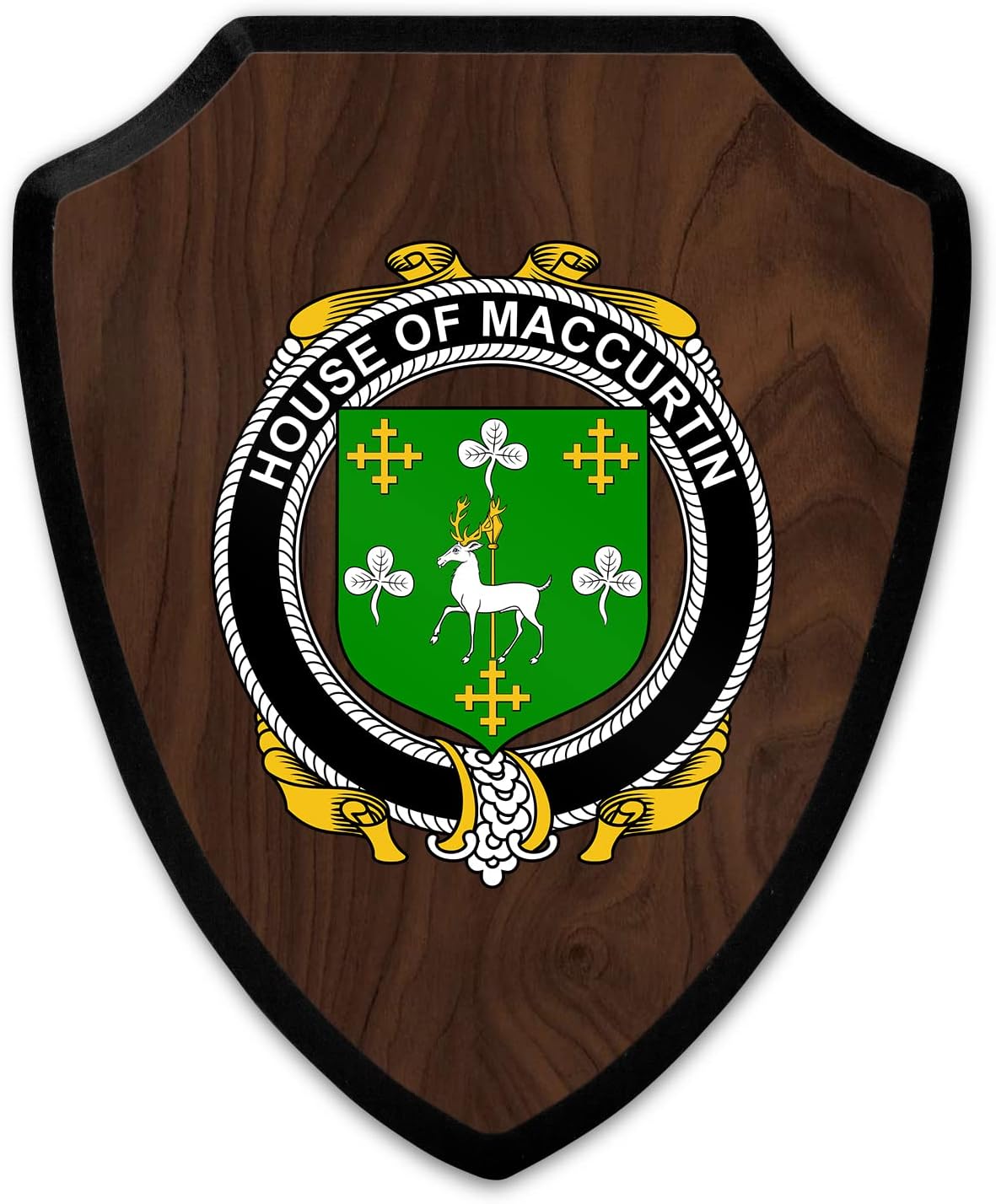This beautifully crafted shield-shaped plaque is the perfect way to display your family crest. Measuring 7.75 inches wide by 9.125 inches tall, this plaque is the ideal size to be displayed on a wall, door or any other place of your choice. The plaque is sublimated, meaning the image of your family crest is infused into the surface of the plaque, ensuring the design will not fade or peel over time. This process also allows for vibrant and long-lasting colors that truly make your crest stand out. With its smooth edges and high-quality finish, this plaque is sure to be a treasured family heirloom for years to come. The back of the plaque has an inset hole which enables easy hanging, giving you flexibility in where to showcase it. Whether you choose to display it in your home, office, or give it as a gift, this sublimated shield-shaped plaque is a stunning way to celebrate your family heritage.