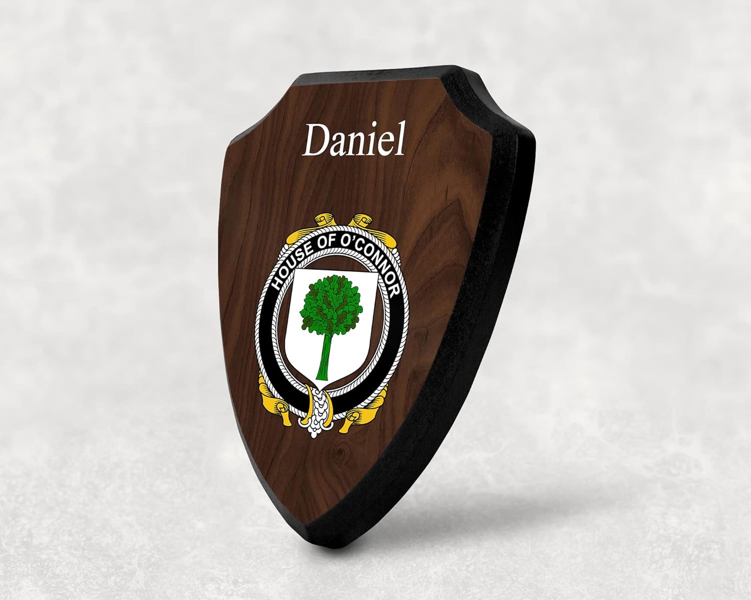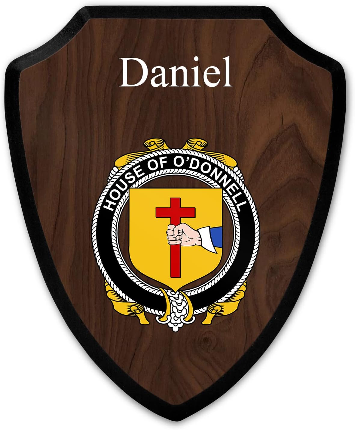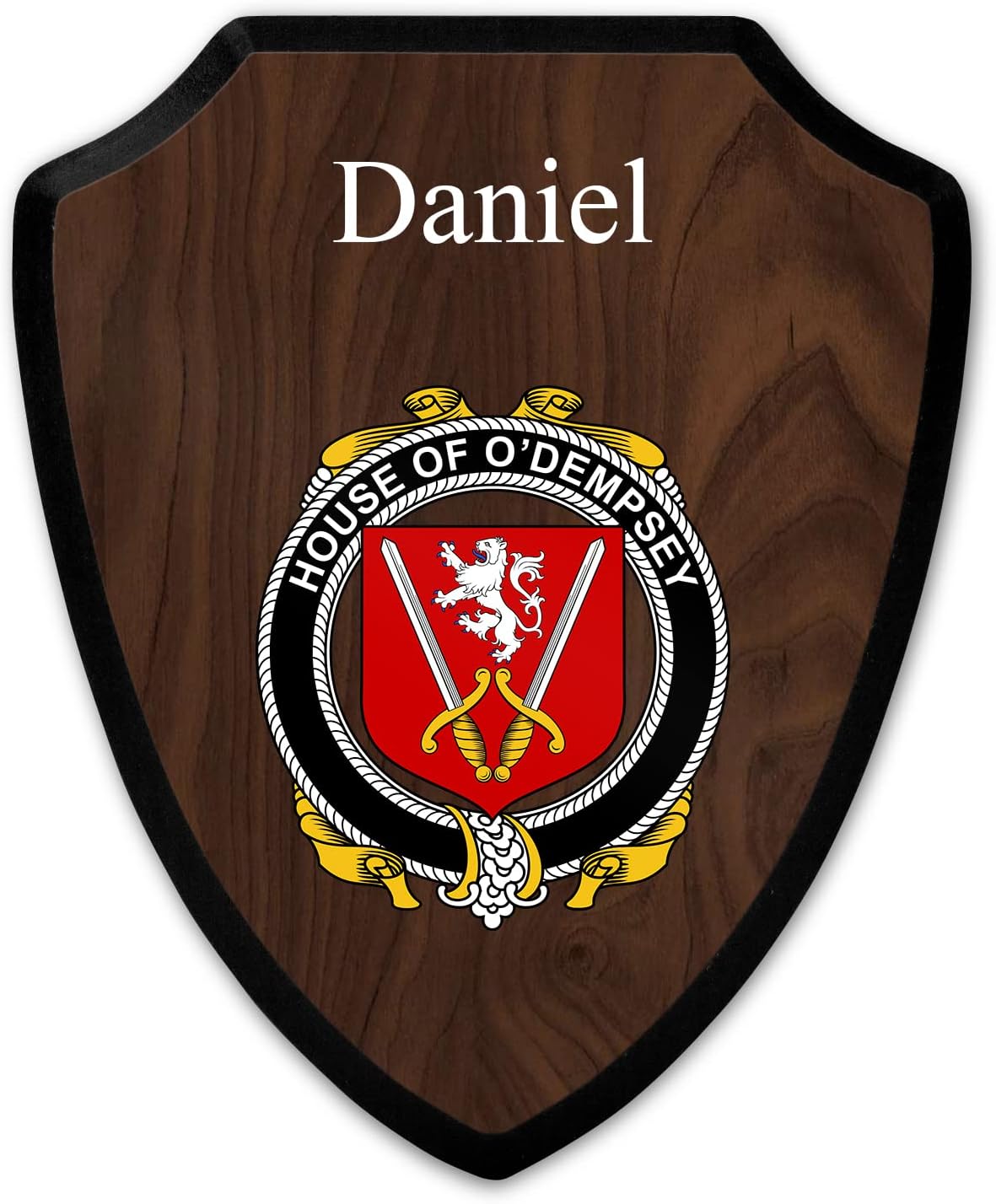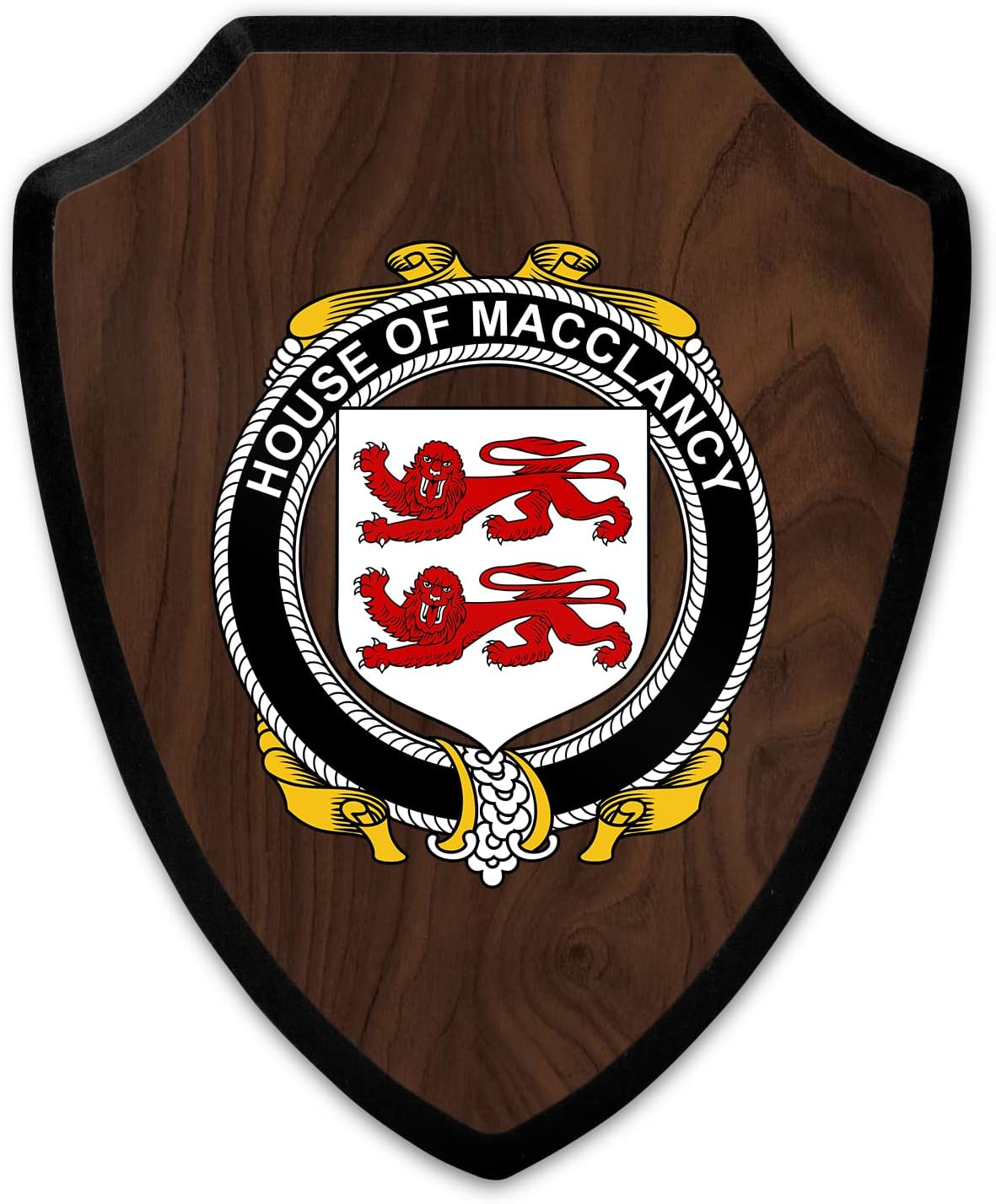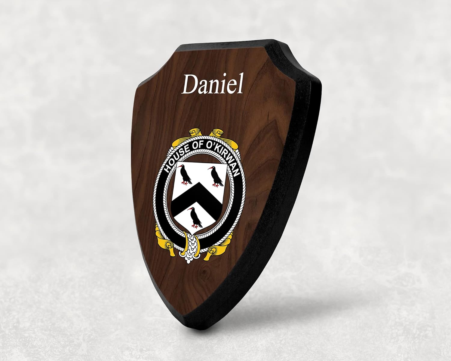 This beautifully crafted shield-shaped plaque is the perfect way to display your family crest. Measuring 7.75 inches wide by 9.125 inches tall, this plaque is the ideal size to be displayed on a wall, door or any other place of your choice. The plaque is sublimated, meaning the image of your family crest is infused into the surface of the plaque, ensuring the design will not fade or peel over time. This process also allows for vibrant and long-lasting colors that truly make your crest stand out. With its smooth edges and high-quality finish, this plaque is sure to be a treasured family heirloom for years to come. The back of the plaque has an inset hole which enables easy hanging, giving you flexibility in where to showcase it. Whether you choose to display it in your home, office, or give it as a gift, this sublimated shield-shaped plaque is a stunning way to celebrate your family heritage.