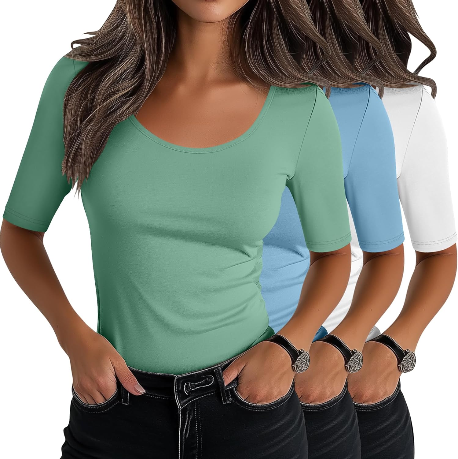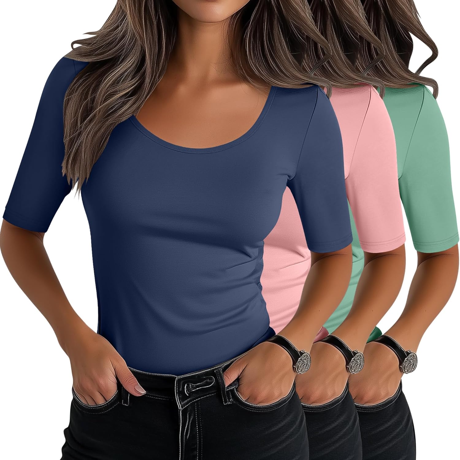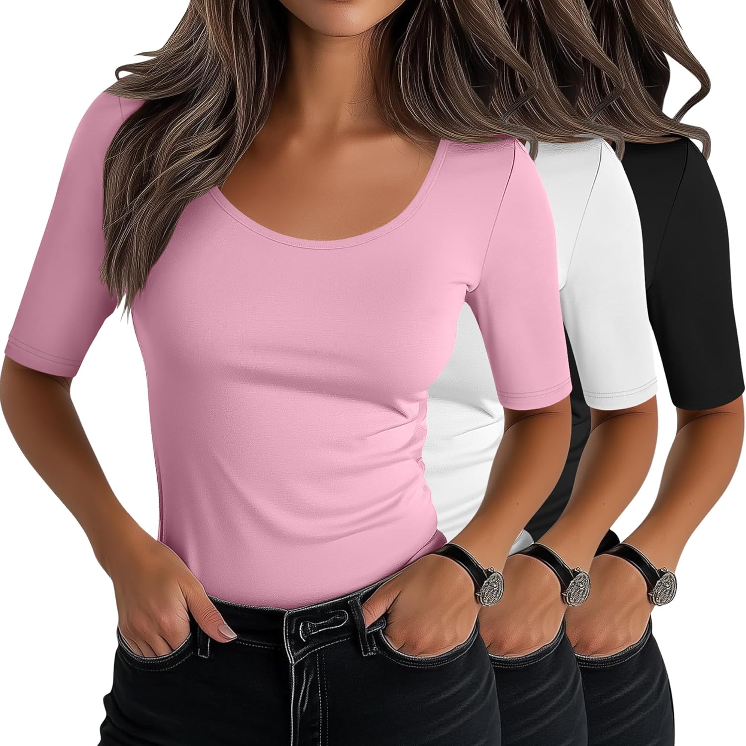 Occasion: The women's tops are designed with a solid color set, with a simple and fashionable style. Suitable for home, office, work, party, date, dinner, evening party, going out, vacation, shopping, going out, daily life and general wear Detail: The scoop neck tops for women are hip-length and have a comfortable, slim fit. Whether worn alone or layered, it can achieve the desired look. Whether you pair it with a delicate necklace or let your skin show naturally, it can exude a elegant temperament Care Tips: This women's shirt can be machine washed or hand washed. It will not deform, fade, or pill after washing. It can still maintain good elasticity. You can wash it separately from other dark clothes to avoid color transfer. Just pay attention to daily care Material: 65%Cotton, 30% Polyester, 5% Spandex Quantity: 3 Pcs Size: S, M, L, XL, XXL Season: Spring, Summer, Fall Remarks: Manual measurement, please allow slight errors in size. Colors may vary slightly due to different screen displays