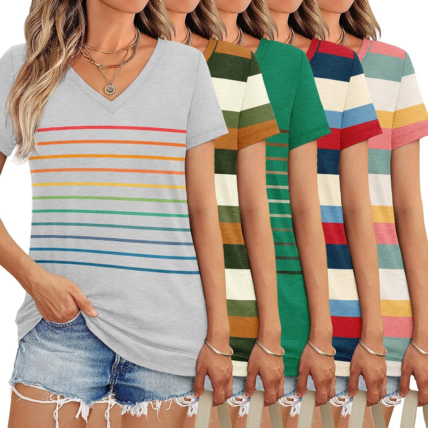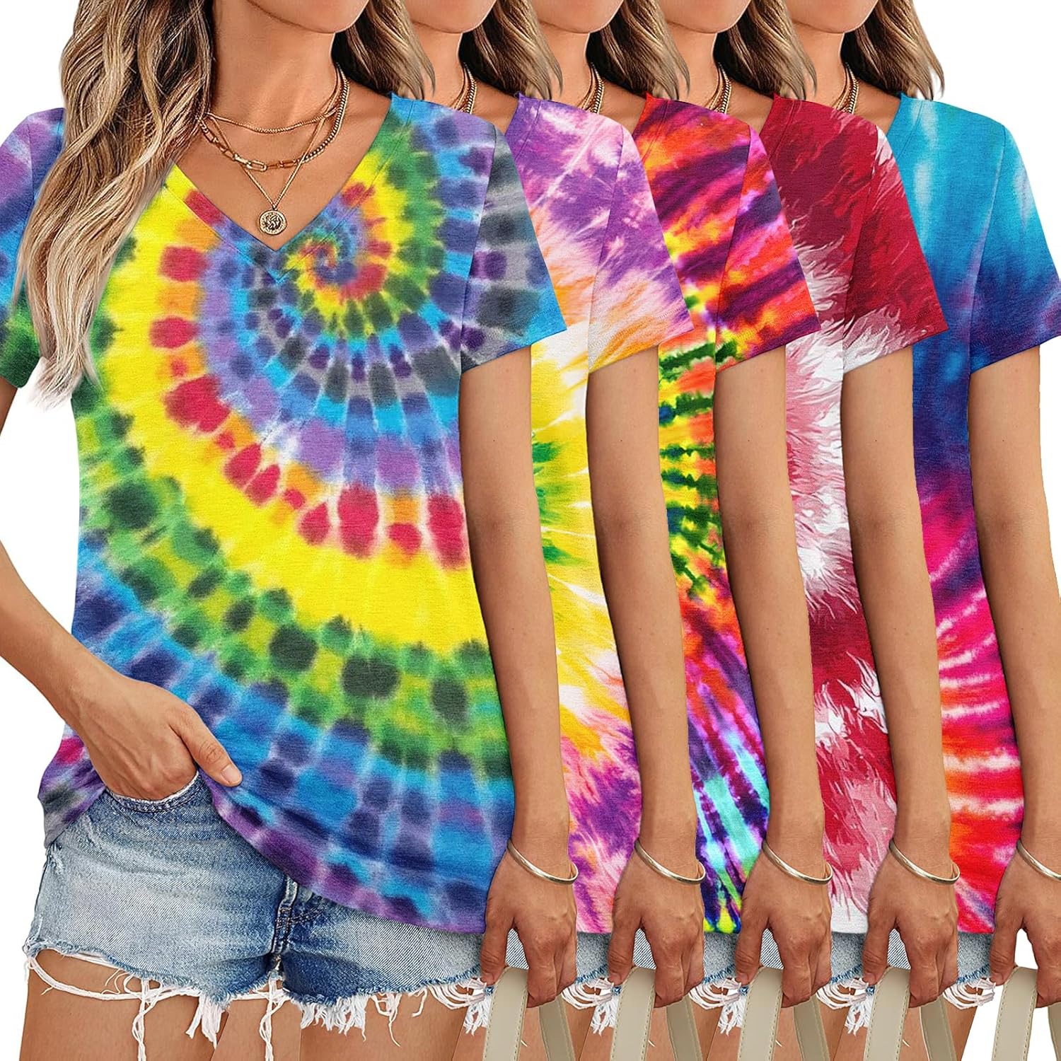 Product Details & Care: ★Fabric: 100% Polyester (Lightweight) ★Style: 5 Pack Women’s Short Sleeve V Neck Tops (Trendy: Stripe/Tie-Dye/Solid) ★Fit: Classic Fit ★Care: Machine/Hand Washable; Do Not Bleach ★Package Includes: 5 x Women’s Short Sleeve V Neck Tops ★Notes: Manual measurement, please allow slight errors on size The color may exist a slight difference due to different screen displays Please do not wash our products with other clothes, and bleaching is not allowed