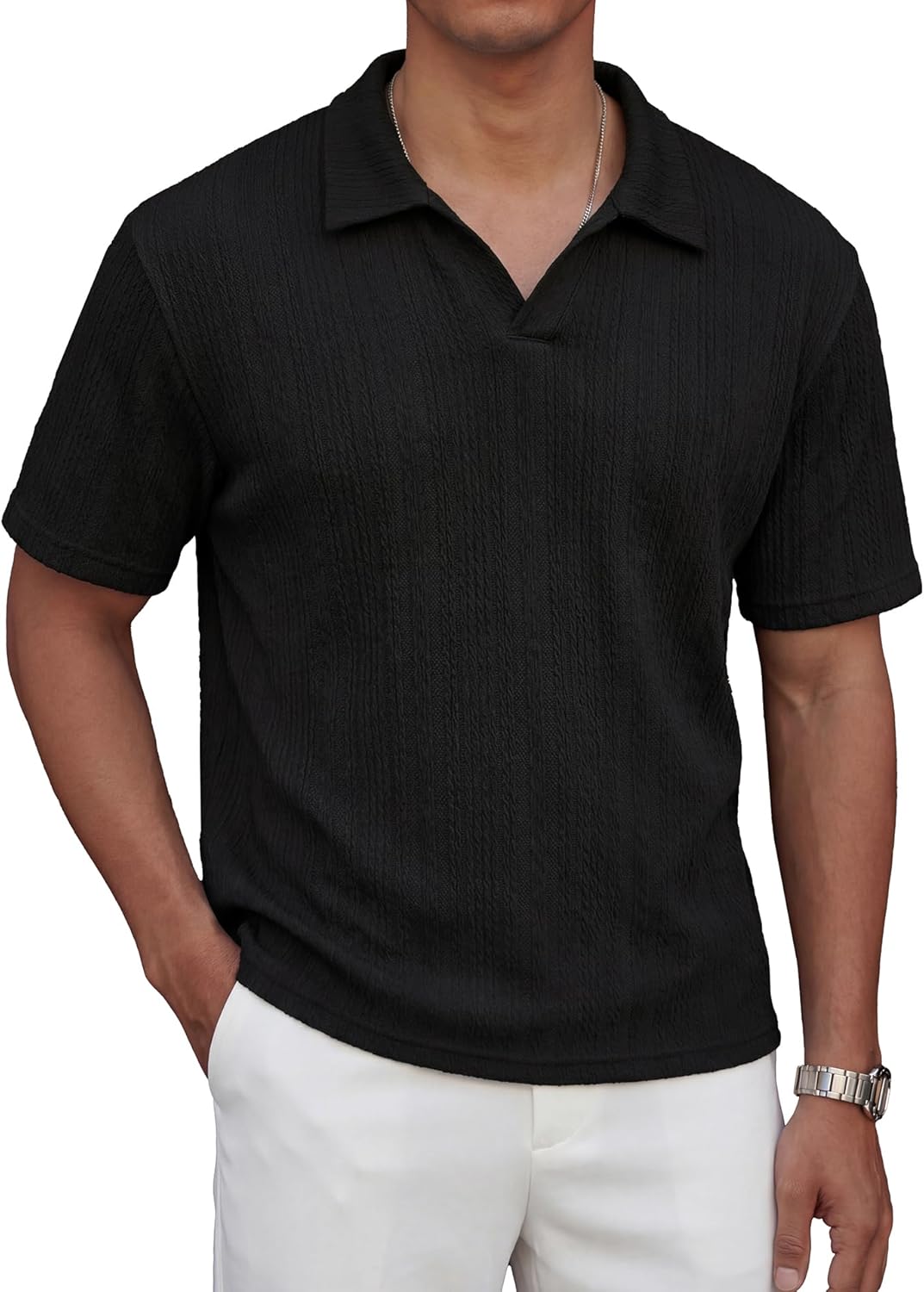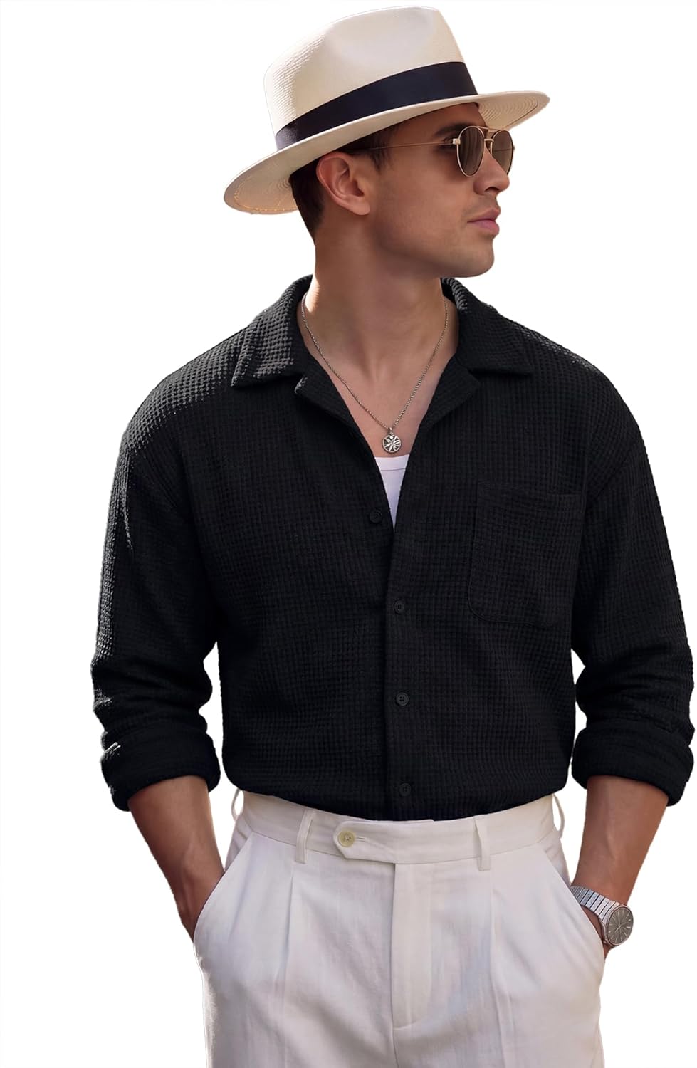 This men's button down shirt combines the classic style of Old Money with the distinctive design of the Cuban Collar for an understated elegance with a casual twist. The trendy shirt is made from a textured fabric that enhances the overall texture and dimension. It is both a shirt and a jacket, and can be worn as a shirt jacket, with a chest pocket to add practicality. The overall look is simple and uncomplicated, showing a mature and introverted fashion taste