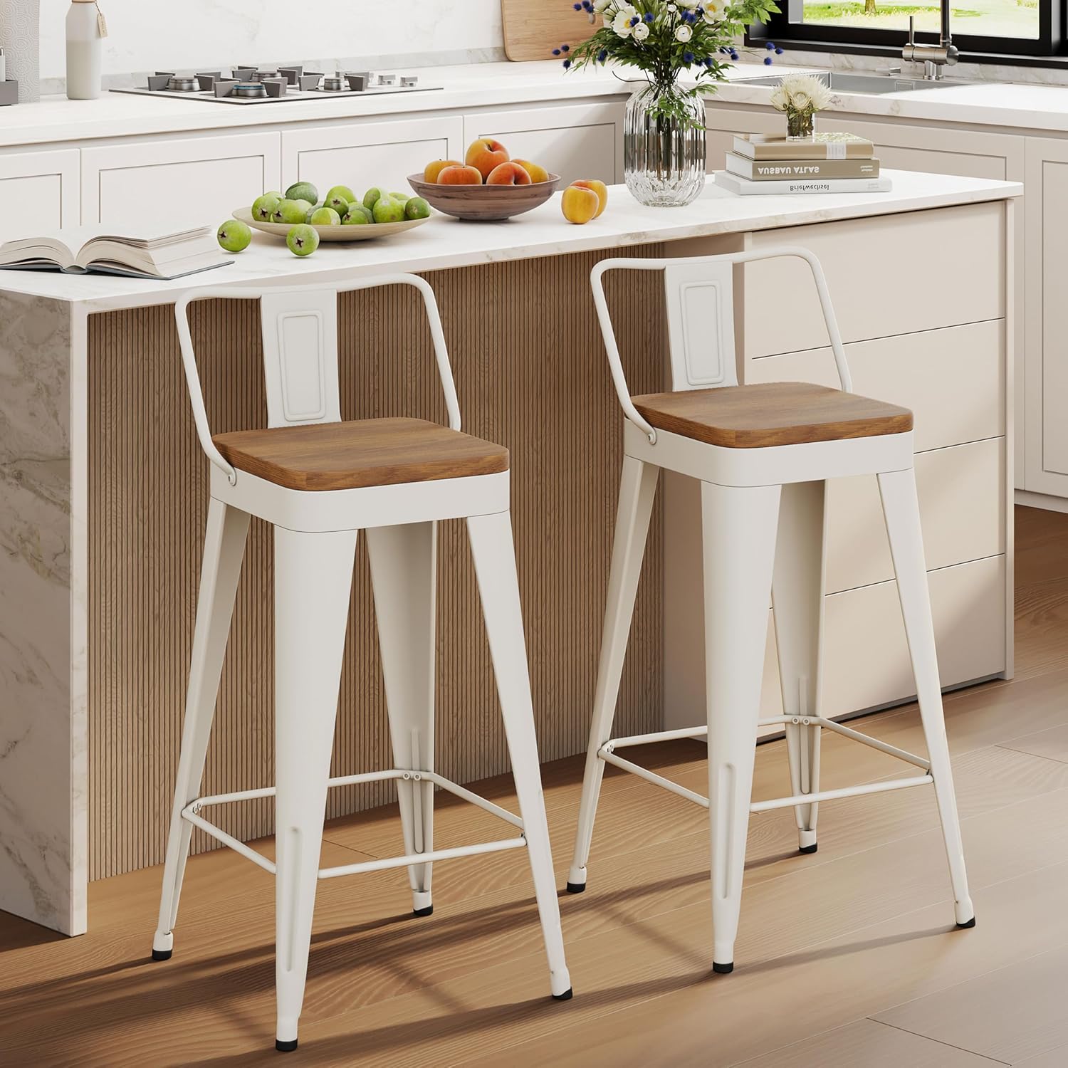 Bar Stools Set of 4 Metal Bar Stool Counter Height Bar Stools 26" White, Modern Bar Chairs with Back and Wooden Seat Bar Stools Counter Height