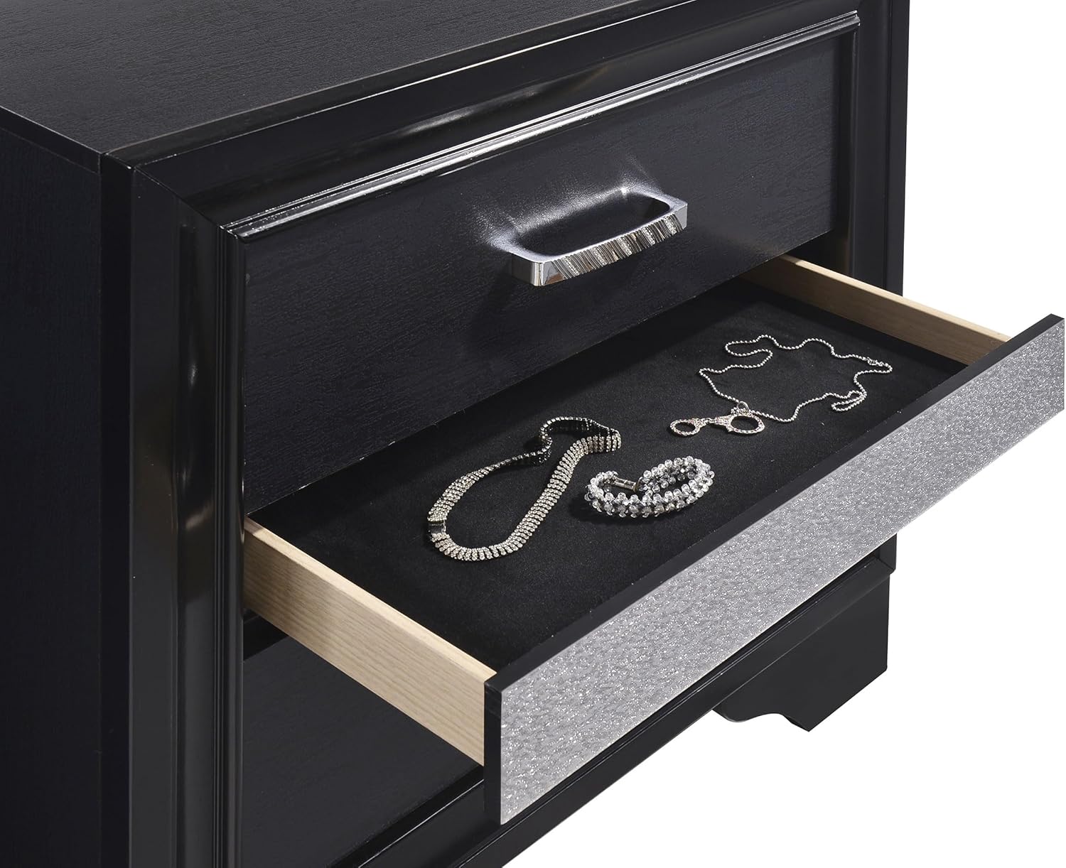 Brighten up your bedroom with this charming, four-piece set. With a bed, dresser, mirror, and nightstand all included, it instantly completes your space. A striking, one-color finish gives it a fresh, updated look. Hidden jewelry drawers in each case piece are a pleasingly convenient touch. The drawers are constructed with full extension glides for versatile ease of use. Dimensions: California King Storage Bed Dimensions: 79.25 inches wide x 88.75 inches deep x 50.25 inches highNightstand Dimensions: 26 inches wide x 16.5 inches deep x 26 inches highDresser Dimensions: 63 inches wide x 16.5 inches deep x 38.75 inches highDresser Mirror Dimensions: 46.5 inches wide x 1.25 inches deep x 36.5 inches high