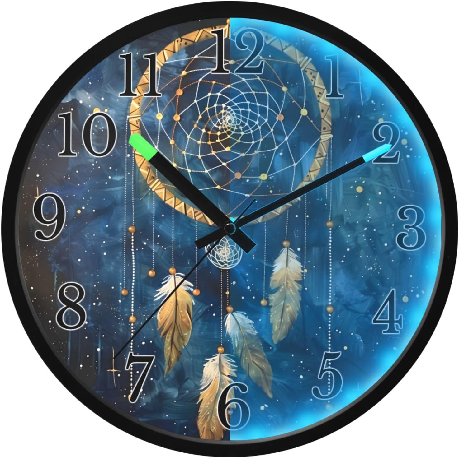 Glow in The Dark Wall Clocks Battery Operated LED Wall Clock for Bedroom Night Glow 12 Inch Silent Wall Clocks for Living Room Decor Material: Acrylic + PP + Modified polystyrene Diameter: 12 inches/ 30.5cm Power Source: 5 x AA battery(not included) Movement: Silent Quartz Movement Package Includes: 1 Piece x Wall Clock MODERN LED LUMINOUS WALL CLOCK The Night Light Wall Clock allows you to adjust the brightness using the rollers on the back, so you can customize the brightness to your liking. Make a Sound at Night On a quiet night, this LED wall clock can be controlled by voice to turn on the LED lights for 55 seconds at a time, and the brightness can also be manually adjusted. Silent Illuminated Wall Clock On quiet night, the tips of the hands of a luminous wall clock will glow faintly. (It needs to absorb light energy to emit light; it does not require batteries.) Silent: Quiet sweep second hand, no"TICK TOCK" to ensure a good sleeping or working environment. Easy To UseEasy to hang on the wall or displayed on the table Vivid Color, clear to read, battery operated wall clock Occasion: Any room wall and living room, bedroom, office, restaurant, cafe, kitchen, bar or hotel decoration Smart Gift: A perfect choice for housewarming gifts, birthday present, bridal gift, anniversary gift, mothers day gift, fathers day gift, holiday gift etc.