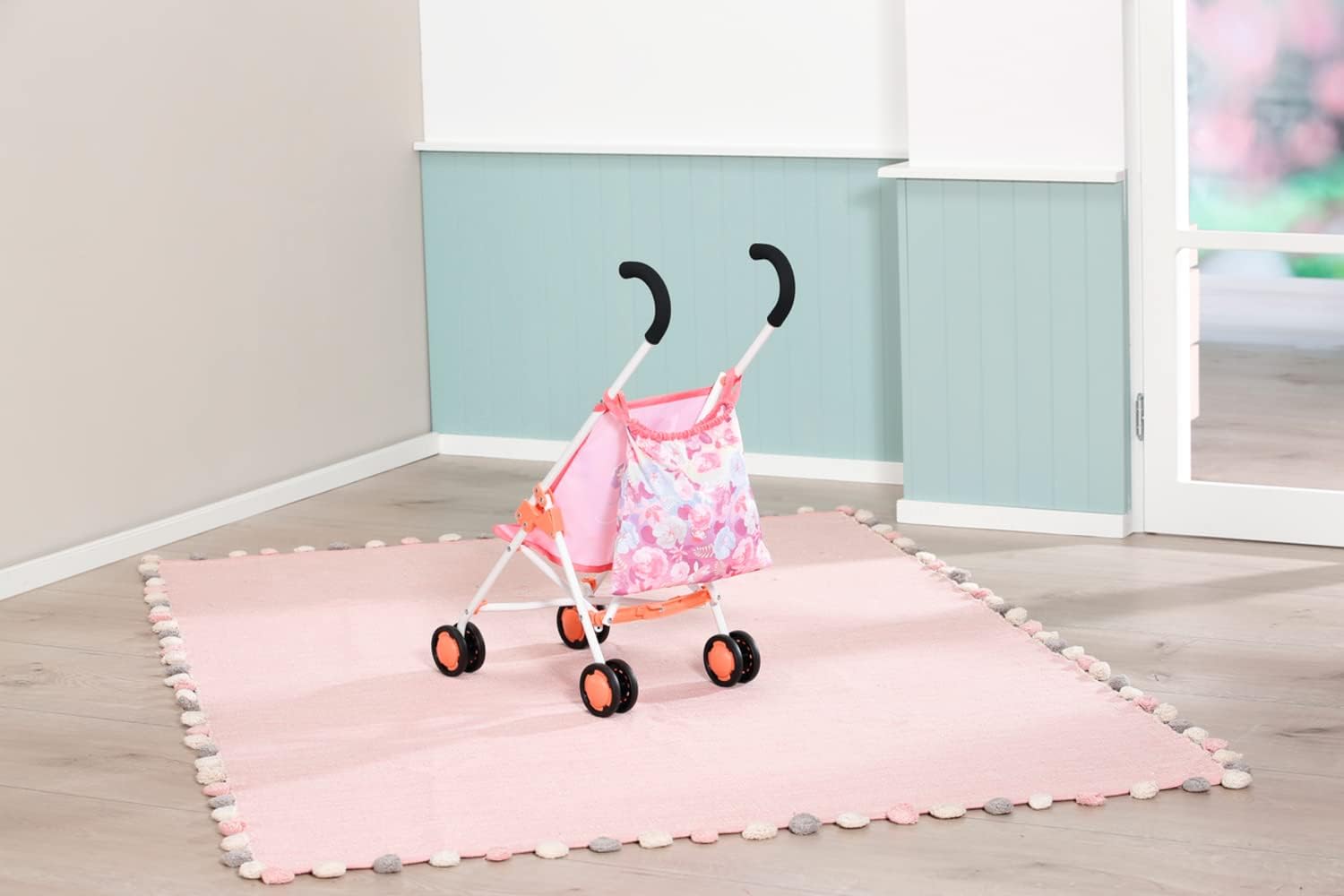 Small folding buggy for travel. 707470 ITEM-NO. 36 + 43 cm DOLL SIZE 3+ years AGE In the mornings, granny and grandpa love to take Baby Annabell to the park. They usually take the sporty stroller, in which Baby Annabell can see everything and wave to people as she passes. At the pond, they always watch the frogs jumping from one water lily to the next. The water lilies are also seen on the stroller’s fabric. Wonderfully light and agile, the stroller can even manage a few steps. Whatever happens, Baby Annabell is strapped securely into her seat. On the way back, they often stop at the baker’s. The pastries are safely tucked away in the net behind the seat. Back at home, the practical stroller can be folded up and stored in a cupboard to save space. Original accessories for the Baby Annabell branded doll. The premium-quality accessories boost the imagination and offer new possibilities and stimuli for play. Handle height: 62 cm. Baby Annabell Active Stroller with net.