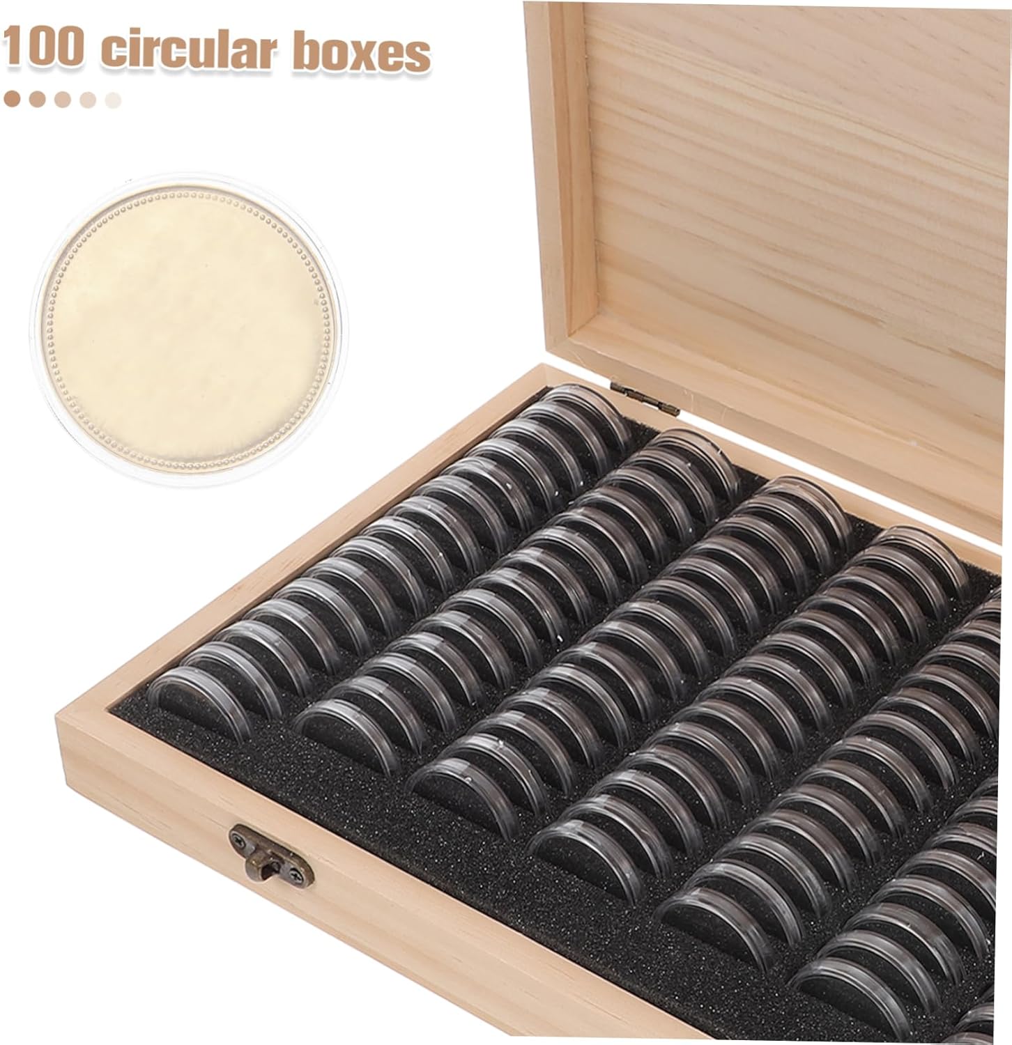 Package Include plastic boxes adjustment coin pads 1 coin box Features -Organized storage: with the capacity to hold 100 capsules, this keeps your collection wellorganized and easily accessible coin storage organizer -Userfriendly design: the bronze hardware lock and crescent opening make it easy to open and close the coin case, offering convenient access to your collection coin protector -Natural material: the coin display box is made from natural wood,ensuring storage environment for your coins coin collection storage -Aesthetic appeal: the elegant wood grain and intricate carvings add a touch of sophistication to the coin storage box, making it a beautiful display piece coin collecting supplies -Color:Multi silver rounds -Size:29.00X20.00X5.00cm/11.40X7.86X1.97in coin boxes for collectors -Fit: the adjustable eva rings are designed to of various sizes, providing a secure and fit that prevents movement and damage coin collectors supplies -Material:Plastic, wood, EVA, copper storage caseGoods Descriptionorganizer storage Keep your coin collection safe and organized with our wooden commemorative coin storage box.coin protector With its sleek design and robust build, this coin case is both a functional and attractive addition to any collection.storage tube This display storage solution is Ideal for showcasing your most treasured coins, whether they are challenge coins, silver rounds, or other pieces.coin case The coin holder compartments are designed to accommodate various coin sizes, making it easy to your storage