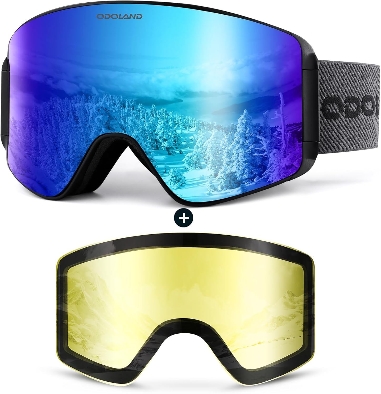 Description The #1 Premium Ski Snowboard Goggles Dual frameless spherical lenses based on human engineering, not only offer a wonderful view in the enjoyment, but also effectively avoid accidents with anti-fog & professional ventilation functions. Featured with OTG design, the ski goggles is good for adult and youth, with or without glasses. Interchangeable Lens Design with Bonus Yellow Lens Magnetic system for best stability and change lens in seconds! with 2 interchangeable lens, you can ski in sunny, cloudy and dark night days. Bendable TPU Frame TPU frame with PC lens makes the frame can be bendable for increased safety and comfort. This makes goggles difficult to be oppressed and cause damage. Triple Layer Thickened Sponge The high-density triple layer foam around the frame has better exhaust ventilation and safely cling to face, making the skin easily emit the heat outside the lens and ensure the lens have good visual effects. Adjustable Straps Strap of the Snow Goggles is extremely elastic and adjustable to ensure helmet compatibility that fits almost all helmets. Multi-VLT Choices for All Condition Odoland offers 5+ kinds of ski goggles with different color and VLT. You can easily get the one you just need! VLT 8%-10% for sunny daysVLT 15%-18% for sunny and cloudy daysVLT 46% for cloudy and foggy days VLT 78% for dark days Specification Frame Material: TPU Lens Material: PC + CA + UV400 Lens Type: Spherical Detachable Lens: Yes Sport type: Skiing, Snowboarding, Snowmobiling, Ice climbing, Alpine Skiing, Ice Skating, Skydiving, Cross-Country Skiing, etc. Package 1 x Odoland Ski Goggles 1 x Detachable Lens 1 x Carry Bag