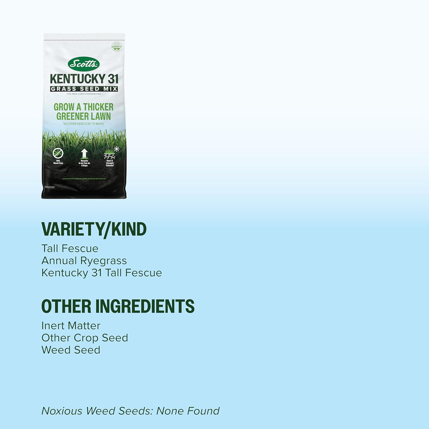 Build your lawn with Scotts Kentucky 31 Grass Seed Mix for new lawns and overseeding. This grass seed mix contains a curated blend of seeds that offer benefits beyond what Kentucky 31 alone can provide, so you can grow a thicker, greener lawn vs other Kentucky 31 mixes (see label for details). This mix includes Kentucky 31 Tall Fescue grass seed for lawns, which provides durability and less maintenance. It also contains heat- and drought-tolerant (once established) Premium Tall Fescue grass seed for dense, green cover and quick-growing Annual Ryegrass seed. With this grass seed mix, you'll see results in as few as 5 days! The ideal time for planting this grass seed mix is during the spring or fall seasons, when the average daily soil temperature stays consistently between 60°F and 75°F, or air temperature between 65°F and 85°F. We recommend using a Scotts grass seed spreader to apply this product, following recommended settings on the label. This seed mix is great for homeowners and lawn care enthusiasts who are interested in a lawn care product to start a new lawn or overseed an existing lawns. One 20 lb. bag has a new lawn coverage of 1,665 sq. ft. and an overseeding coverage of 5,000 sq. ft.