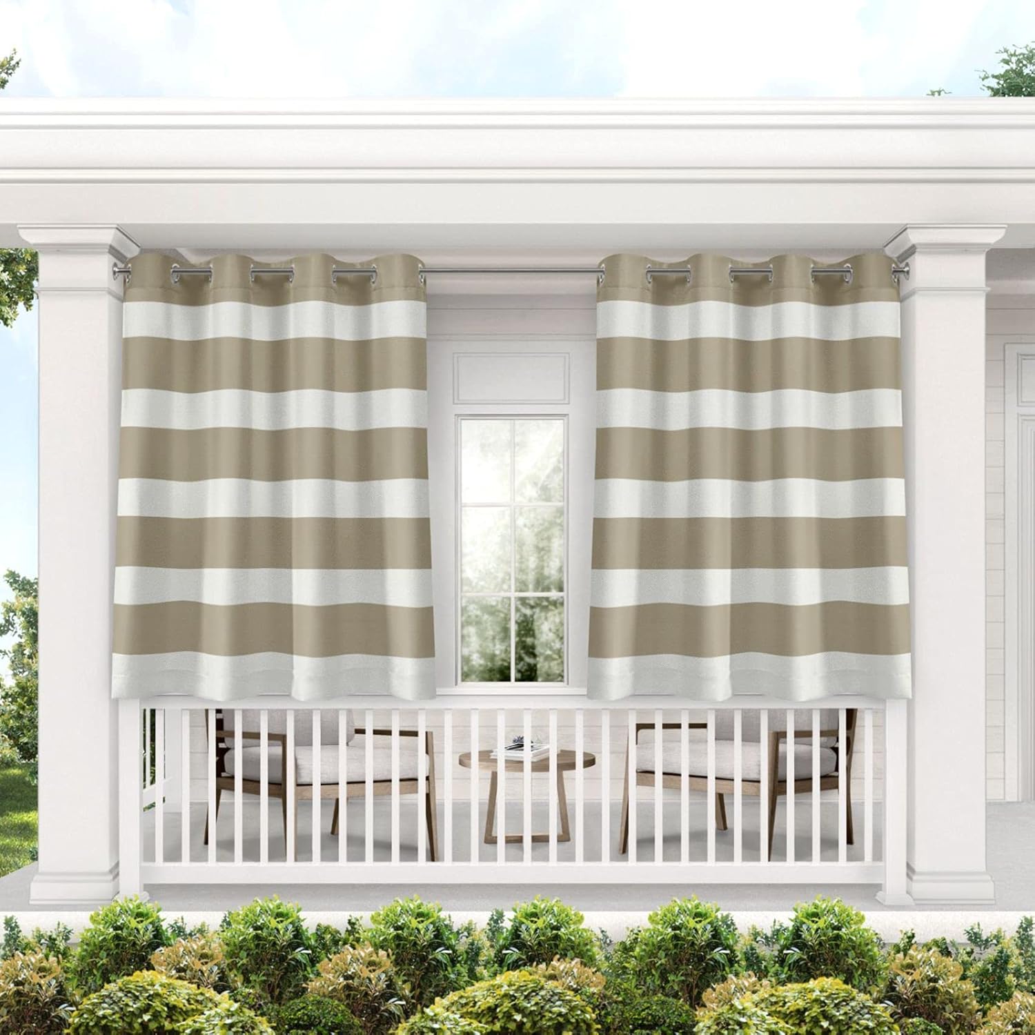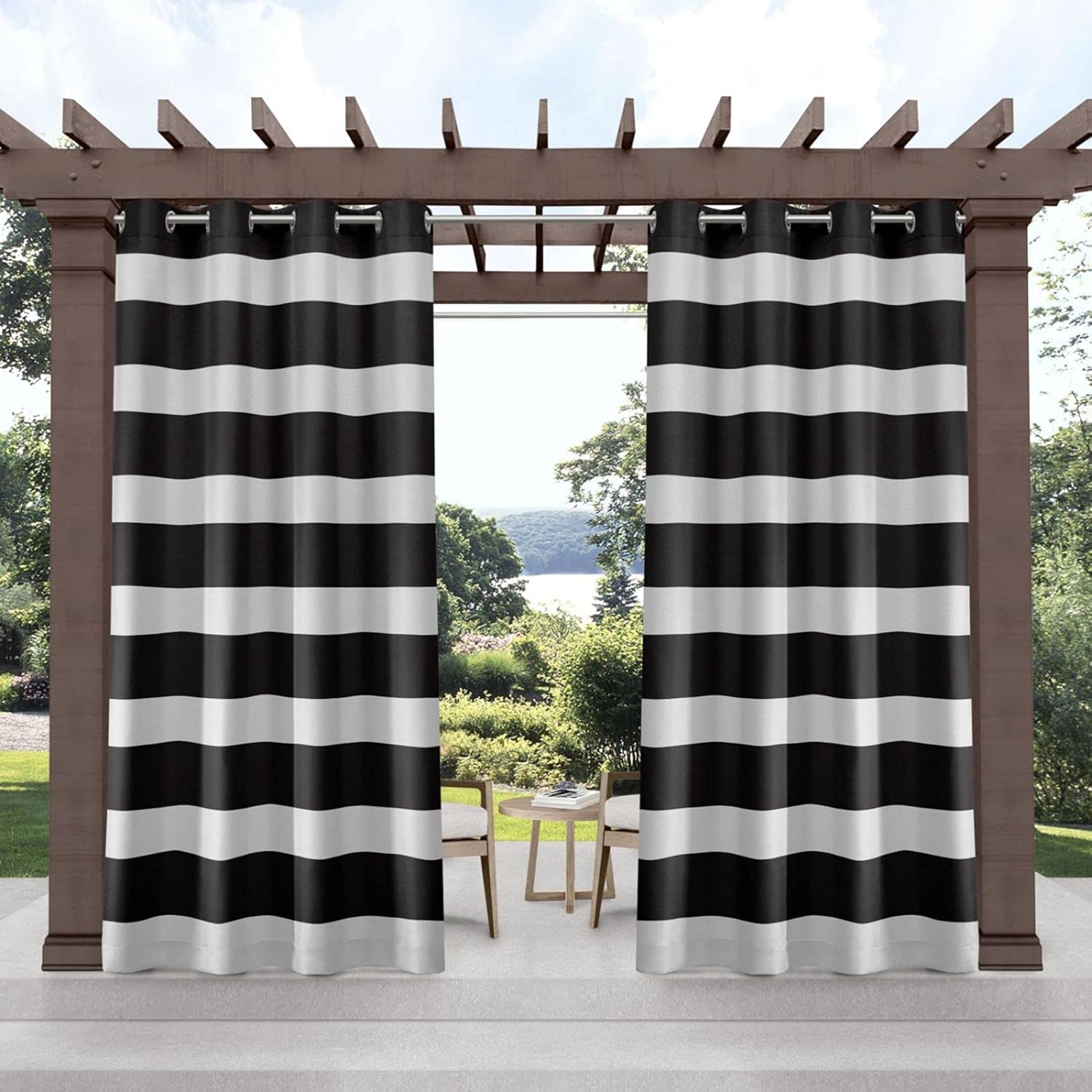 Set the mood in your outdoor living space with the Exclusive Home Cabana Stripe Indoor/Outdoor Light Filtering Grommet Top Curtain Panels. They're perfect for blocking the sun or creating more privacy. These polyester panels offer a heavy-duty, canvas-like feel, a UV-ray protectant, and are water resistant. The simple yet stately, polished look makes them a gorgeous addition to any outdoor extension of your home. Hang them using your favorite rod up to 1.25" diameter. Hand wash only.
