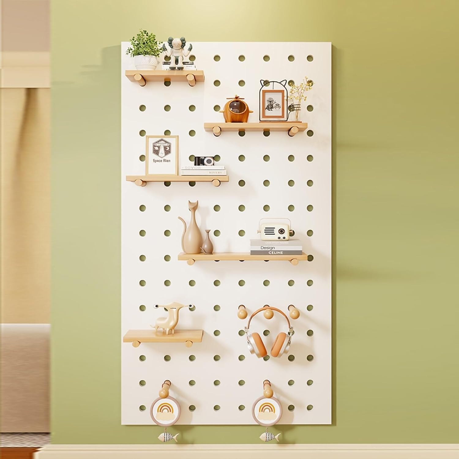 Name: Bedroom Pegboards Material: Wood Colours: Green , Natural , White Dimensions: 40x60cm , 60x80cm , 60x120cm Installation: Provide simple installation tools and installation manuals PRODUCT LIST: Pegboard Wall Organizer x 1PCS