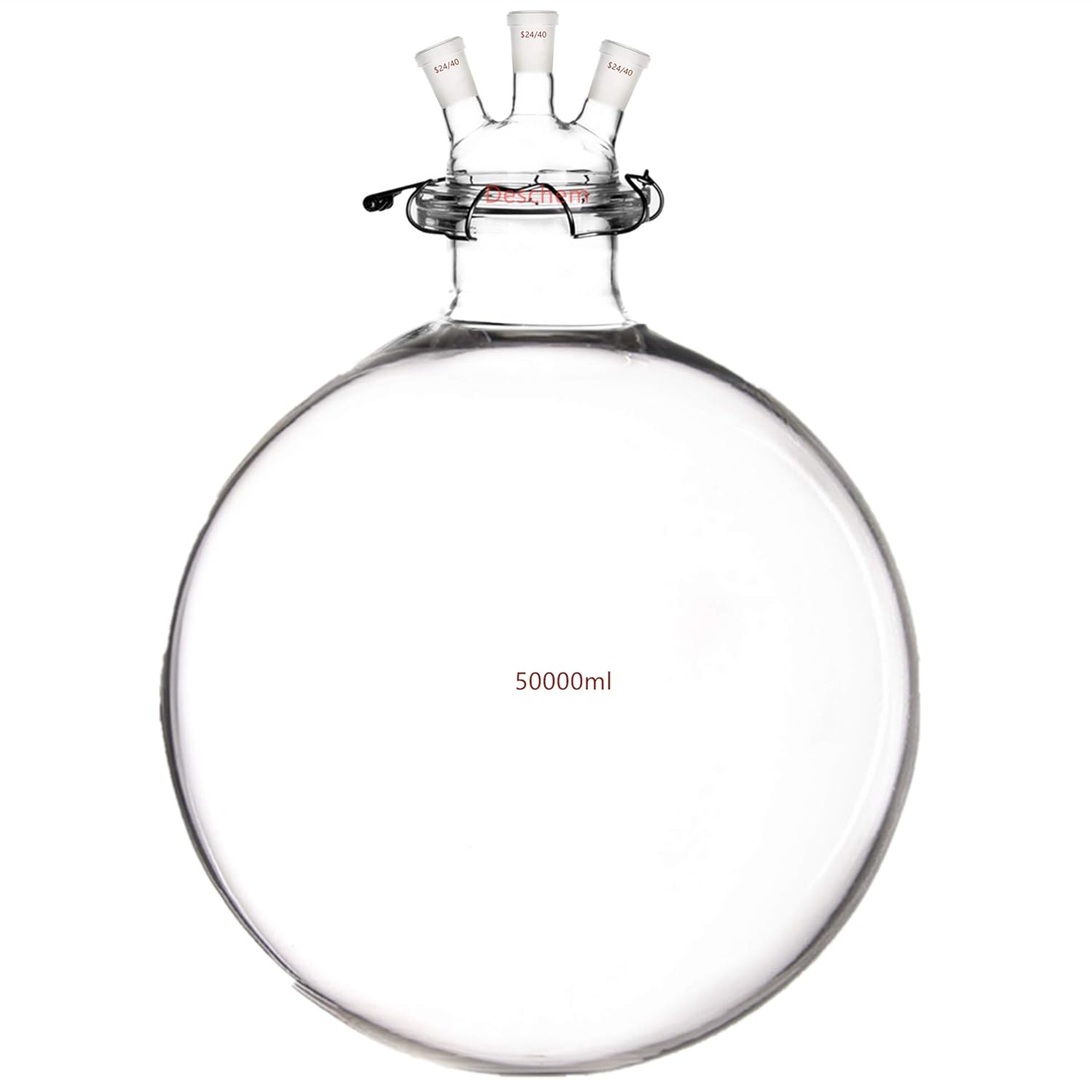 Deschem 24/40 Glass Reactor Three Necks Round Bottom Lab Reaction Flask Vessel W/3-Neck Lid and ClampMade From Borosilicate Glass 3.3.24/40 Glass Ground Joint Capacity 250ml 500ml 1000ml 2000ml 3000ml 5000ml 10000ml 20000ml 50000ml AvailableRound BottomStainless Steel ClampOuter DIameter of The Flange is 150mm