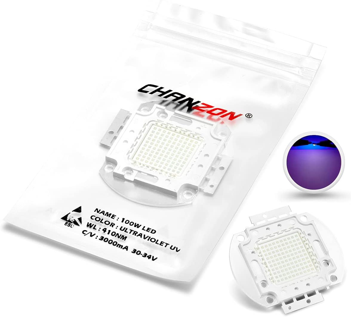 Specification:Quantity: 1 piece / PackBrand: ChanzonPower: 100W Watt (Max)Emitting Color: Ultraviolet (UV 395nm)Recommended Current: 3000mAForward Voltage: 30-34VLuminous Flux: NoEmitting Angle: 120-140 degreeWith Double Golden Wire (99.99%) and Copper FrameKindly Reminder:Constant current LED drivers are recommended for high power COB LEDs.Working temperature should be less than 60 Degrees Celsius / (140 Fahrenheit) with a Heat Sink System.Please refer to the positive (anode +) and negative (cathode -) sign on Leds.Related Accessories:Constant current LED drivers (3000mA Aluminum Case Waterproof): ? Search B01NBXZUS3 on AmazonLED Lens Kit 20-100W 44mm (60 degree): ? Search B06XKV9PWY on Amazon