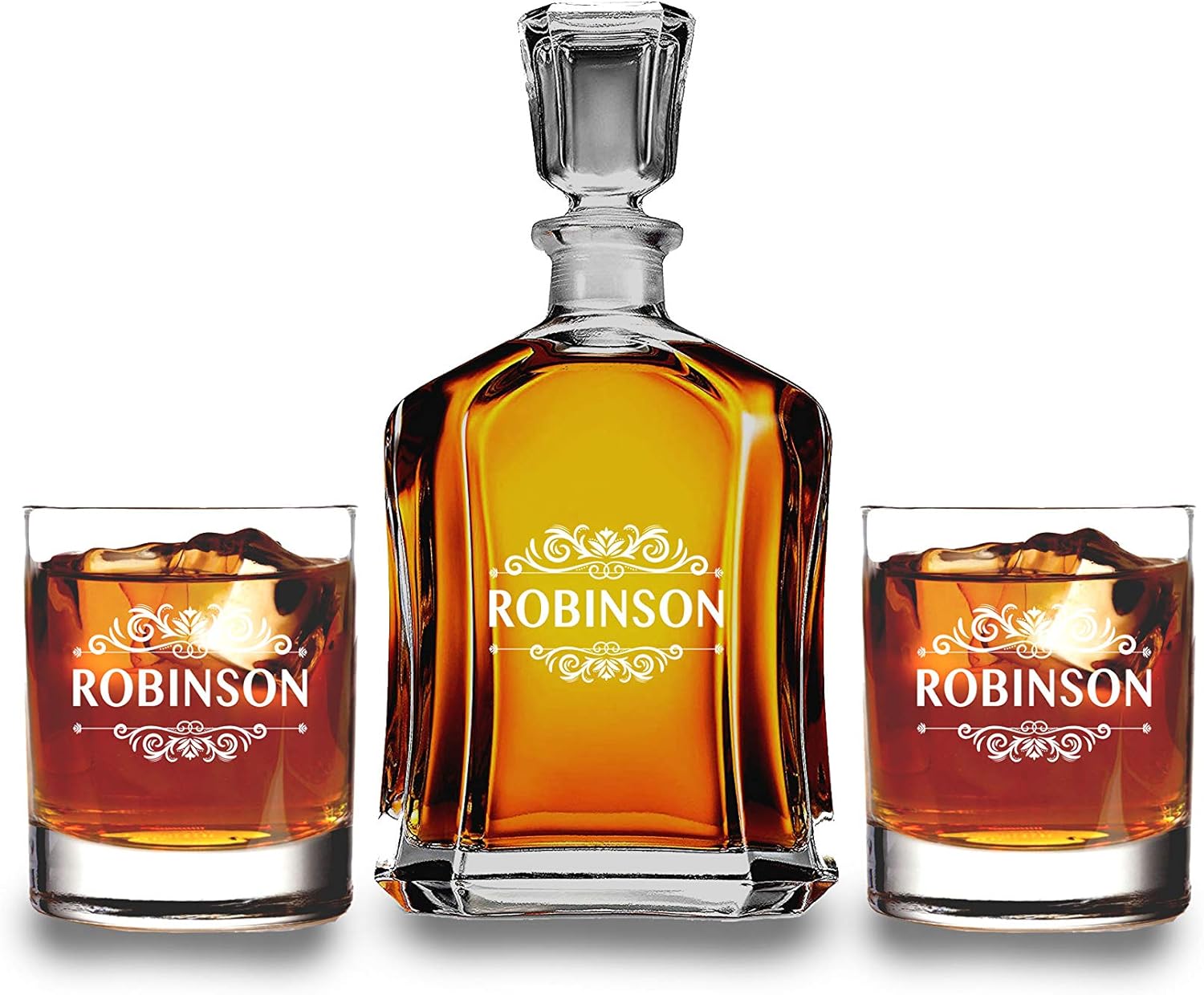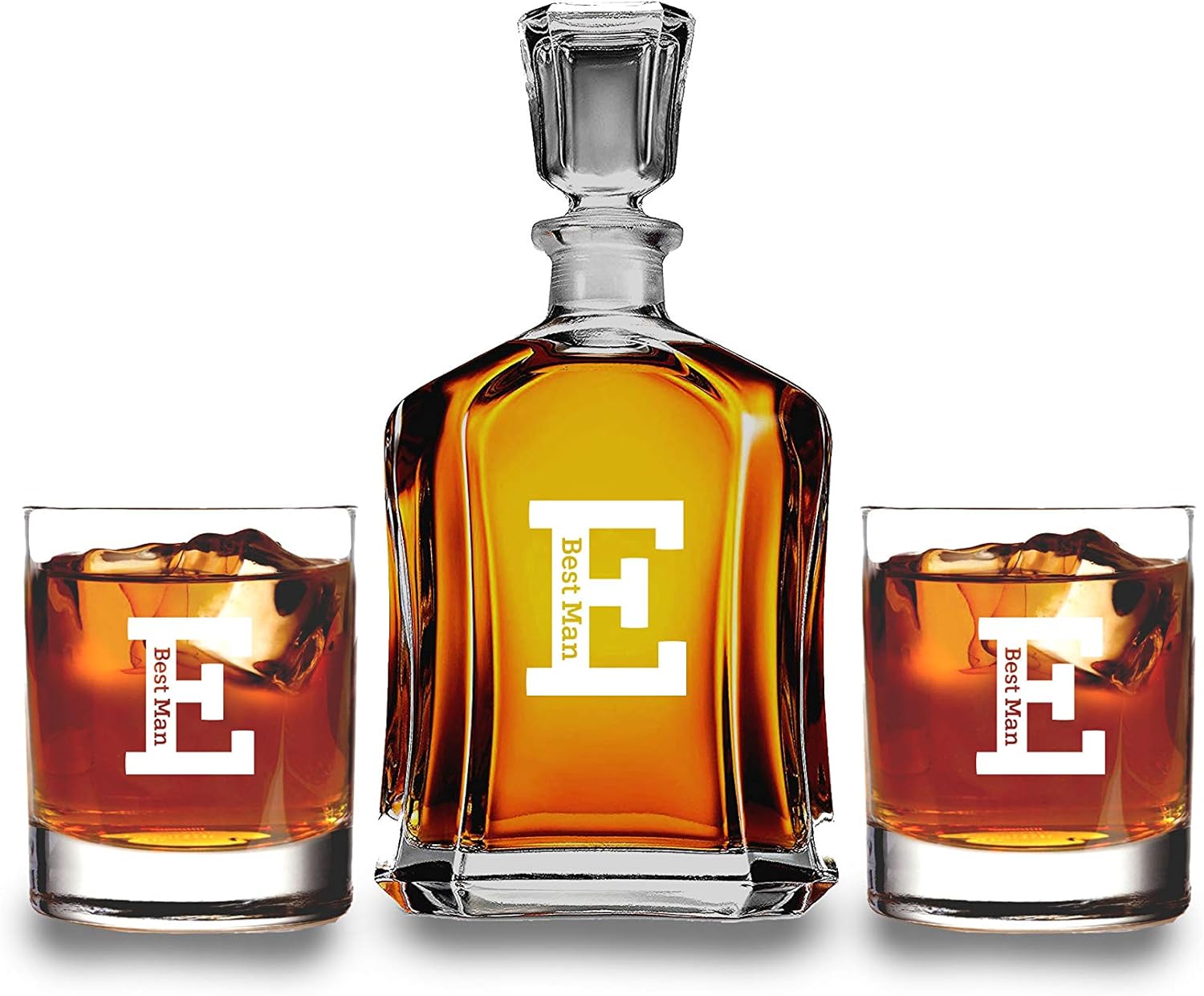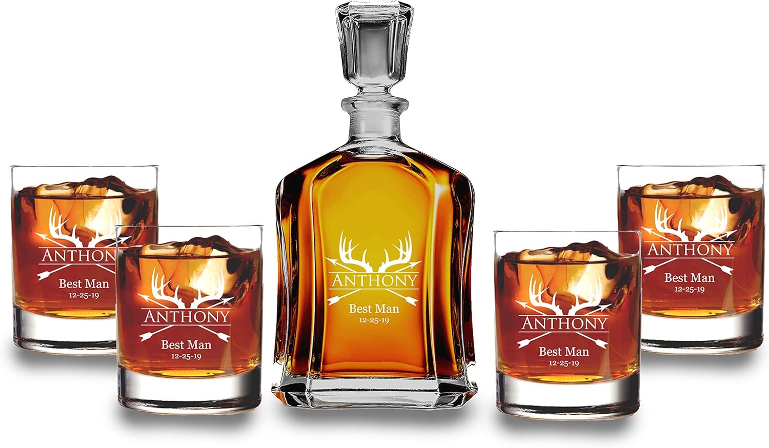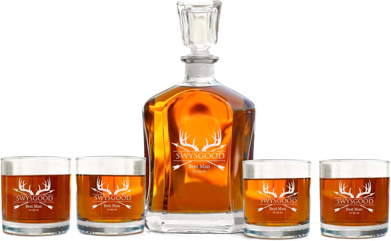 Our Decanters are made of glass. Our decanter sets comes with 4 whiskey glasses either. All our decanters and whiskey glasses are laser engraved and personalize for your needs. Our Personalize decanter sets would make best gift for Birthdays, Anniversaries, Housewarming, Wedding, Groomsman, couple gift, Father's day Gift and many more occasions. also you can send us your text /company logo for penalization on the decanter and glasses. Your boss would love this Gift whiskey lovers will adore this Engraved decanter with glasses gift and all of the decanters are personalize and laser engraved in USA. ITEM DETAIL: - Each Decanter will hold 23 oz of liquid and has option for 4 Whiskey glasses with it. - Personalized and Laser Engraved as per need and made in USA - Great addition to your barware