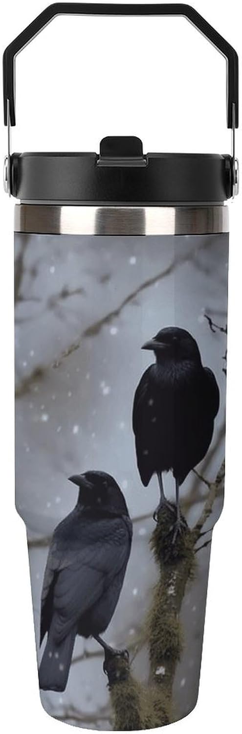 Black Crow Birds Water Bottle 30 Oz Fits Car Cup Holder,Insulated Coffee Mug Large Capacity Car Cups,Stainless Steel Double Wall Sport Bottle for Travel Sports Gym