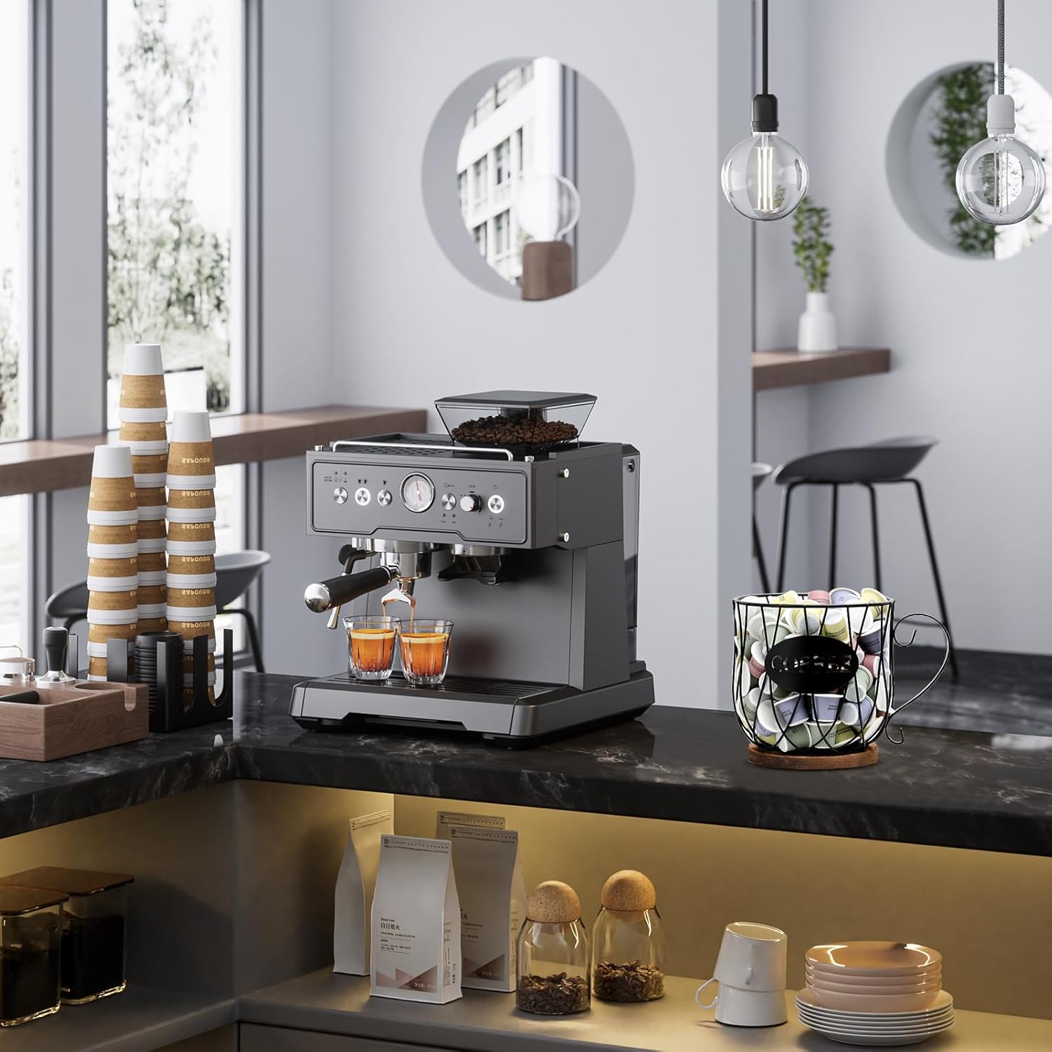 A set of 2-piece coffee cup storage baskets with wooden brown base, K Cup Holder Organizer Square and Round