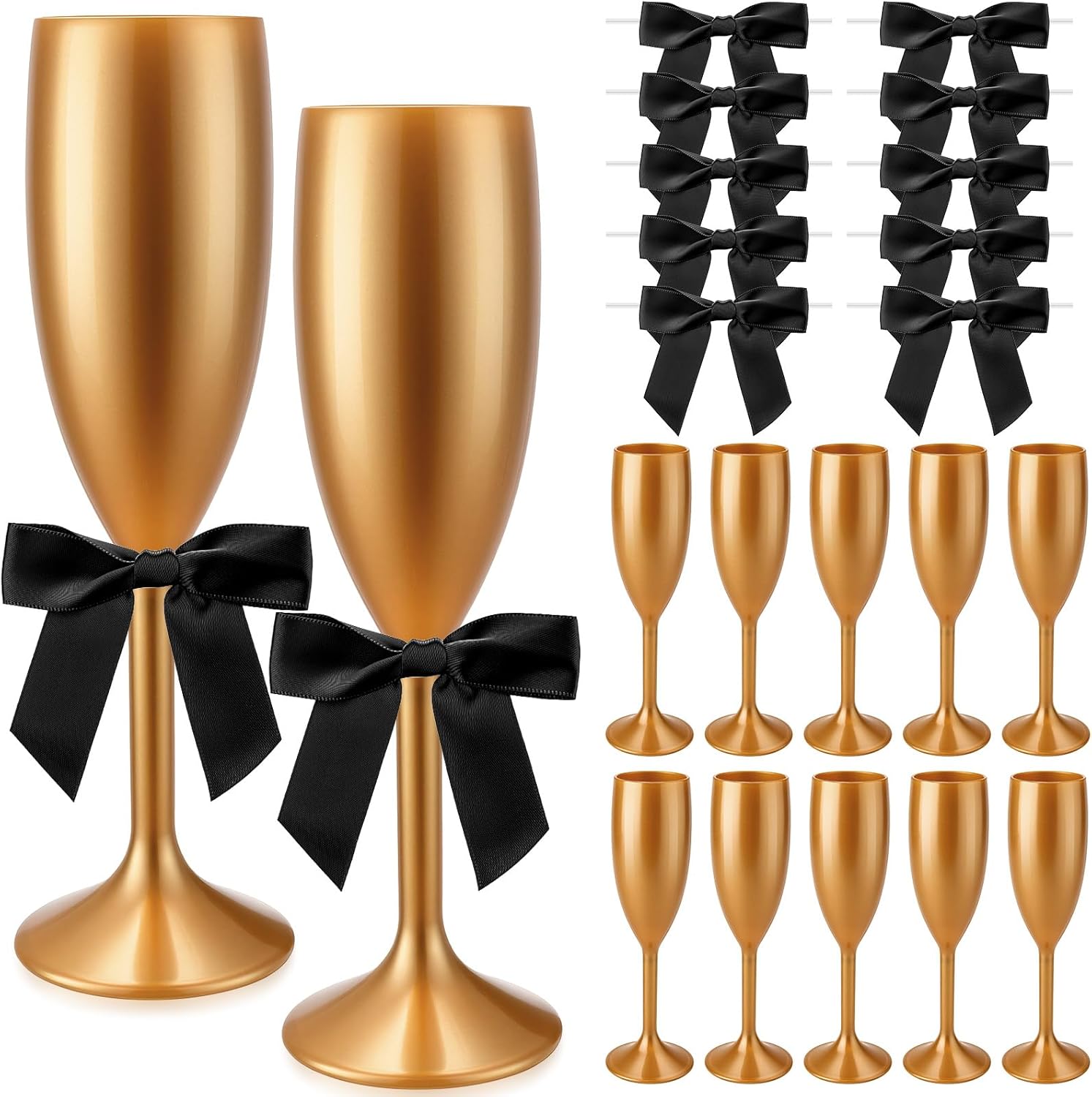 Features: Suitable Size for a Toast With dimensions of 5.2 x 5.2 x 22 cm (2.1 x 2.1 x 8.7 inch), our champagne flutes are designed for the toast. They hold just the right amount of bubbly, ensuring you and your guests enjoy every celebration moment comfortably. Ideal for Weddings Events Unlike fragile glass, these lightweight plastic flutes are for beach weddings, rooftop parties, and poolside events where glass is prohibited. The durable acrylic resists cracks and cloudiness, maintaining clarity even after repeated use. Specifications: 10 x Champagne flute glasses Material: plastic Color: clear Size: 5.2 x 5.2 x 22 cm / 2.1 x 2.1 x 8.7 inch 50 x Bow Material: ribbon Color: pink Size: 8.9 cm / 3.5 inch Notes: Manual measurement, please allow slight errors on size. The color may exist a slight difference due to different screen displays.