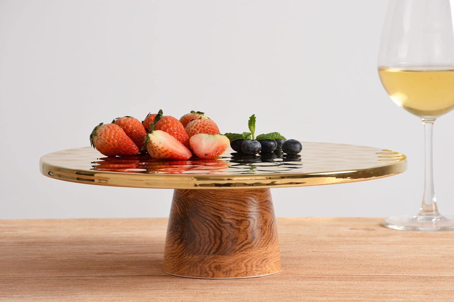 Cake Stand from our Madera Collection. An elegant way to present cakes, cupcakes, and other pastries. Elevate your desserts to a new level! Stunning high-fired porcelain with a rustic wood design and gold-toned rim. Food safe. Dishwasher safe. Oven safe . Easy Care.