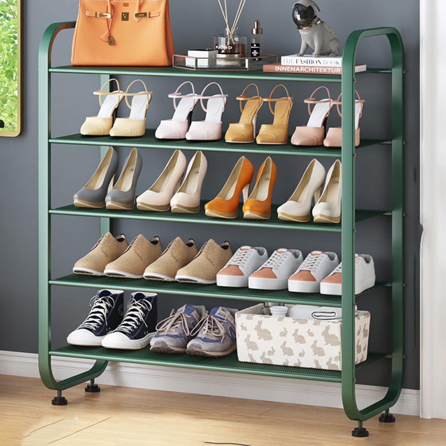 What are the features of this DIY shoe rack?STACKABLE AND EXPANDABLE: This 3-tier shoe rack can hold flats, boots, heels and kids' shoes. Two sets of shoe racks can be stacked or placed side by side to create a large capacity shoe rack that meets your space needs.MULTIFUNCTIONAL STORAGE RACK: You can place this shoe rack anywhere you want, such as the entrance, closet, garage or living room; it can also be used as a storage rack for dry food, books, games, toys, handicrafts and more.Will you find more possible uses? Try this multifunctional shelf.SpecificationColor: gold/black/white/emerald greenMaterial: MetalProduct Size: Multi-tier options please see size imageWeight: 5.5 lbs.Maximum load capacity 30 pounds per shelfPackage Contents3 Tier Shoe RackAssembly manualAllen wrenchAccessories