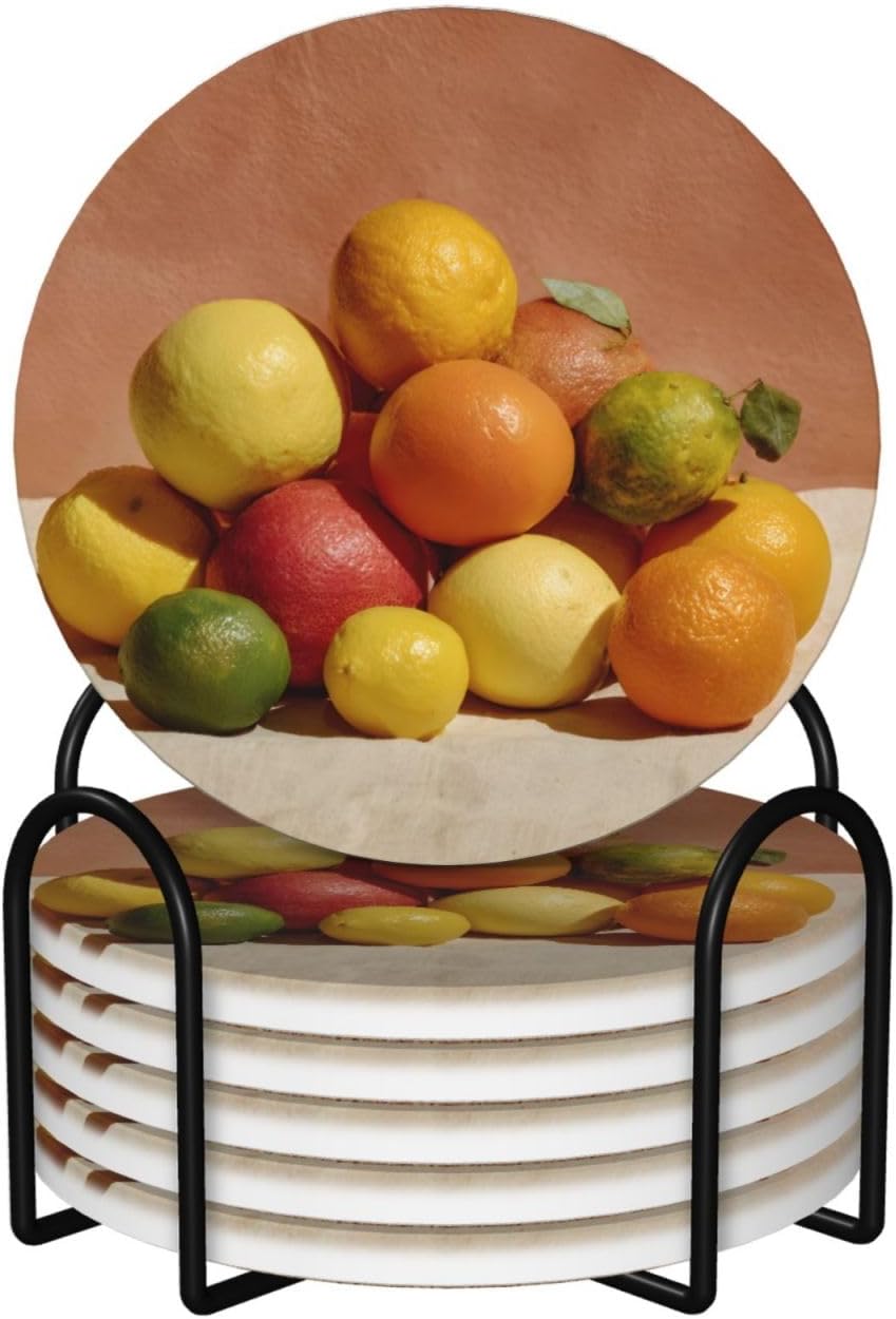 Product Name: DCEHGEW Ceramic Drink CoastersMaterial Type: Ceramic with cork bottomSize: Round: 4.1 x 4.1 inches, Square: 3.9 x 3.9 inches, Hexagon: 4.3 x 3.7 inchesPattern: Citrus pile About Our Ceramic Absorbent Coasters:Product Features - Crafted from high-quality ceramic, these coasters are odorless and eco-friendly. Their superior absorbency keeps your surfaces dry by quickly soaking up spills from coffee, cola, and other beverages within 10-15 seconds.Applicable Scenarios - Perfect for adding a stylish touch to your kitchen, living room, bar, hotel, or restaurant. These coasters are an ideal present for birthdays, Mother's Day, Father's Day, Valentine's Day, anniversaries, housewarming celebrations, or Christmas.Accessory Structure - Each set includes 6 ceramic coasters with cork bottoms, accompanied by a sleek black metal stand for organized and aesthetic storage. Choose from three different shapes to suit your style and needs.Washing Instructions - Easily clean these coasters with water or a damp cloth.Special NoteDue to different measurement methods, a deviation of up to 0.3 cm in size is considered normal.Please Note:The product images are for reference only. Actual products may vary slightly due to production factors such as batch differences and machine settings. Minor variations in color, position, and size are normal and not considered defects. Thank you for your understanding!Customer Service:We want to make sure you have an amazing experience with us. Please contact us with any feedback you may have. We love to hear from you and usually respond within 12-24 hours.