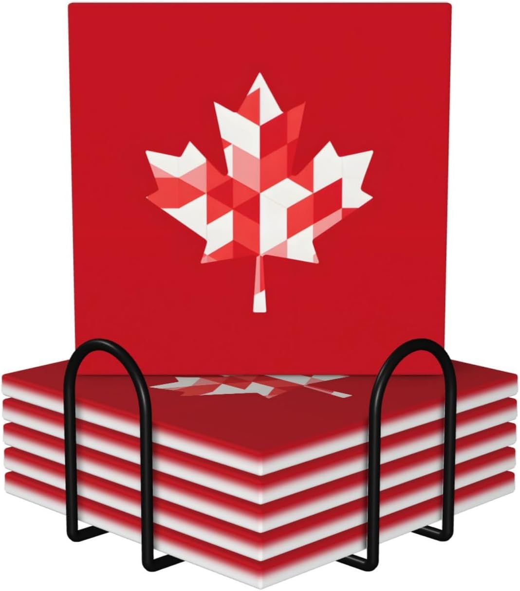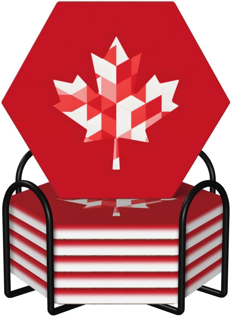 Product Name: DCEHGEW Ceramic Drink CoastersMaterial Type: Ceramic with cork bottomSize: Round: 4.1 x 4.1 inches, Square: 3.9 x 3.9 inches, Hexagon: 4.3 x 3.7 inchesPattern: Canada Flag About Our Ceramic Absorbent Coasters:Product Features - Crafted from high-quality ceramic, these coasters are odorless and eco-friendly. Their superior absorbency keeps your surfaces dry by quickly soaking up spills from coffee, cola, and other beverages within 10-15 seconds.Applicable Scenarios - Perfect for adding a stylish touch to your kitchen, living room, bar, hotel, or restaurant. These coasters are an ideal present for birthdays, Mother's Day, Father's Day, Valentine's Day, anniversaries, housewarming celebrations, or Christmas.Accessory Structure - Each set includes 6 ceramic coasters with cork bottoms, accompanied by a sleek black metal stand for organized and aesthetic storage. Choose from three different shapes to suit your style and needs.Washing Instructions - Easily clean these coasters with water or a damp cloth.Special NoteDue to different measurement methods, a deviation of up to 0.3 cm in size is considered normal.Please Note:The product images are for reference only. Actual products may vary slightly due to production factors such as batch differences and machine settings. Minor variations in color, position, and size are normal and not considered defects. Thank you for your understanding!Customer Service:We want to make sure you have an amazing experience with us. Please contact us with any feedback you may have. We love to hear from you and usually respond within 12-24 hours.