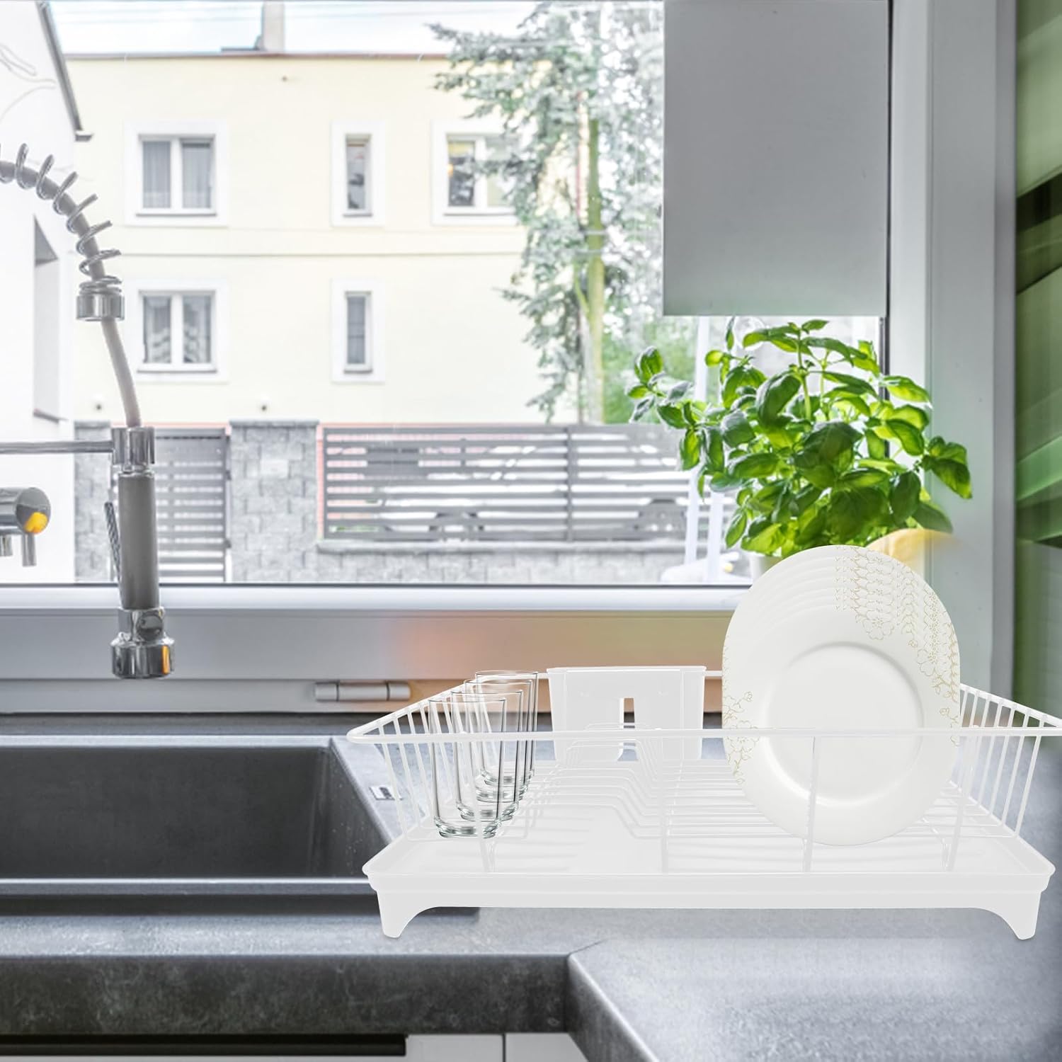Package Include 1 x bottom tray 1 x iron wire rack 1 x double-compartment box Features - Material:PP, iron -Product Info:Kitchen tableware drying rack - Size: 42.00X31.00X13.00cm/16.51X12.18X5.11in - Color: White - Kitchen utensils and cutlery rack can keep your items on the cabinets or countertop clean and tidy drain rack. - The reasonable design makes it easy to clean and at the same time prevents water from leaking drainer for plates. - Safe and convenient to use, not easy to break or deform, reusable and can be applied for longtime plate drain rack. - The compartment slot design separates the items so that the needed plates and bowls can be easily accessed countertop cutlery dish racks. - Smooth and mellow surface design, not easy to hurt hands. It will meet your needs kitchen cutlery holder rack.Goods Descriptionsilverware drying rack Made of PP, iron, light and easy to use, not easy to deform or break, saving room for your kitchen and kitchen utensils better organized.dish drainer for kitchen counter Are you tired of the messy situation of the kitchen countertop? This practical and professional kitchen dish drying rack can be your unmissable choice