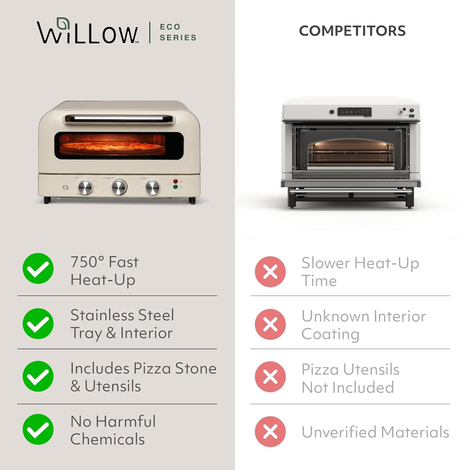 Meet the Willow Eco Series — the electric pizza oven that's redefining what it means to cook sustainably without sacrificing an ounce of performance. Built for the home chef who demands pizzeria-quality results, this indoor pizza oven reaches a blazing 750°F in minutes, turning out crispy, bubbling pies that taste like they came straight from a wood-fired kitchen. Whether you're cooking fresh dough or reheating a frozen favorite, this pizza oven indoor powerhouse handles it all with five precision presets dialed in to perfection. As a countertop oven designed to fit seamlessly into any kitchen, the Willow Eco Series proves that a small oven can deliver big results. Its compact, stylish footprint makes it the ideal portable oven for apartments, home kitchens, and even outdoor entertaining — wherever great food happens. Unlike a standard electric oven, this dedicated pizza cooker circulates intense, focused heat that a conventional oven simply cannot replicate, giving you that signature crispy crust every single time. At the heart of every great pie is a great pizza stone — which is why we include a premium ceramic one right in the box, alongside a pizza peel and cutter so you're ready to cook from day one. This isn't just a pizza maker, it's a full countertop cooking system capable of tackling calzones, flatbreads, garlic knots, and more. Crafted with 99% recycled plastics and certified by the Global Recycled Standard, the Willow Eco Series is the electric pizza oven that lets you eat well and feel good about it. Horno para pizza never looked — or performed — this good.