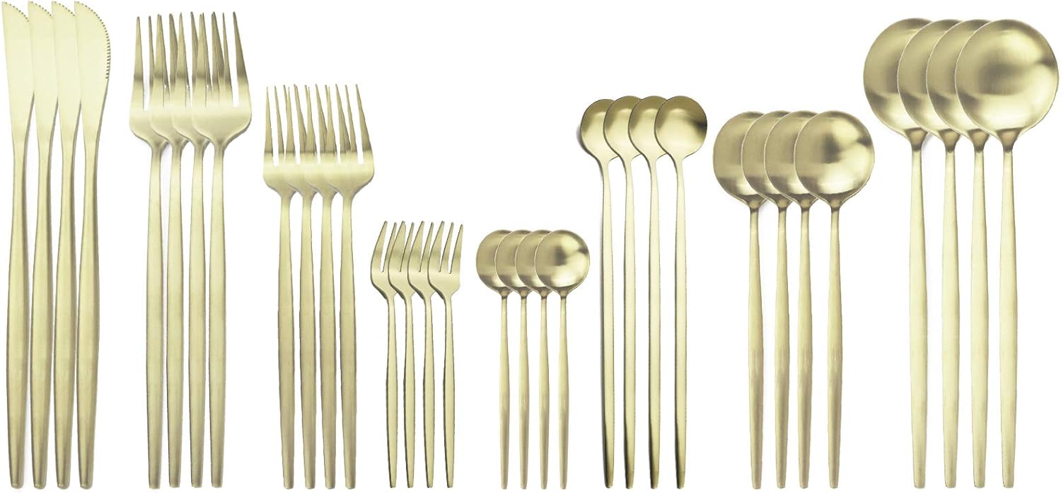 • Luxury matte flatware set include---4 pcs dinner fork,4 pcs salad spoon,4 pcs salad fork,4 pcs knives,4 pcs dinner spoon,4 pcs coffee spoon 4pcs cake fork,4pcs long handle spoon - serve dinner for 4.