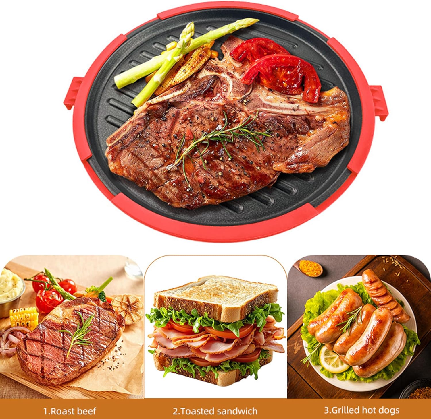 Description: This microwave grill pan is a versatile kitchen essential designed to combine convenience with efficient cooking. Featuring a high-quality non-stick coating and heat-resistant construction, it allows you to prepare a variety of dishes including breakfast sandwiches, grilled fish, sausages, steaks, pizza, and bread with ease inside your microwave. Its multifunctional design serves as both a microwave toaster and crisper, ensuring evenly cooked, golden-brown results every time while cutting down on preparation and cleaning time. Lightweight and compact, it fits easily in your kitchen and simplifies meal prep, perfect for those seeking a quick, user-friendly solution to enjoy delicious grilled meals without the mess or hassle of traditional grills. This microwave grill pan delivers reliable performance, enhances your cooking efficiency, and adds convenience to your daily meal routines. Features:. -Color: Red. -Material: food Grade Silicone. -Size: 26.5x23.8x3.4 cm/10.4x9.4x1.3 inch. High Temperature Resistance of 230℃. Note:Tips for using the microwave baking tray:Bread (single piece) 700W, medium heat, 4 minutesSausage 700W, medium heat, one side 5 minutes, the other side 4 minutesSteak 700W, medium heat, one side 5 minutes, the other side 3 minutesChicken wing 700W, medium heat, one side 7 minutes, the other side 6 minutesManual measurement, please allow slight errors on size.The colors may exist slight difference due to different screens. Package Including 1 * Microwave Grill Pan