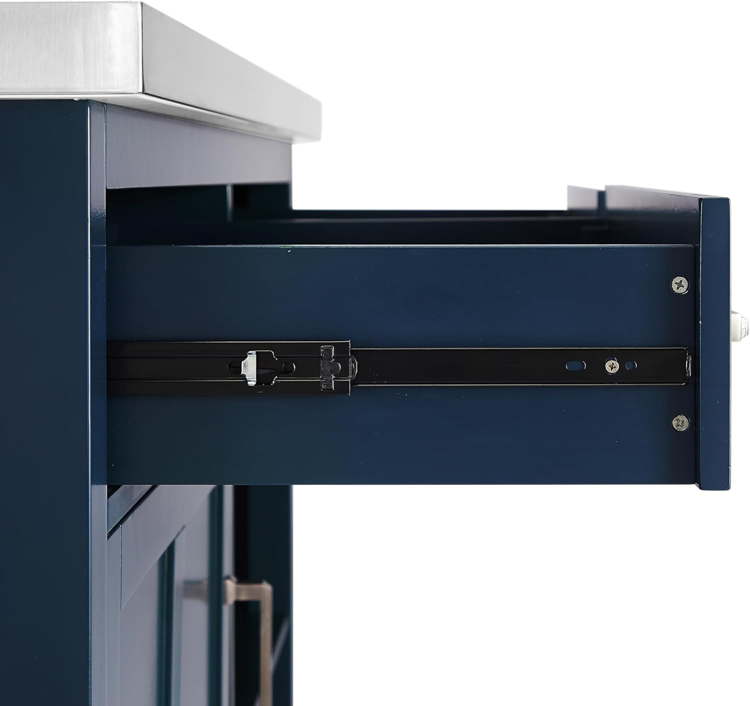 Add storage, workspace, and a dining area to your kitchen with the Silvia Kitchen Island. Classic recessed panels and oversized bar hardware make this kitchen island with storage perfect for a variety of home styles. With full-extension drawers, a large cabinet, and open shelving, all your kitchen items will stay neat and tidy. The oversized countertop extends past the island base creating dining space for a casual evening meal.