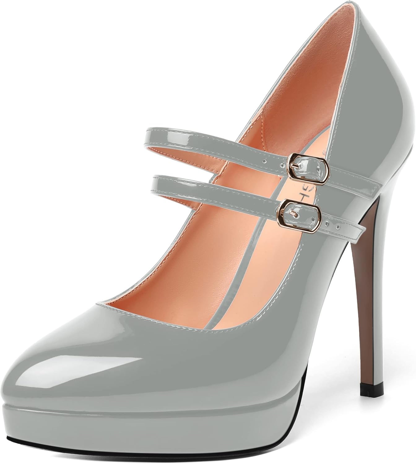 AMBELIGHT Womens Platform Pointed Toe Solid Buckle Party Patent Ankle Strap Dress Stiletto High Heel Pumps Shoes 4.7 Inch