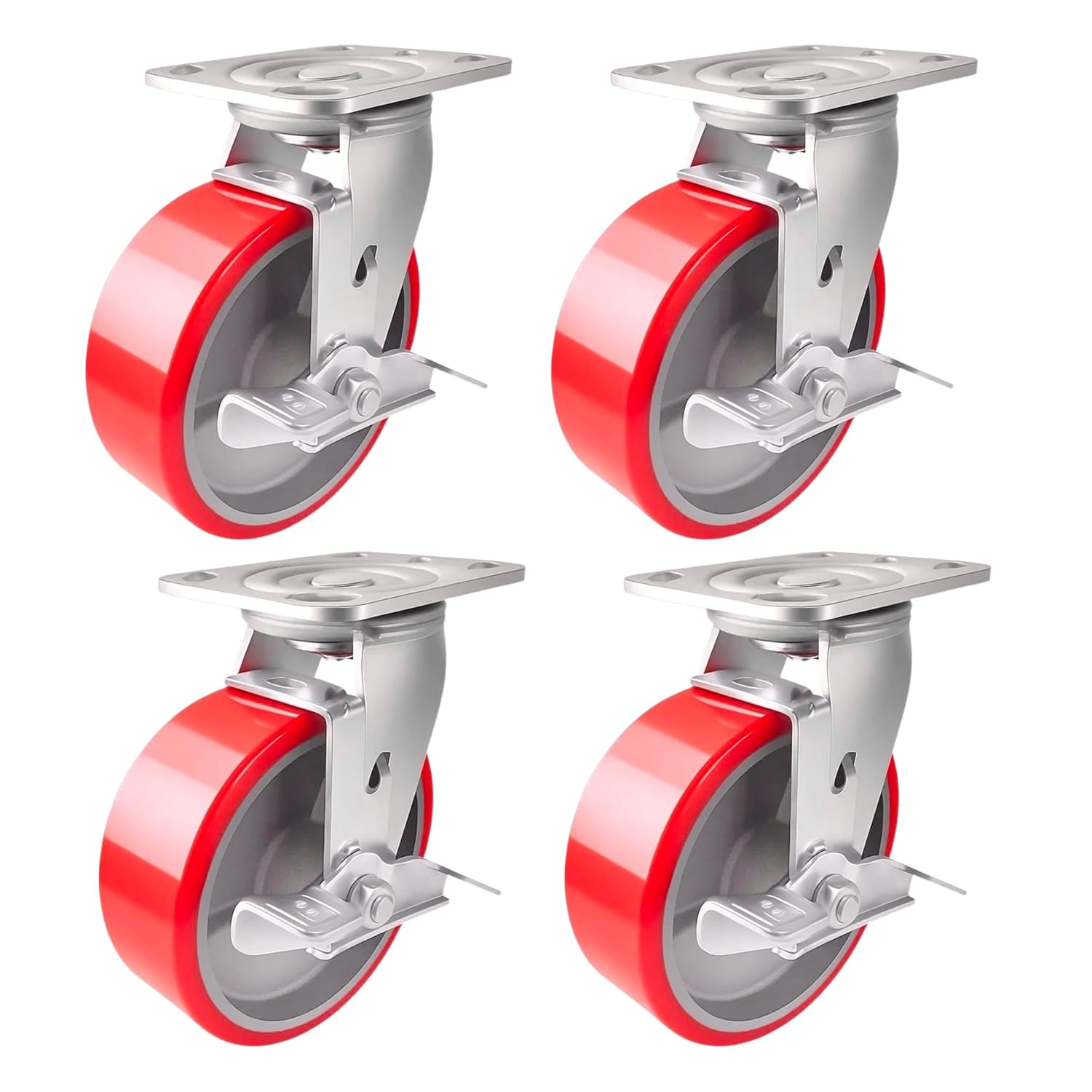 Enhance the mobility and stability of your furniture, workbench, carts, or toolbox with our Heavy Duty Caster Set featuring polyurethane on cast iron wheels in vibrant red, designed to leave no marks behind. With versatile set options including 4 Rigid, 4 Swivel, 4 Swivel with Brake, 2 Rigid + 2 Swivel, 2 Rigid + 2 Swivel with Brake, and 2 Swivel + 2 Swivel with Brake, you can choose the configuration that best suits your needs. Available in 4", 5", and 6" diameter options, these casters offer varying load capacities ranging from 700 pounds to 1000 pounds per caster, ensuring reliable support for medium-heavy duty applications. The tread width of 2" provides a stable base for smooth and effortless movement, while the top plate measuring 3-15/16" x 4-1/2" offers easy installation and compatibility with different mounting configurations. Whether you're maneuvering platform trucks, food service equipment, or large stock carts, our caster set is an excellent choice for a wide range of applications.