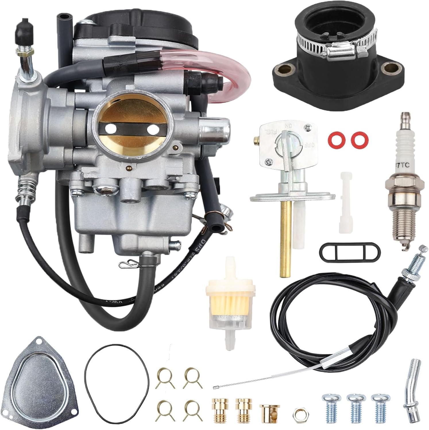 Carburetor is a sort of rigid mechanical device, which acts core function for engine. You can imagine how important it is! A fully-equipped carburetor assembly is composed of several parts, so it could help engine work perfectly. With compact size, high quality and reliability, this ATV carburetor assembly won't let you down!Fits the Following Vehicles:2000-2002/2004 Yamaha Big Bear 400 YFM4002000-2006 Yamaha Big Bear 400 YFM400F 4x42000-2002 Yamaha Big Bear 400 YFM400FH 4x4 Hunter Edition2003 Yamaha Big Bear 400 YFM400FW 4x4/YFM400N2001-2002 Yamaha Big Bear 400 YFM400H Hunter Edition2000-2004 Yamaha Kodiak 400 YFM400A2000-2006 Yamaha Kodiak 400 YFM400FA 4x4/YFM400FAH 4x4 Hunter Edition2000-2002 Yamaha Kodiak 400 YFM400FAH 4x4 Realtree Xtra2007-2011 Yamaha Grizzly 350 YFM350G/YFM350FG 4x4/YFM350FGI 4x4 IRS/YFM350FGIH 4x4 Hunter Edition IRS2008-2011 Yamaha Grizzly 350 YFM350FGH 4x4 Hunter Edition2007-2008/2010-2012 Yamaha Grizzly 450 YFM450FG 4x42007-2012 Yamaha Grizzly 450 YFM450FGH 4x4 Hunter Edition2009 Yamaha Grizzly 450 YFM450FGI 4x4 IRS2007 Yamaha Grizzly 450 YFM450FGOH 4x4 Outdoorsman Edition/YFM450FGSE 4x4 Special Edition2011-2012 Yamaha Grizzly 450 YFM450FGP 4x4 EPS/YFM450FGPH 4x4 Hunter Edition EPS2006-2009 Yamaha Wolverine 350 YFM350X2007-2010 Yamaha Wolverine 450 YFM450FX 4x42007 Yamaha Wolverine 450 YFM450FXSE 4x4 Special Edition2008 Yamaha Wolverine 450 YFM450FXSP 4x4 Special EditionSpecs:Inner Diameter (intake side): 33mm(1.3")Outer Diameter (intake side): 38mm(1.46")Inner Diameter (air filter side): 48mm(1.89")Outer Diameter(air filter side): 52mm(2.04")Quality Guarantee:12-Month Warranty
