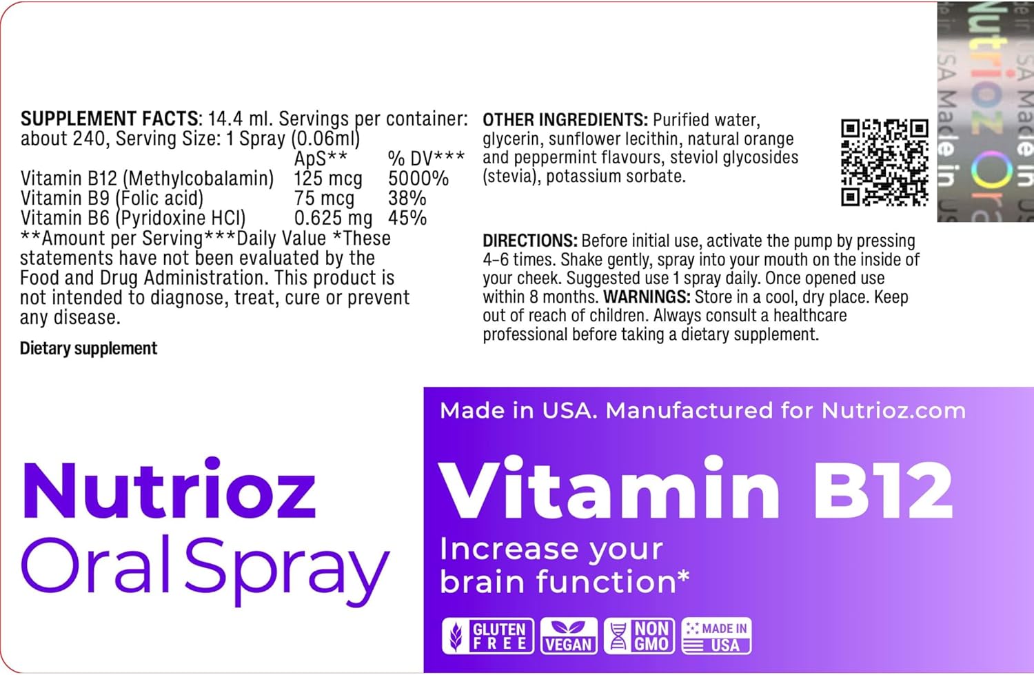 Nutrioz Vitamin B12 Oral Spray is a convenient liquid dietary supplement designed for easy daily use. The compact 14.4 ml spray bottle delivers approximately 240 sprays, providing a simple and portable alternative to traditional tablets or capsules. This formula features vitamin B12 in the methylcobalamin form, along with vitamin B6 and folate (vitamin B9). These essential B vitamins are commonly used in daily nutritional routines and are delivered through a fast, easy oral spray format. Using the spray is simpleβ€”shake gently and spray into the mouth on the inside of your cheek. The suggested use is one spray per day. The liquid format makes it ideal for busy lifestyles, travel, or anyone who prefers not to swallow pills. Formulated with purified water, glycerin, sunflower lecithin, natural orange and peppermint flavors, and stevia-derived sweetener, Nutrioz Vitamin B12 Oral Spray is vegan, gluten free, non-GMO, and manufactured in the USA.