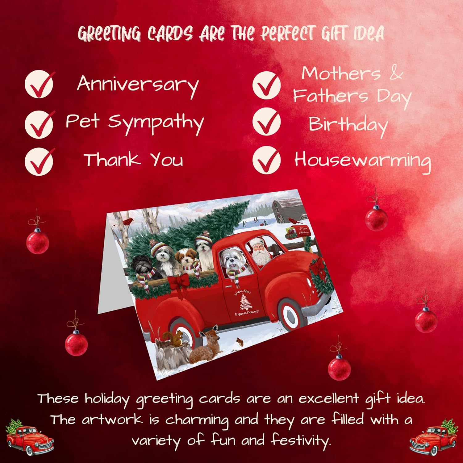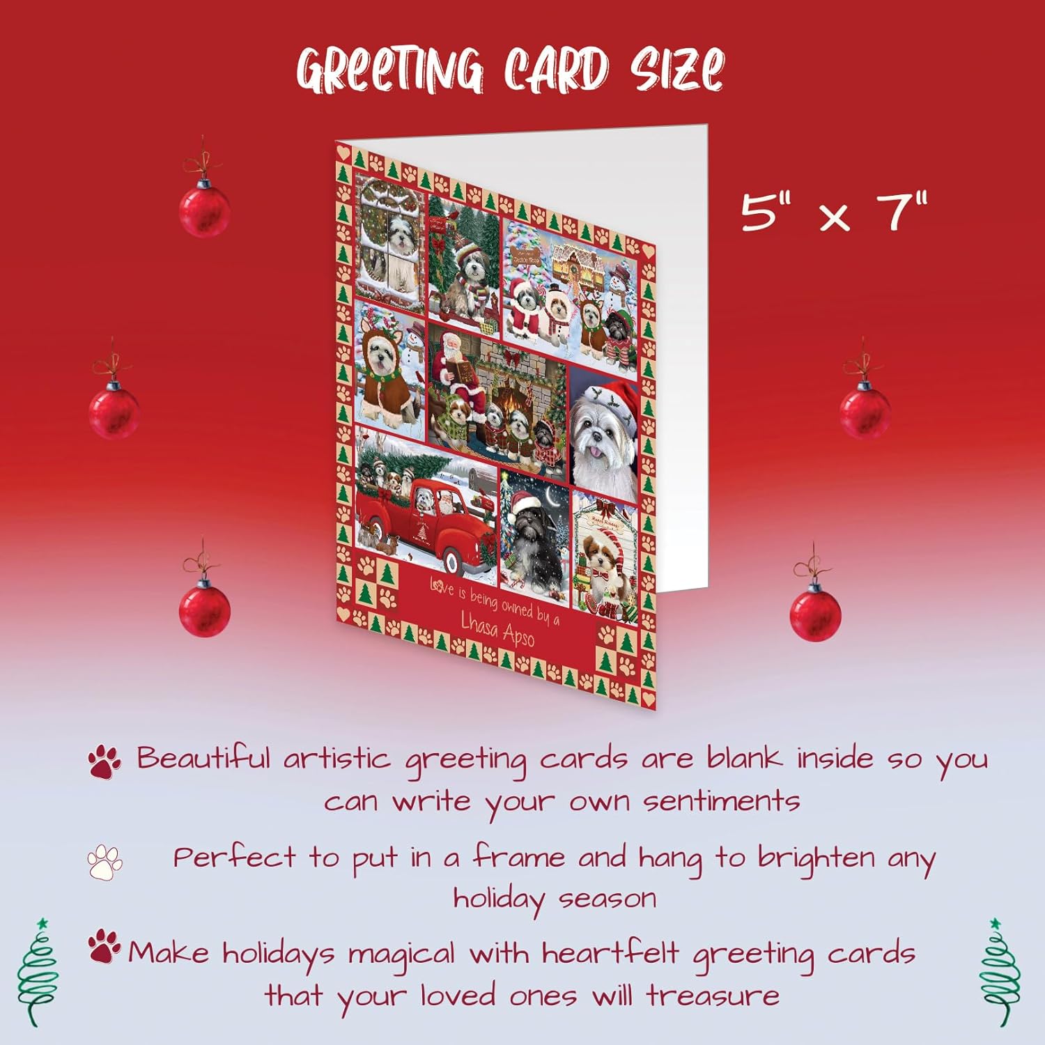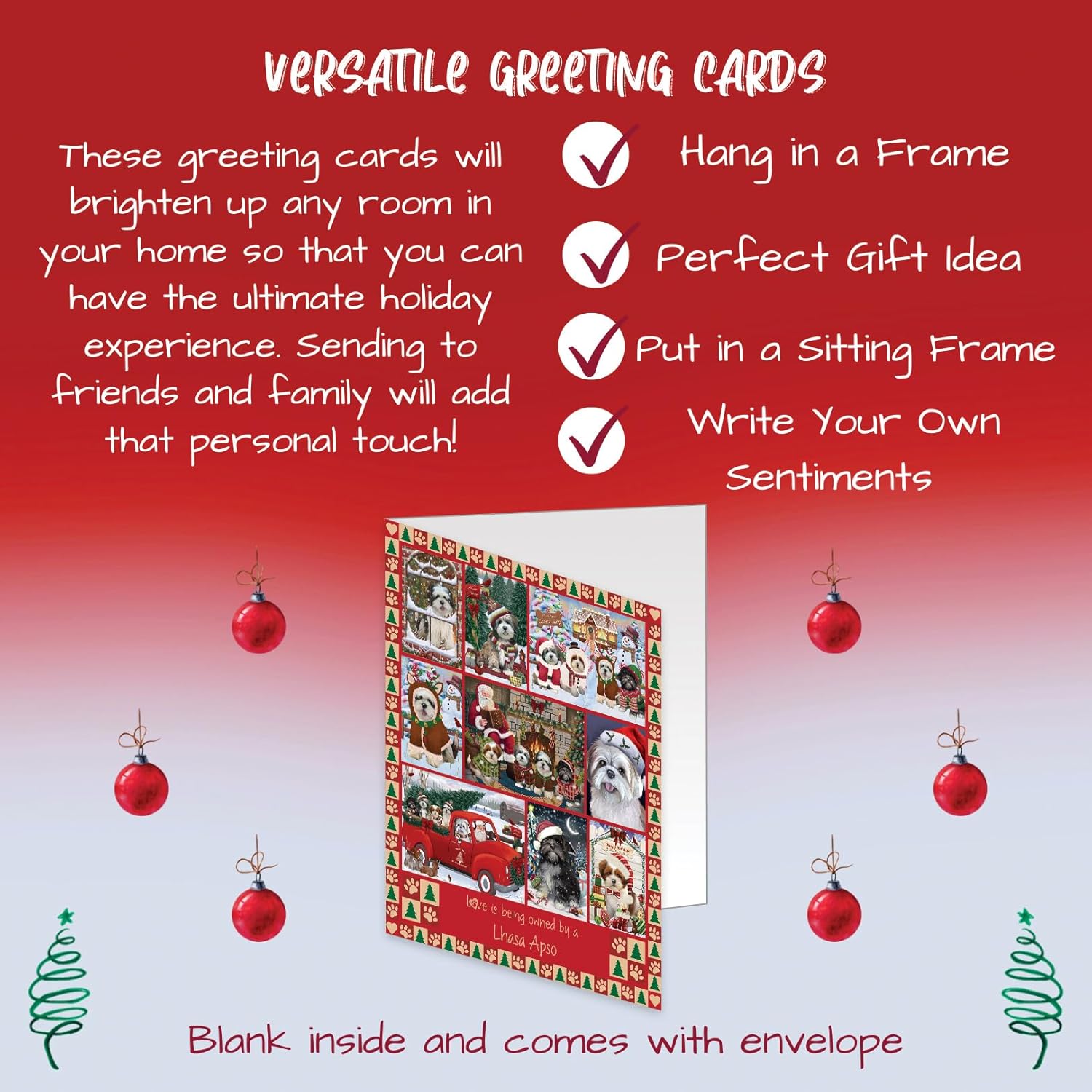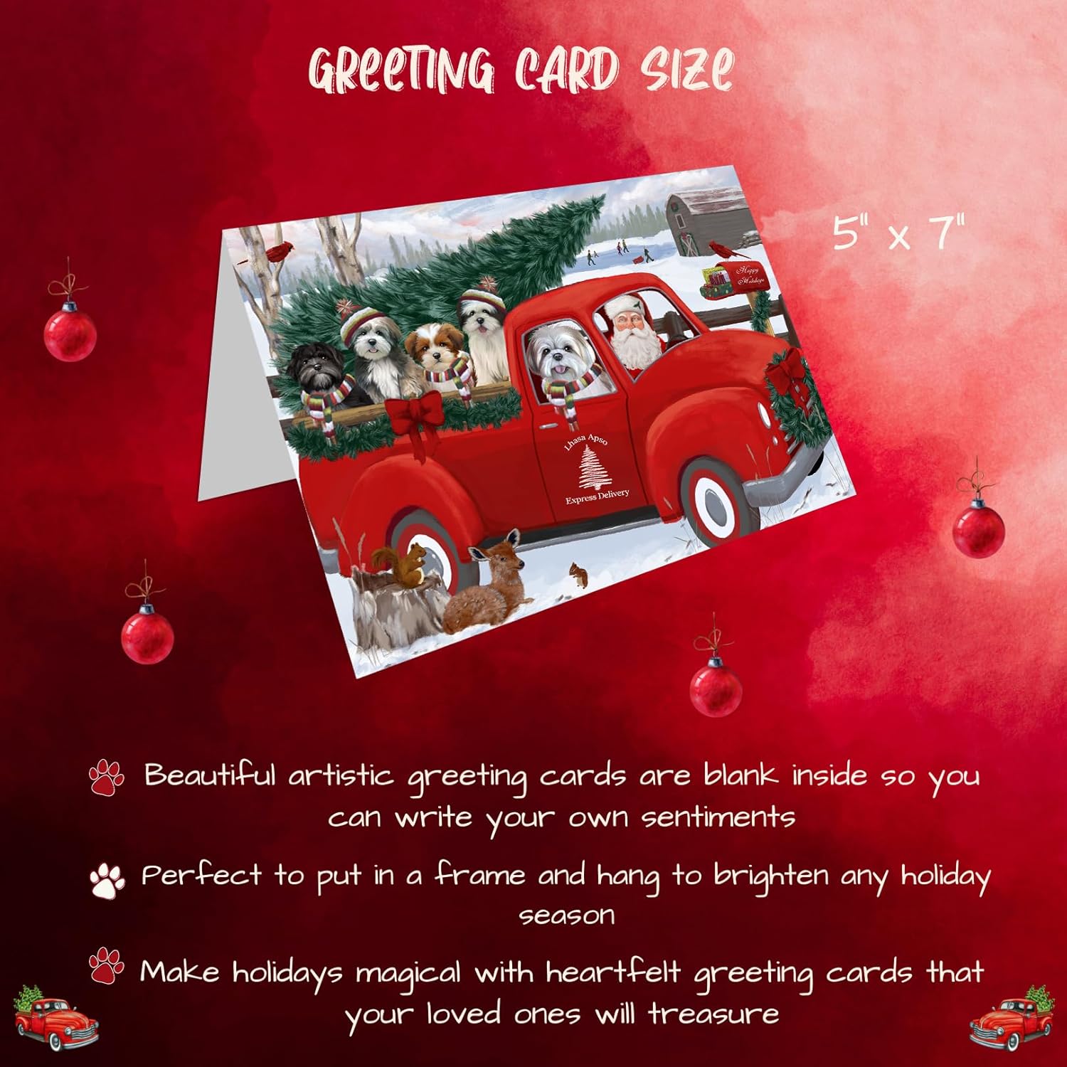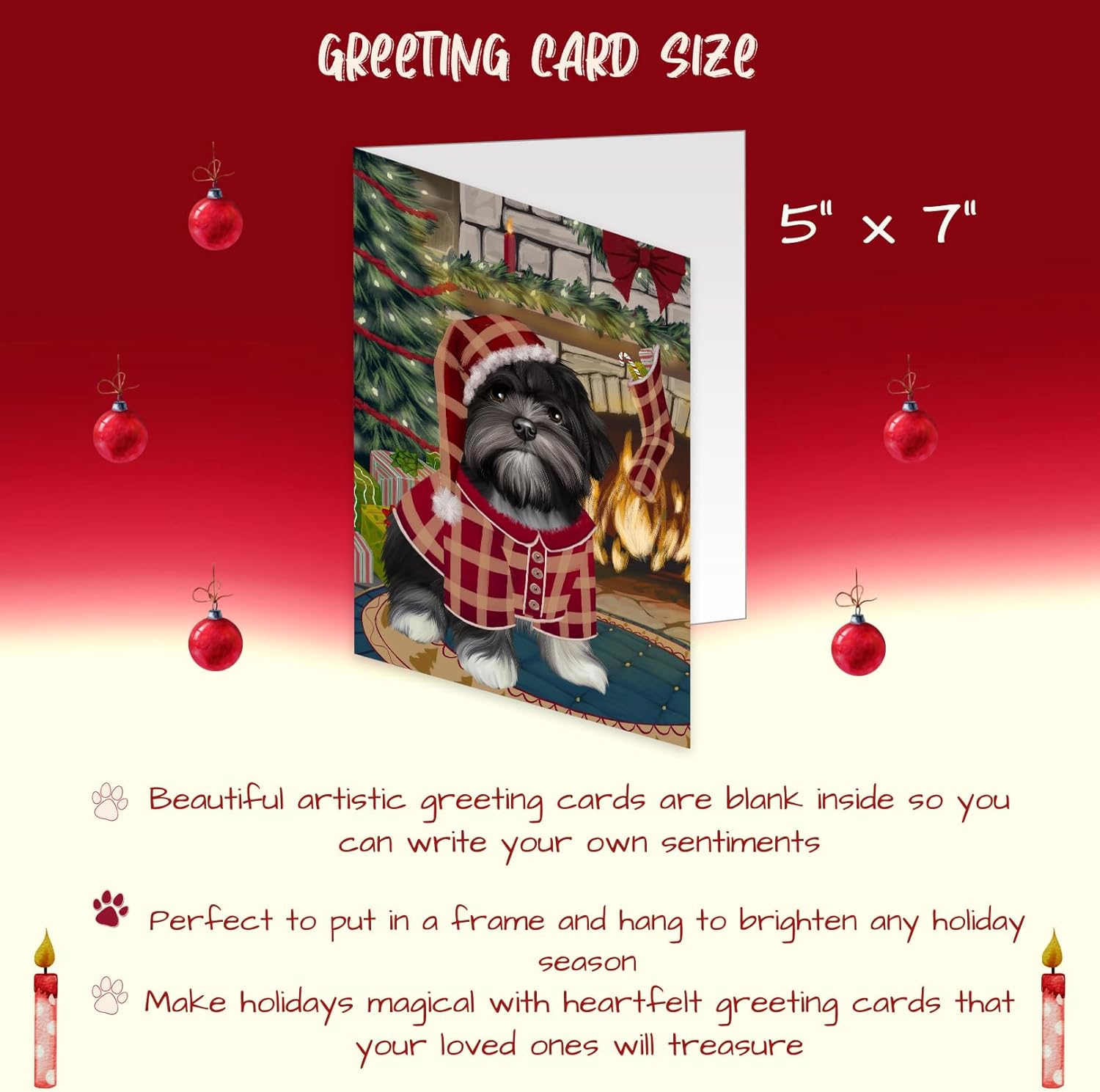 Introducing Our Dog Greeting Cards with Envelopes!Celebrate the holiday season with our exquisite Dog Christmas Cards. Crafted on premium, eco-friendly cardstock, these cards showcase vibrant colors and intricate details that truly make them stand out. Measuring at 5 x 7 inches for the Christmas greeting cards and 5.5 x 4 inches for the note cards, each set offers a variety of designs to suit all your festive needs.Inside the cards are blank, providing you with the perfect canvas to pen down your own personalized messages of gratitude and warm heartfelt sentiments to be sent out with love. Each card is accompanied by small envelopes, ensuring your holiday wishes are delivered in style.Key Features:• Stylish, vibrant designs that capture the spirit of the season.• Blank inside so you can write purposeful and meaningful messages. • Printed on high-quality paper stock for a luxurious feel.• Each Christmas card is paired with an envelope for a complete gifting experience.• Personalize and customize your messages anytime to add that extra personal touch.• Smooth, flawless surfaces inside every card for easy writing.• Suitable for a wide range of occasions, including Christmas, Mother’s Day, Father’s Day, and more.We take great pride in our dog-themed Christmas cards in bulk, and we're confident you'll love them just as much. However, if for any reason you're not completely satisfied with your purchase, please do not hesitate to contact us. We offer a full refund or replacement, ensuring your satisfaction is our top priority.Bring a touch of canine charm to your holiday cards greetings, and let your loved ones know you're thinking of them with our extraordinary Dog Greeting Cards.