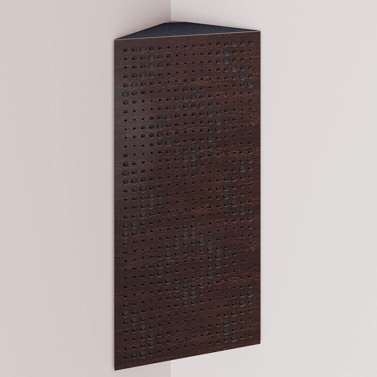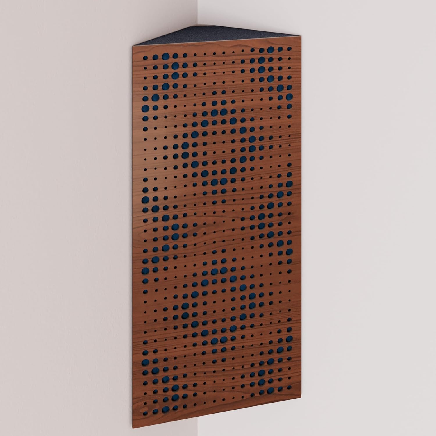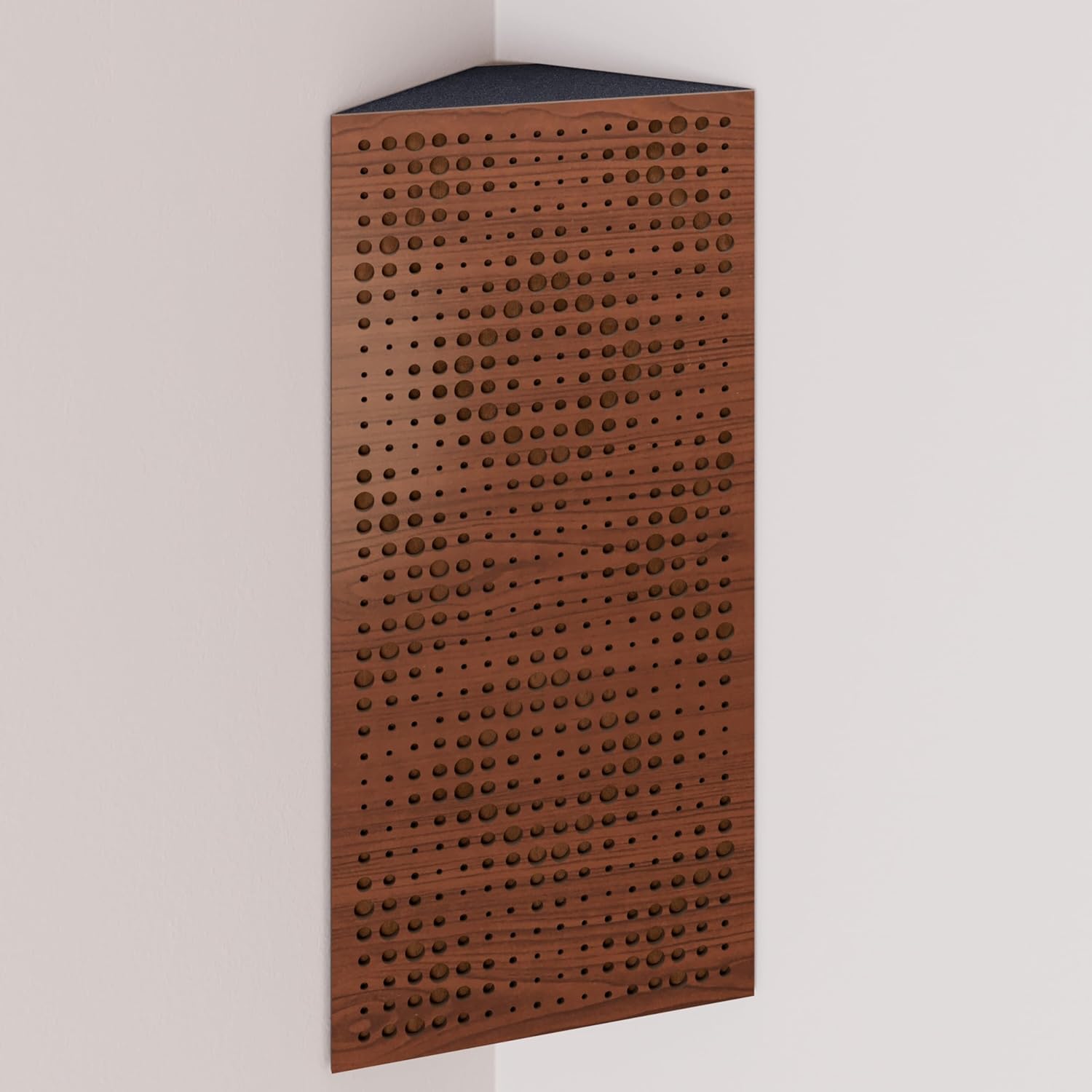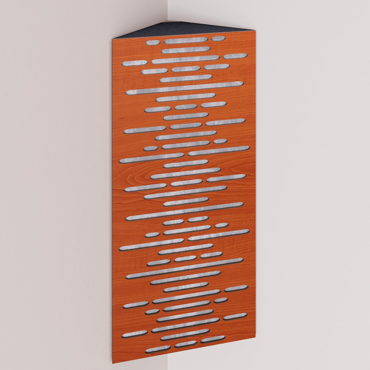 Narrow corner bass traps are decorated with velvet fabric, ideally placed in the corners of a room to mitigate low frequency problems and minimise echo. The trapezoidal shape ensures a snug fit in the corner, smoothly aligning it with the walls.The HDF front plate has a series of diffusion grooves that fulfil two functions: providing high frequency absorption to control corner reflections without attenuating sound, while simultaneously acting as a midrange diffuser.These bass traps excel in virtually any room where low frequency reverberations and standing waves are present. In addition to improving modal reverberation, the angular bass trap smooths the frequency response by reducing peaks and enhancing lows while correcting any frequency dips.PRODUCT DETAILS:Design: Engineered for Sound Absorption and DiffusionAbsorption Frequency: Low and Mid FrequenciesMaterial: Laminated HDF and Acoustic Foam covered with Velvet FabricHDF Color: Available in 10 color variantsFabric Color: Available in 11 color variantsEffective Scattering Range: 63Hz to 2000HzOverall Noise Reduction Coefficient (NRC): 0.41Dimensions: 500x235mm / 19.7x9.25 inchesThickness: 105mm / 4 inchesBoxes of: 2 units.SUITABLE ENVIRONMENTS: Ideal for Enhancing Acoustic Conditions in Recording Studios, Home Theaters, Music Rooms, Office Spaces, Rehearsal Studios, Auditoriums, Conference Rooms, and more.USAGE: Designed to Absorbs Low, High and Mid Range frequencies, slap echo, and other intrusive noises. Mounted in the corner.MOUNTING OPTIONS:Fixing with double-sided adhesive tape (included) in the vertical plane.