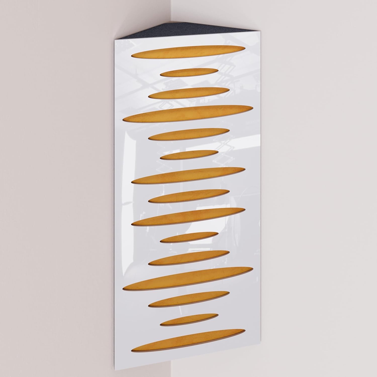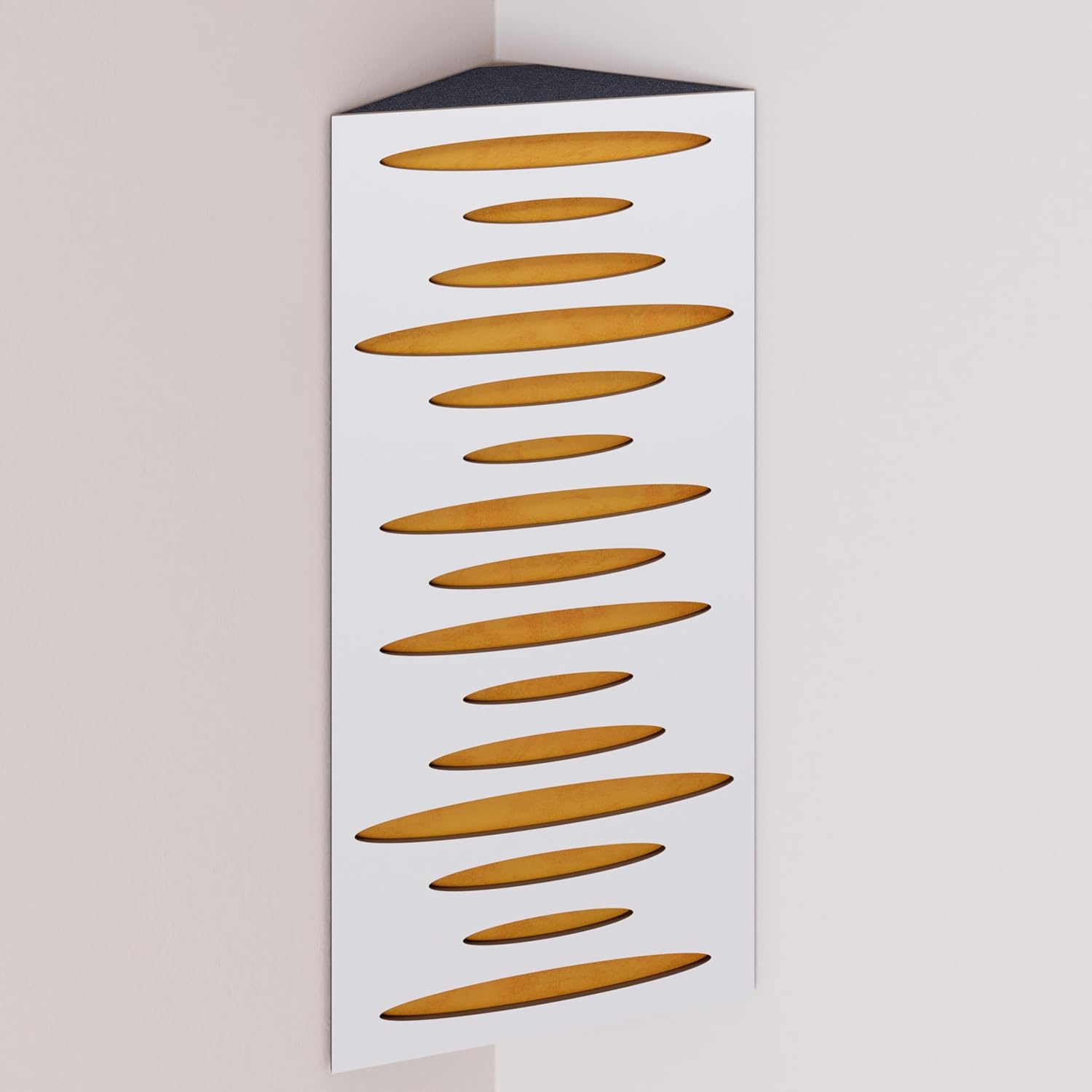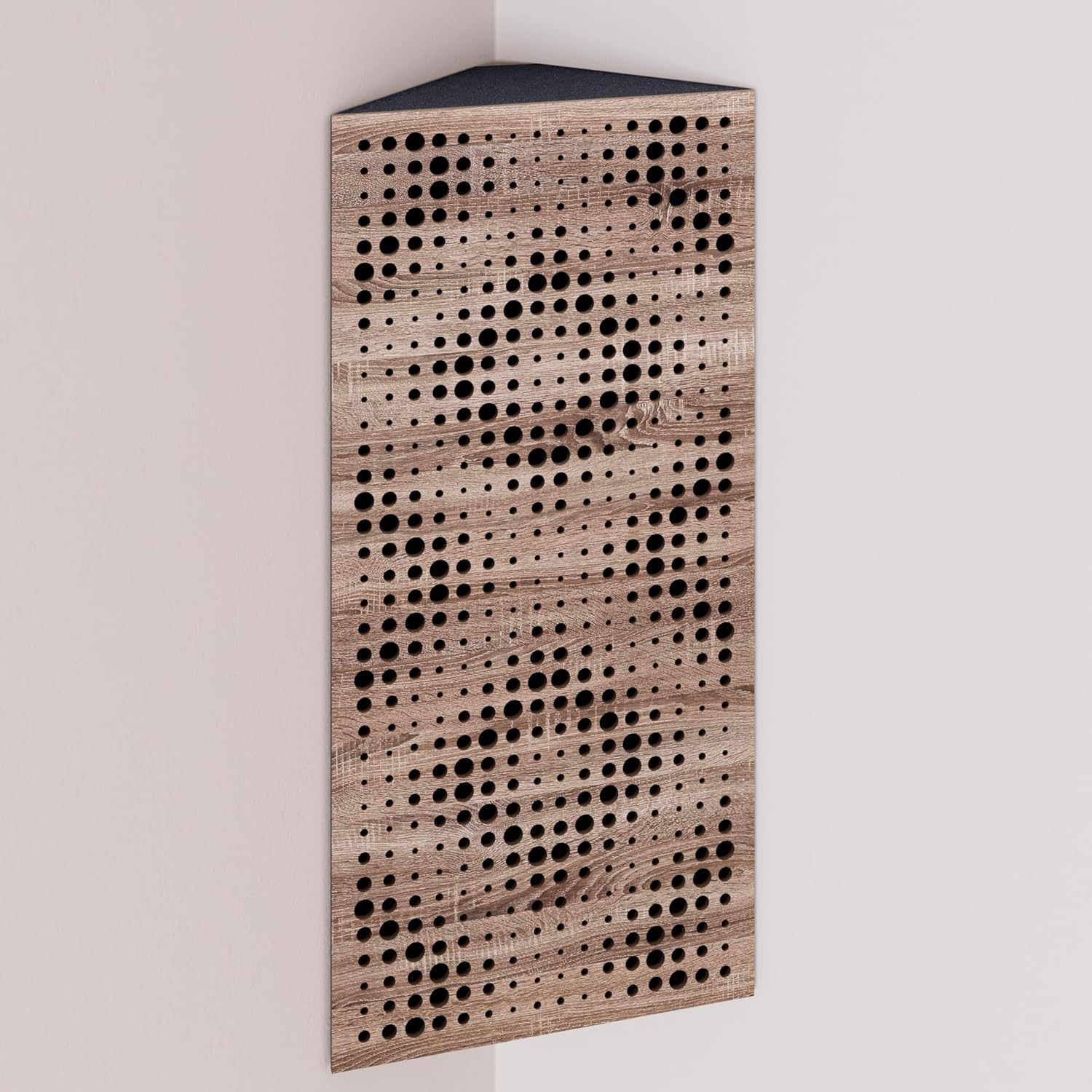 Narrow corner bass traps are decorated with velvet fabric, ideally placed in the corners of a room to mitigate low frequency problems and minimise echo. The trapezoidal shape ensures a snug fit in the corner, smoothly aligning it with the walls.The HDF front plate has a series of diffusion grooves that fulfil two functions: providing high frequency absorption to control corner reflections without attenuating sound, while simultaneously acting as a midrange diffuser.These bass traps excel in virtually any room where low frequency reverberations and standing waves are present. In addition to improving modal reverberation, the angular bass trap smooths the frequency response by reducing peaks and enhancing lows while correcting any frequency dips.PRODUCT DETAILS:Design: Engineered for Sound Absorption and DiffusionAbsorption Frequency: Low and Mid FrequenciesMaterial: Laminated HDF and Acoustic Foam covered with Velvet FabricHDF Color: Available in 10 color variantsFabric Color: Available in 11 color variantsEffective Scattering Range: 63Hz to 2000HzOverall Noise Reduction Coefficient (NRC): 0.41Dimensions: 500x235mm / 19.7x9.25 inchesThickness: 105mm / 4 inchesBoxes of: 2 units.SUITABLE ENVIRONMENTS: Ideal for Enhancing Acoustic Conditions in Recording Studios, Home Theaters, Music Rooms, Office Spaces, Rehearsal Studios, Auditoriums, Conference Rooms, and more.USAGE: Designed to Absorbs Low, High and Mid Range frequencies, slap echo, and other intrusive noises. Mounted in the corner.MOUNTING OPTIONS:Fixing with double-sided adhesive tape (included) in the vertical plane.