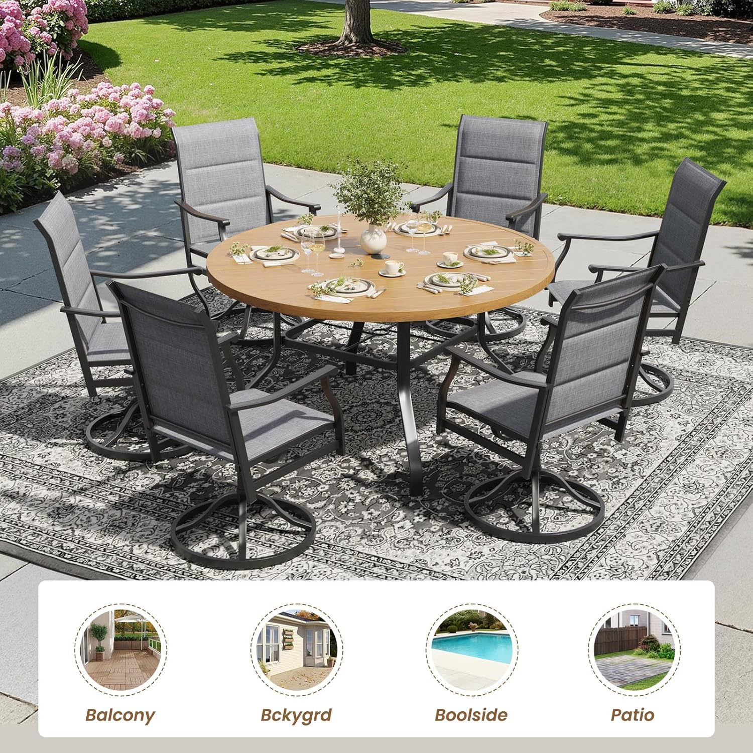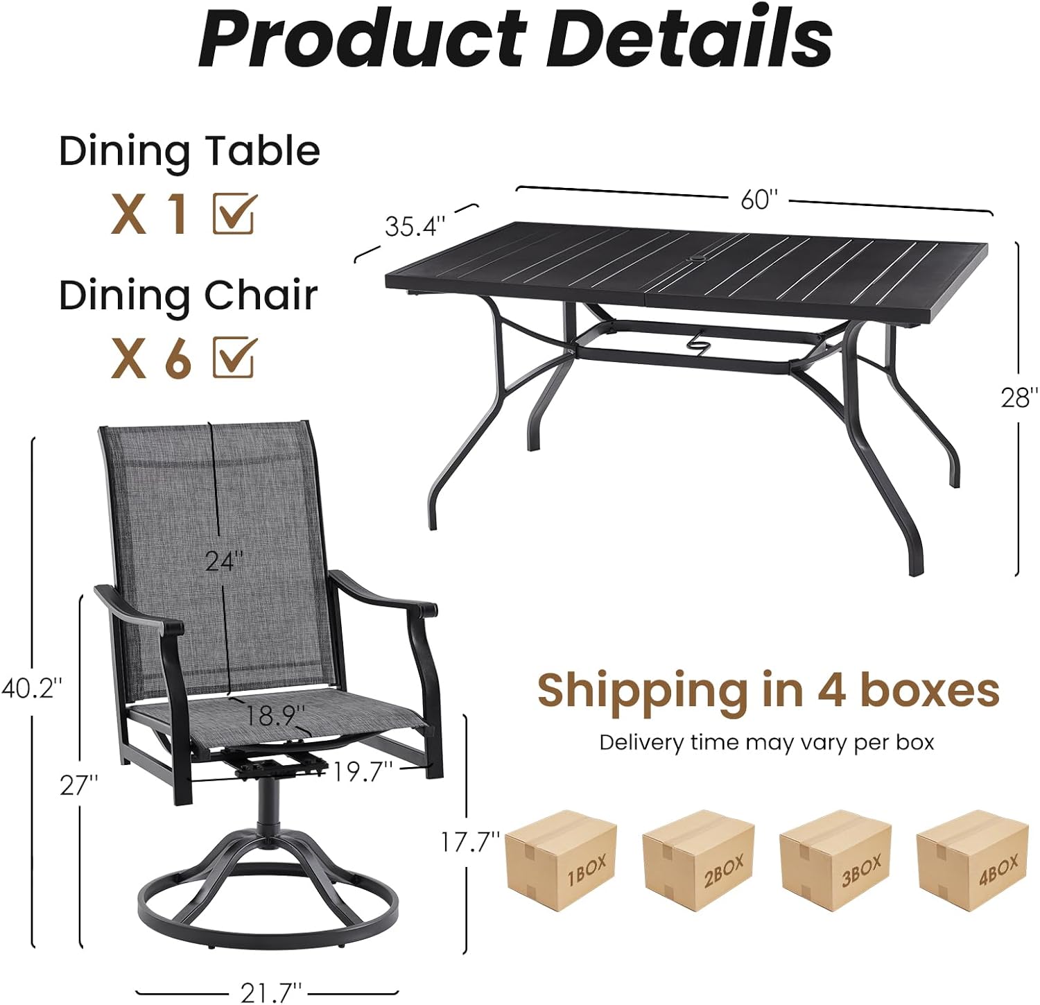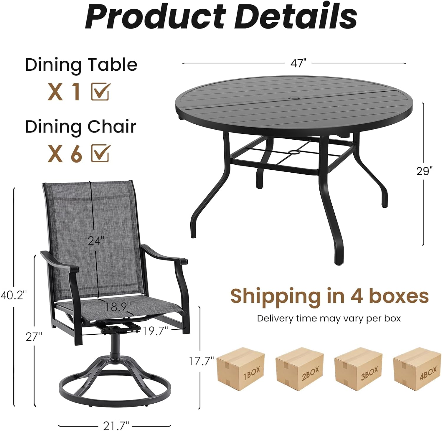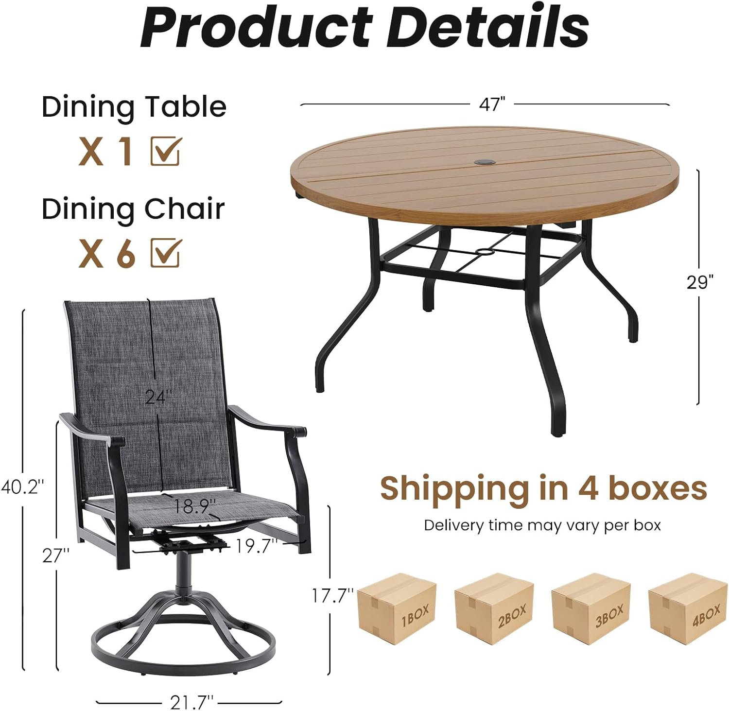 | Included Components | Patio Table + 6 x Chairs, Tool Kits + Manual |