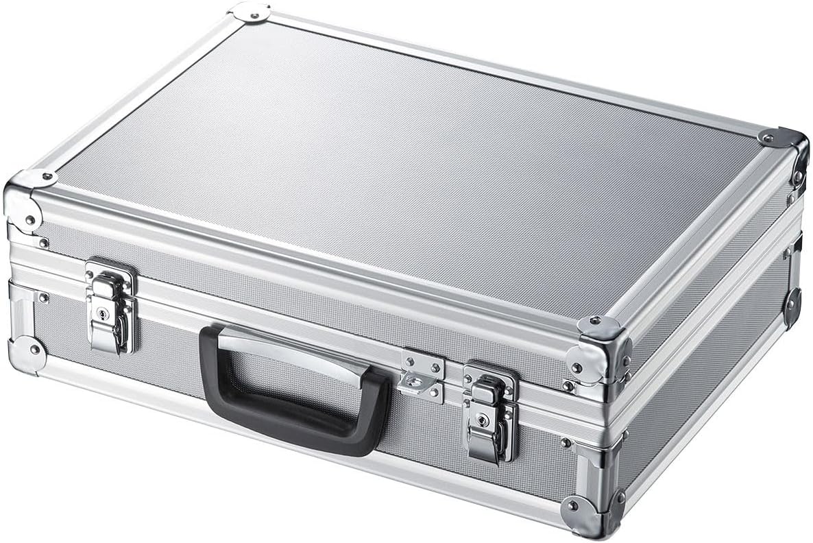 Hard case with an aluminum body that is resistant to external impact. Perfect for carrying and storing your precision equipment and computers. Blocks and corrugated cushions that can be pulled out according to size to protect your storage device. It also has a hardware (diameter of 0.4 inches (10 mm) to attach two locks and a thicker padlock for added security. Made in Japan. Padlock sold separately. Color: Silver Size: External Dimensions (W x D x H): 17.3 x 5.5 x 12.6 inches (440 x 140 Reference Storage Dimensions (W x D x H): 16.5 x 4.9 x 11.8 inches (420 x 125 x 3Weight: 11.8 oz (3,180 g). Material: Aluminum Accessories: Block cushion x 2, bottom cushion x 1, wave cushion x 1, keys x 2. Compatible models: Precision equipment and computers (up to 15.6 inches wide for PCs).