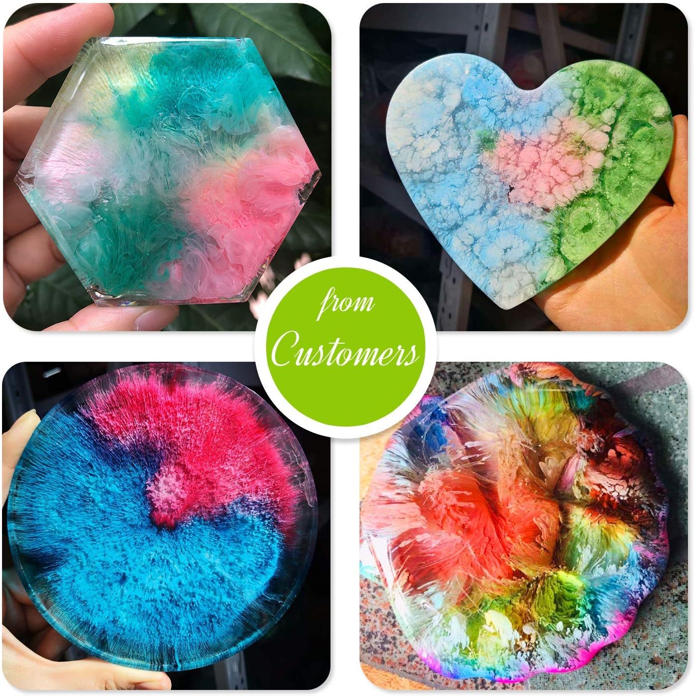 Have fun and let your imagination go wild to create all the creative DIY projects with our colorful, highly saturated, transparent inks! A wonderful selection of 10 vibrant colored alcohol ink and 2 white alcohol ink: Red, Dark Blue, Pink, Black, Yellow, Green, Purple, Blue, Brown, Teal The difference between the 2 white ink are the falling height: The ‘Middle’ white will push the color to the middle; The ‘Bottom’ white will push the color to the bottom.