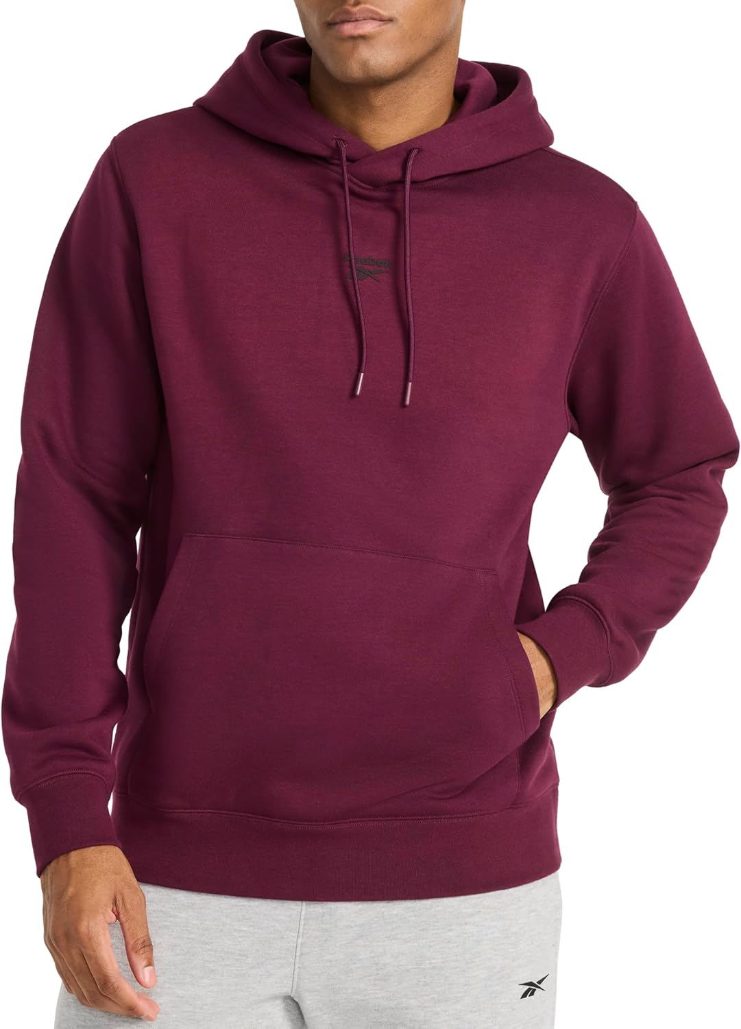 Bring street energy to every layer in the Reebok Men’s Hoodie. Built from midweight cotton-poly fleece, this essential blends comfort with a sharp, athletic edge. A kangaroo pocket, tonal neck taping, and ribbed cuffs deliver a clean finish, while the embroidered Vector logo keeps the look authentically Reebok. Perfect for warm-ups, cool-downs, and everything in between.