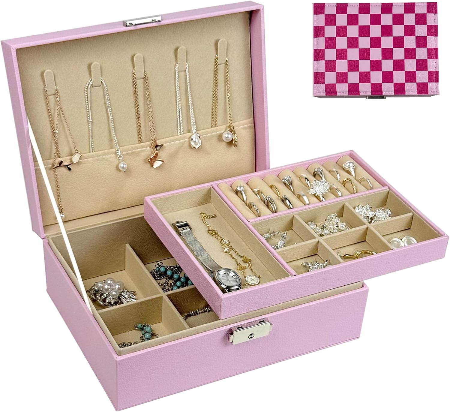 Upgrade your jewelry organization with this elegantly designed double-layer jewelry box, created to keep every piece of your collection neatly arranged, protected, and easy to find. Featuring a premium PU leather exterior and a soft interior, this jewelry case blends durability with timeless style—perfect for your dresser, vanity, or closet shelf. Open the lid to reveal a well-structured upper layer complete with ring rolls, multiple small compartments for earrings and studs, and dedicated bracelet and watch sections. The inner side of the lid includes necklace hooks and an elastic pocket, allowing your chains to hang freely without tangling. Beneath the removable tray, a spacious lower compartment offers even more room to store bulkier jewelry pieces such as statement necklaces, bangles, brooches, and keepsakes. Thoughtfully constructed with clear functional divisions, this jewelry box ensures every accessory—from your daily essentials to your special-occasion pieces—has its own place. The sturdy metal lock provides added security, while the PU leather finish is resistant to dirt and easy to clean, ensuring long-lasting beauty and practicality. Whether you’re treating yourself or surprising someone special, this jewelry organizer is a stunning blend of fashion and function. It makes a perfect gift for birthdays, anniversaries, Christmas, Valentine’s Day, Mother’s Day, or any moment worth celebrating. Stylish, spacious, and beautifully crafted, it is designed to make your jewelry collection shine.