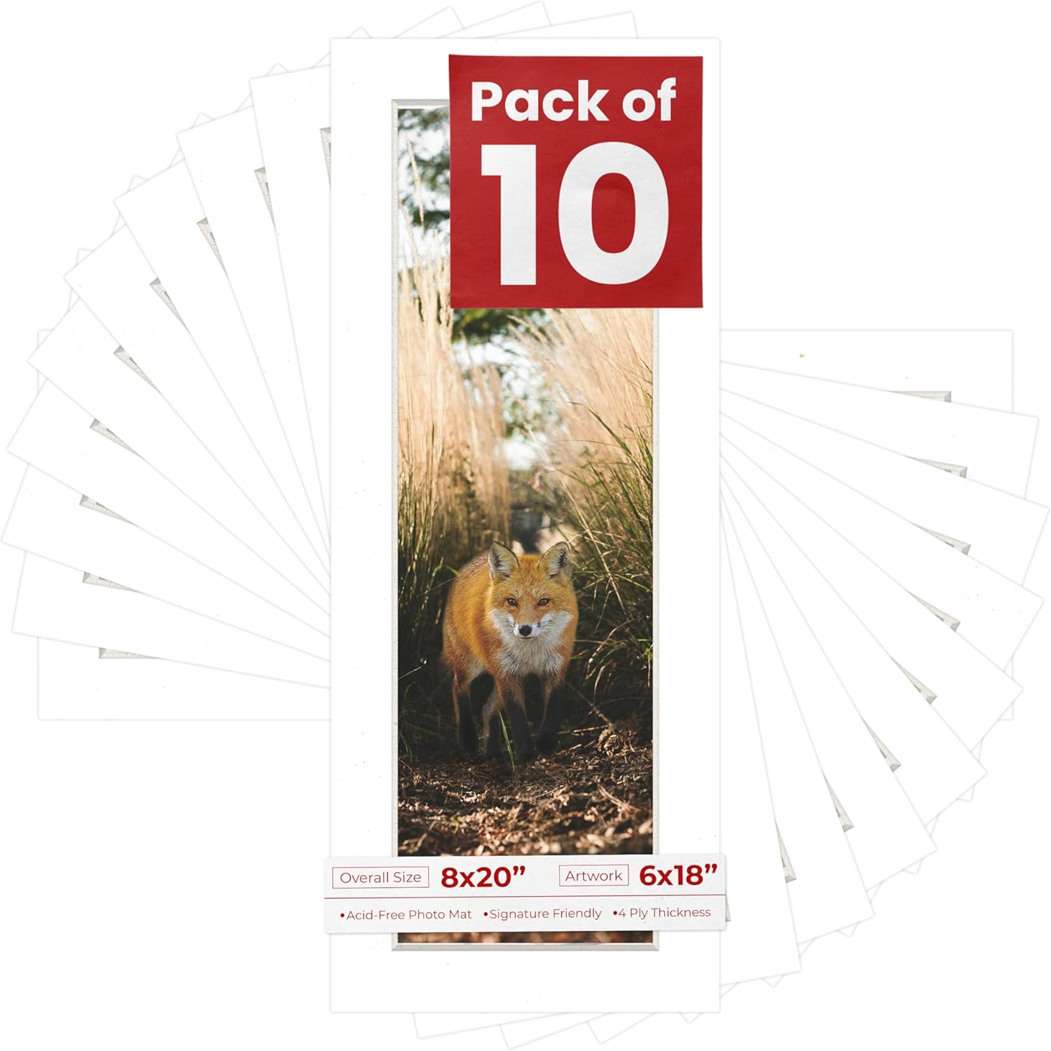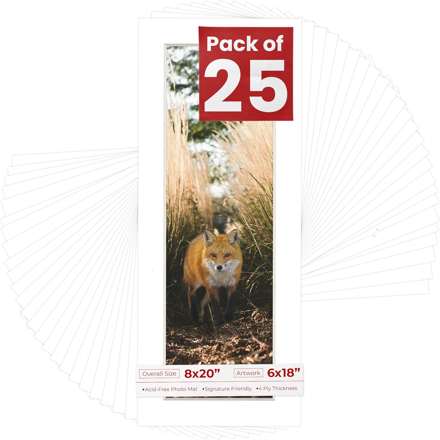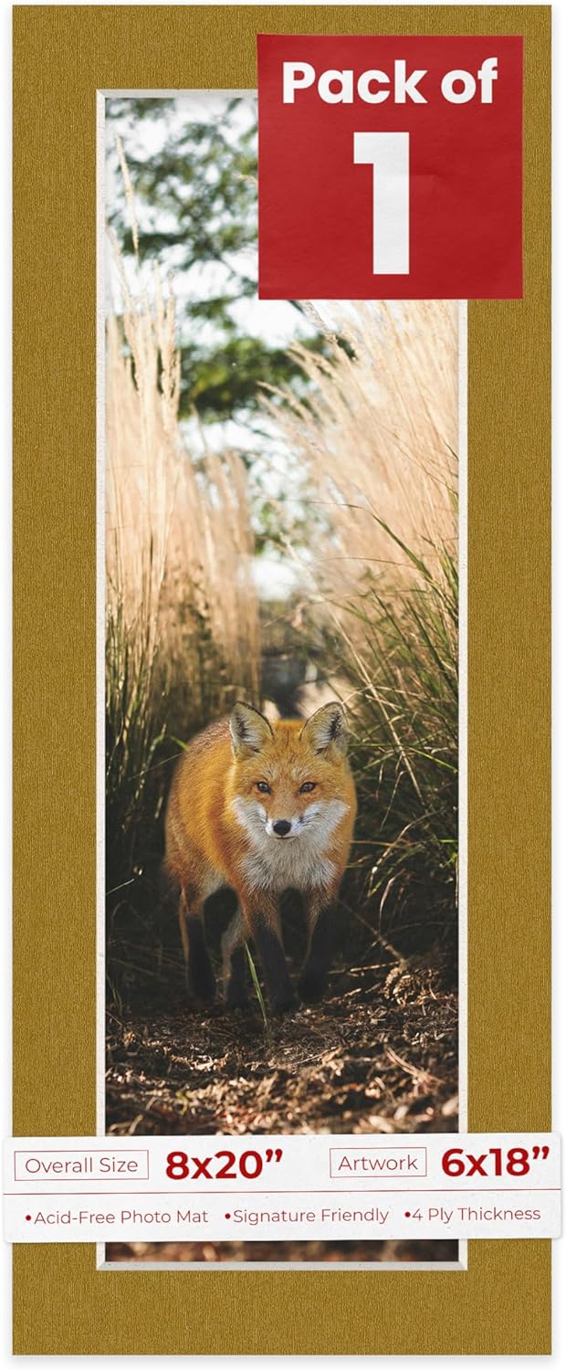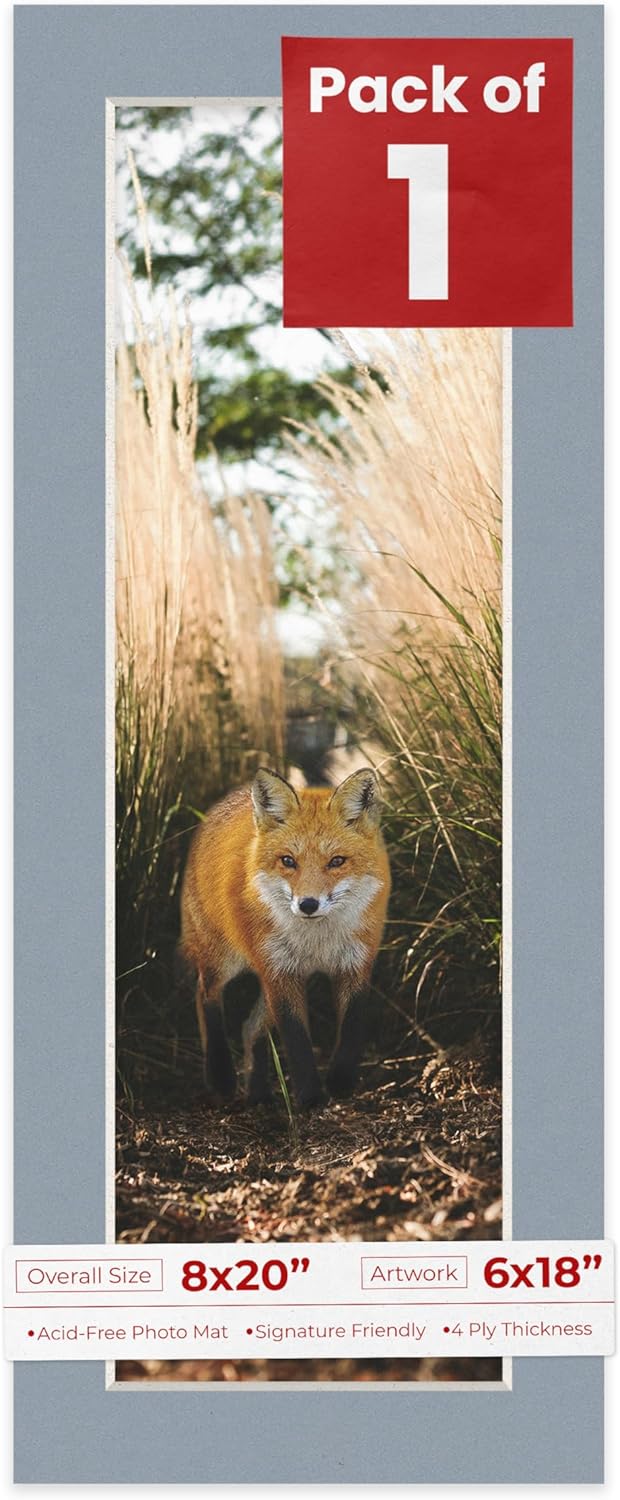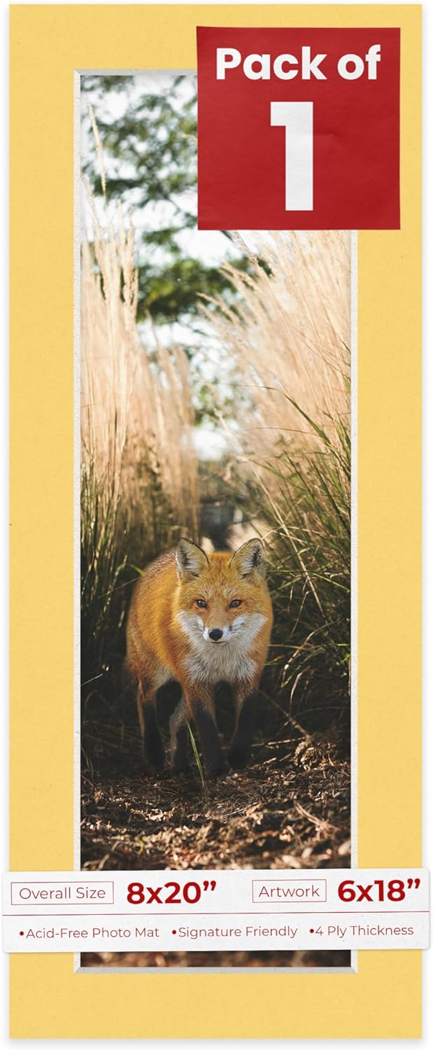 ONE SINGLE MAT with Acid Free Backing Boards and Crystal Clear Self Seal Bag, Featuring a picture opening for a 6x18 inch photo, to fit in a 8x20 inch picture frame. Photo openings are beveled cut 0.5" smaller than the art size advertised to overlap the photo and help keep it securely in the frame.