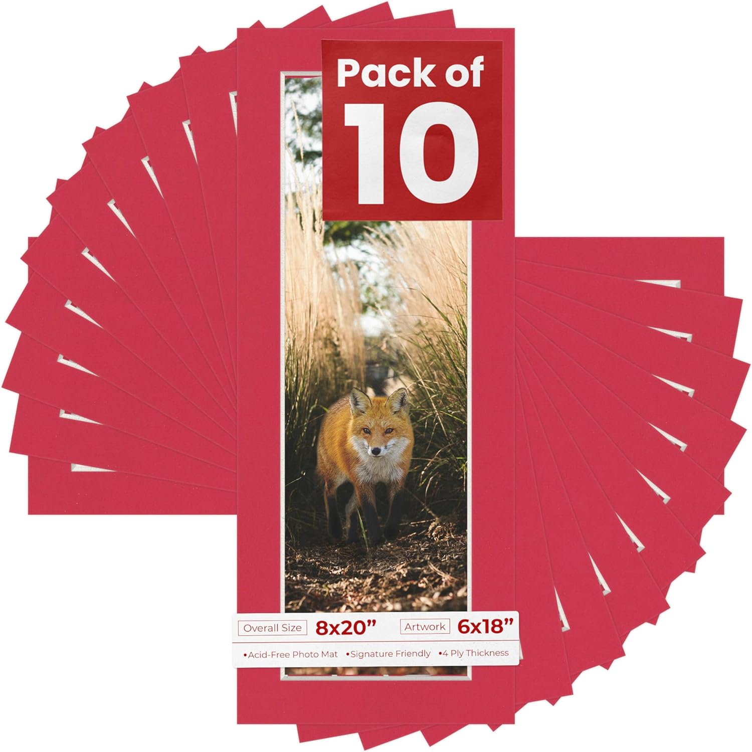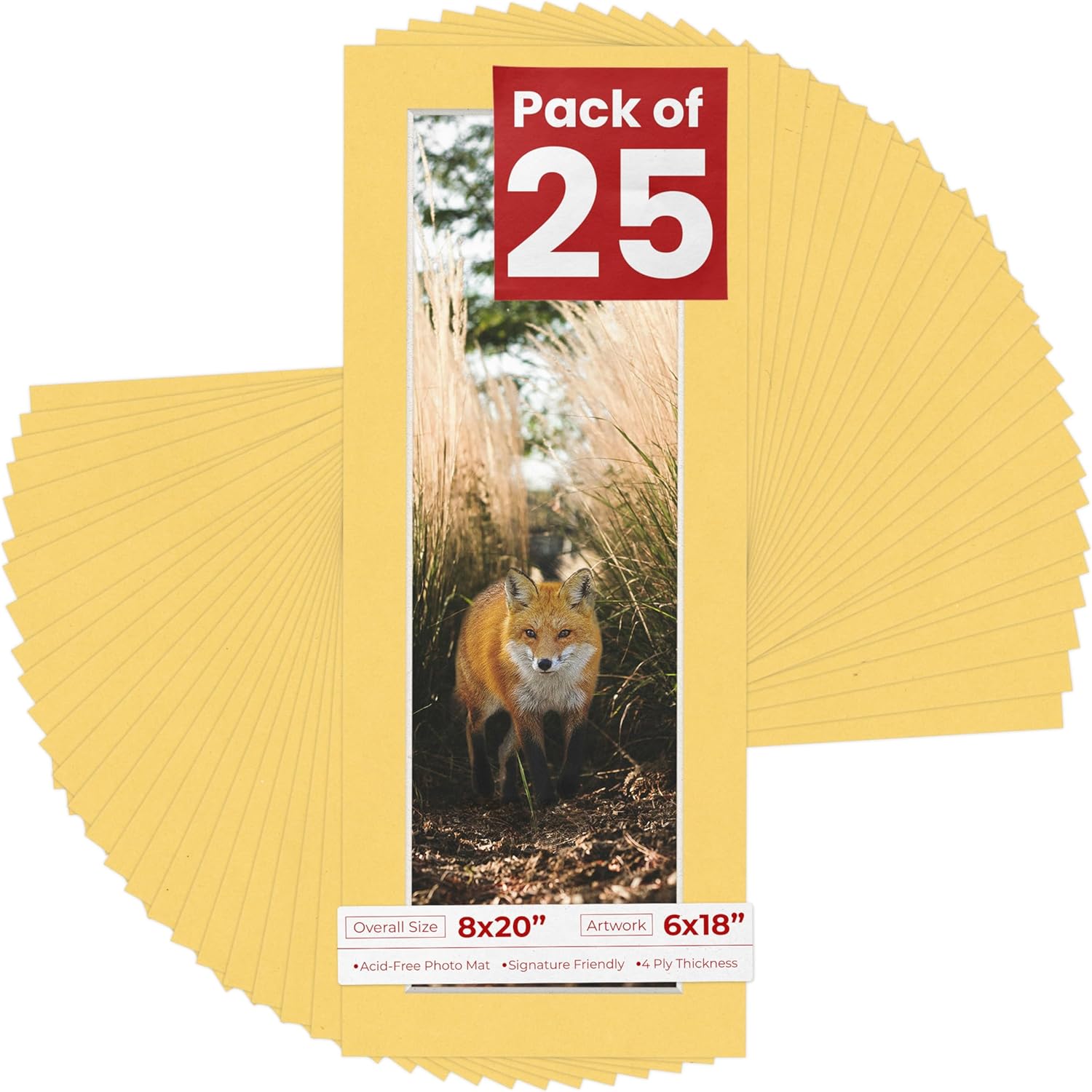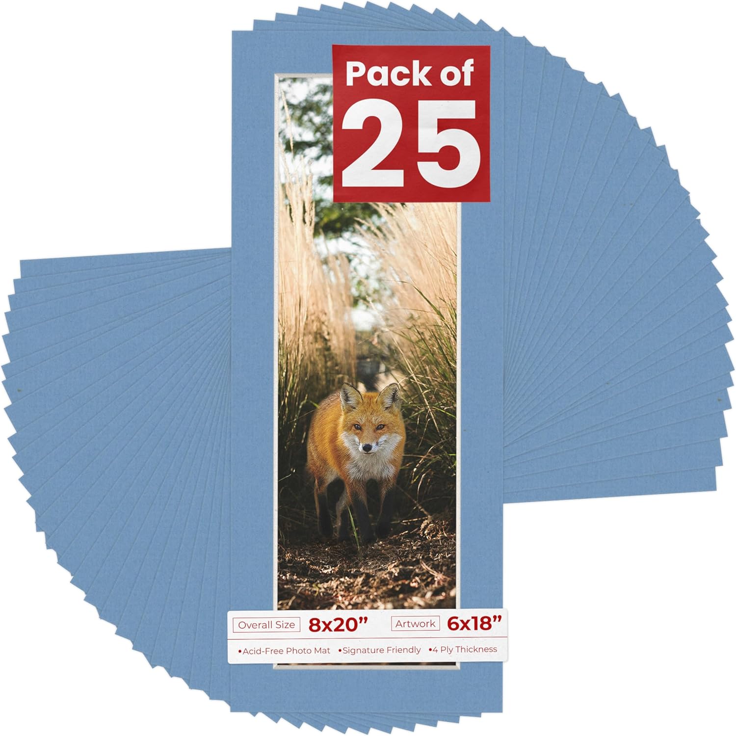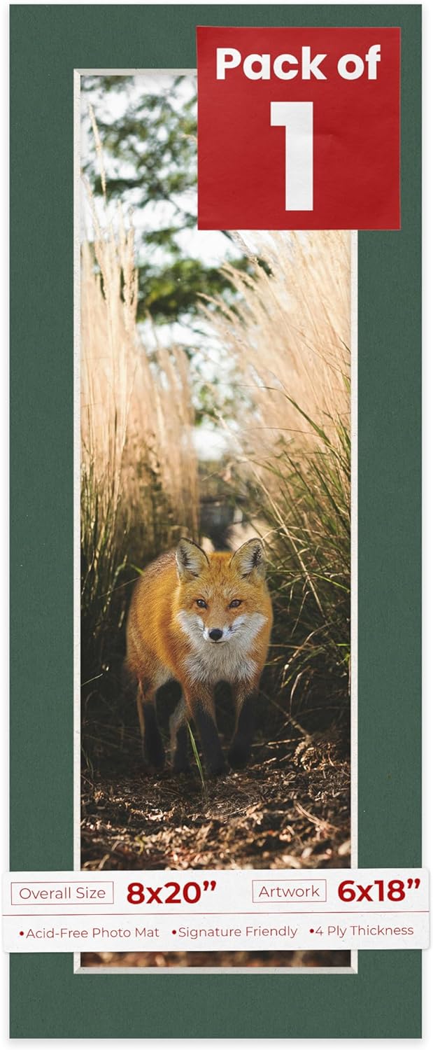 ONE SINGLE MAT with Acid Free Backing Boards and Crystal Clear Self Seal Bag, Featuring a picture opening for a 6x18 inch photo, to fit in a 8x20 inch picture frame. Photo openings are beveled cut 0.5" smaller than the art size advertised to overlap the photo and help keep it securely in the frame.