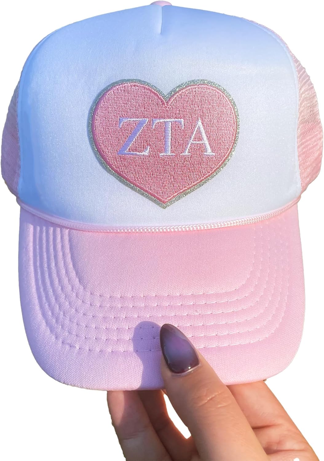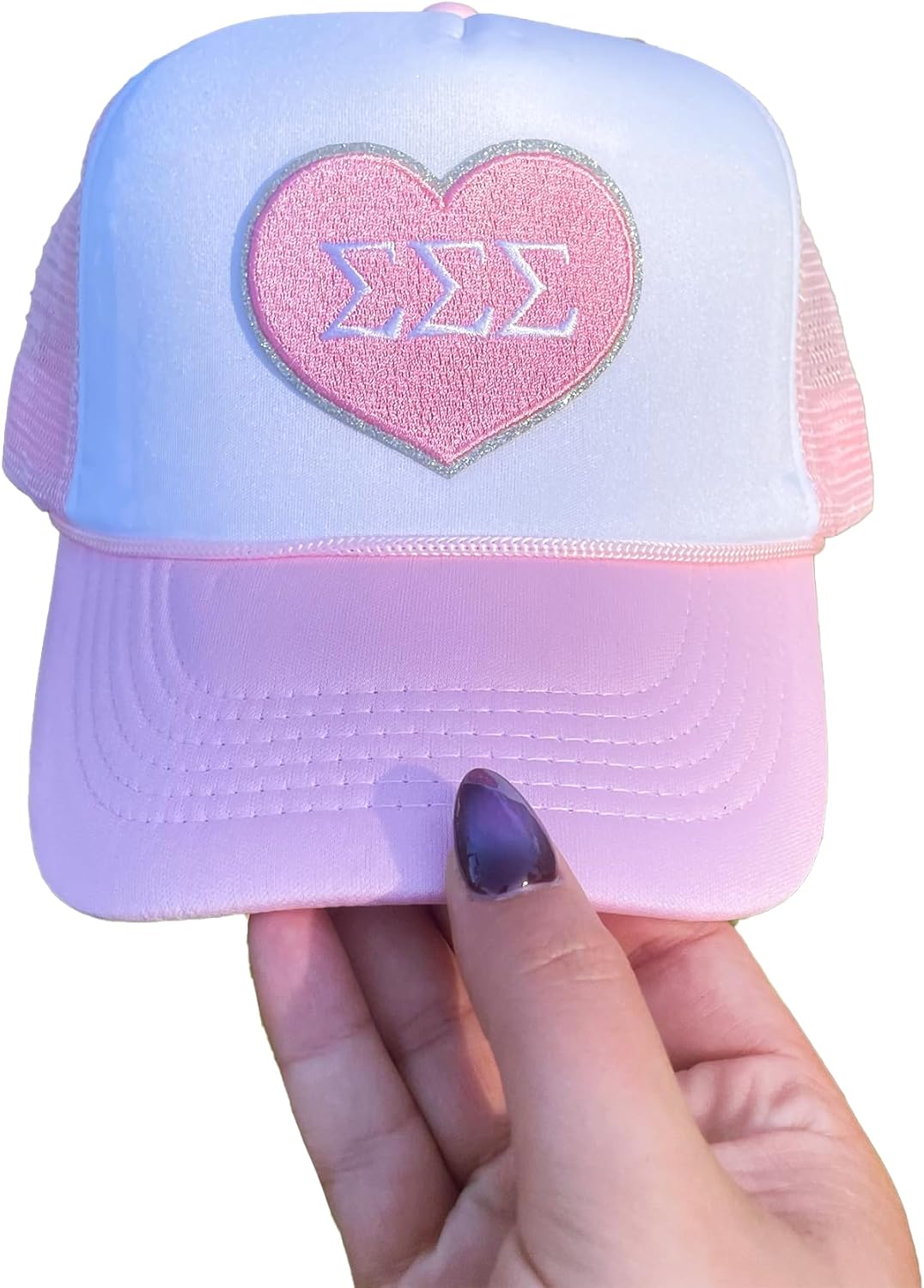 Celebrate your sorority pride in style with this Go Greek Chic exclusive sorority trucker hat! Featuring a light pink heart patch with a sparkling silver glitter border and your sorority letters, this hat is the perfect blend of cute and classic. The structured white and light pink foam front, breathable mesh back, and adjustable snapback strap make it a comfortable fit for everyday wear. Whether you’re headed to Bid Day, Big/Little reveal, a sisterhood retreat, or just running errands, this trucker hat is a must-have accessory for any sorority girl. Designed for both active college life and alumnae pride, it’s an adorable way to show off your letters while keeping the sun out of your eyes. It also makes a thoughtful gift for new members, Bigs, Littles, and graduating sisters. Pair it with your favorite Bid Day tee, sorority sweatshirt, or game-day outfit to complete your Greek life look.