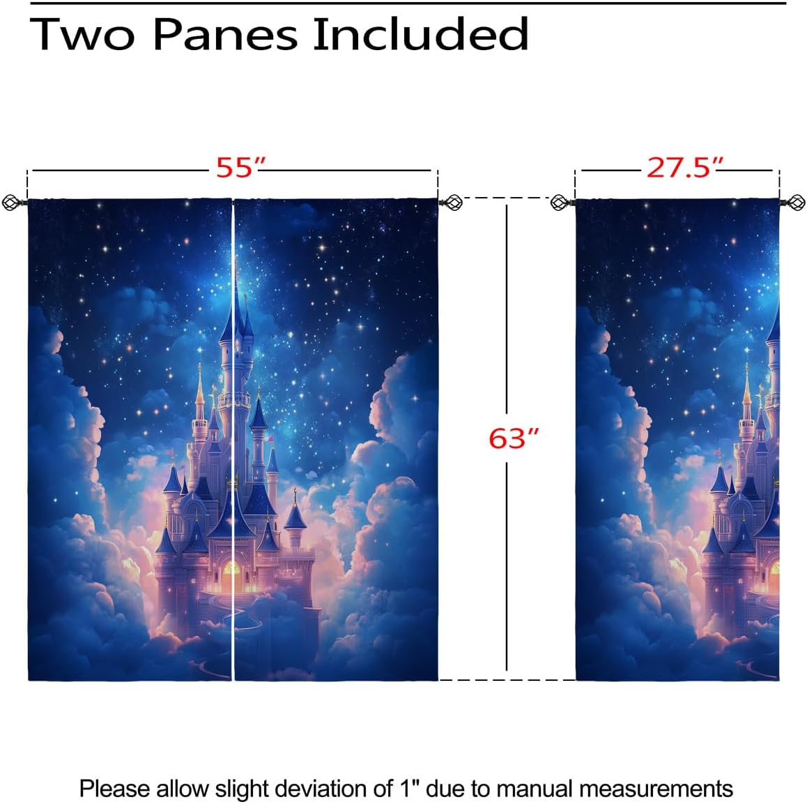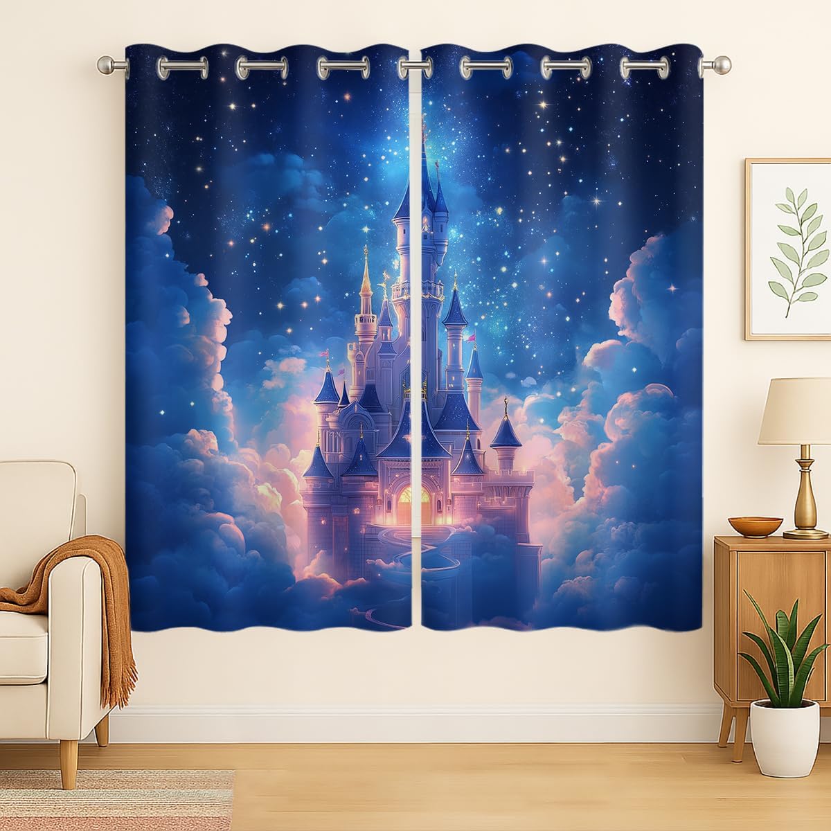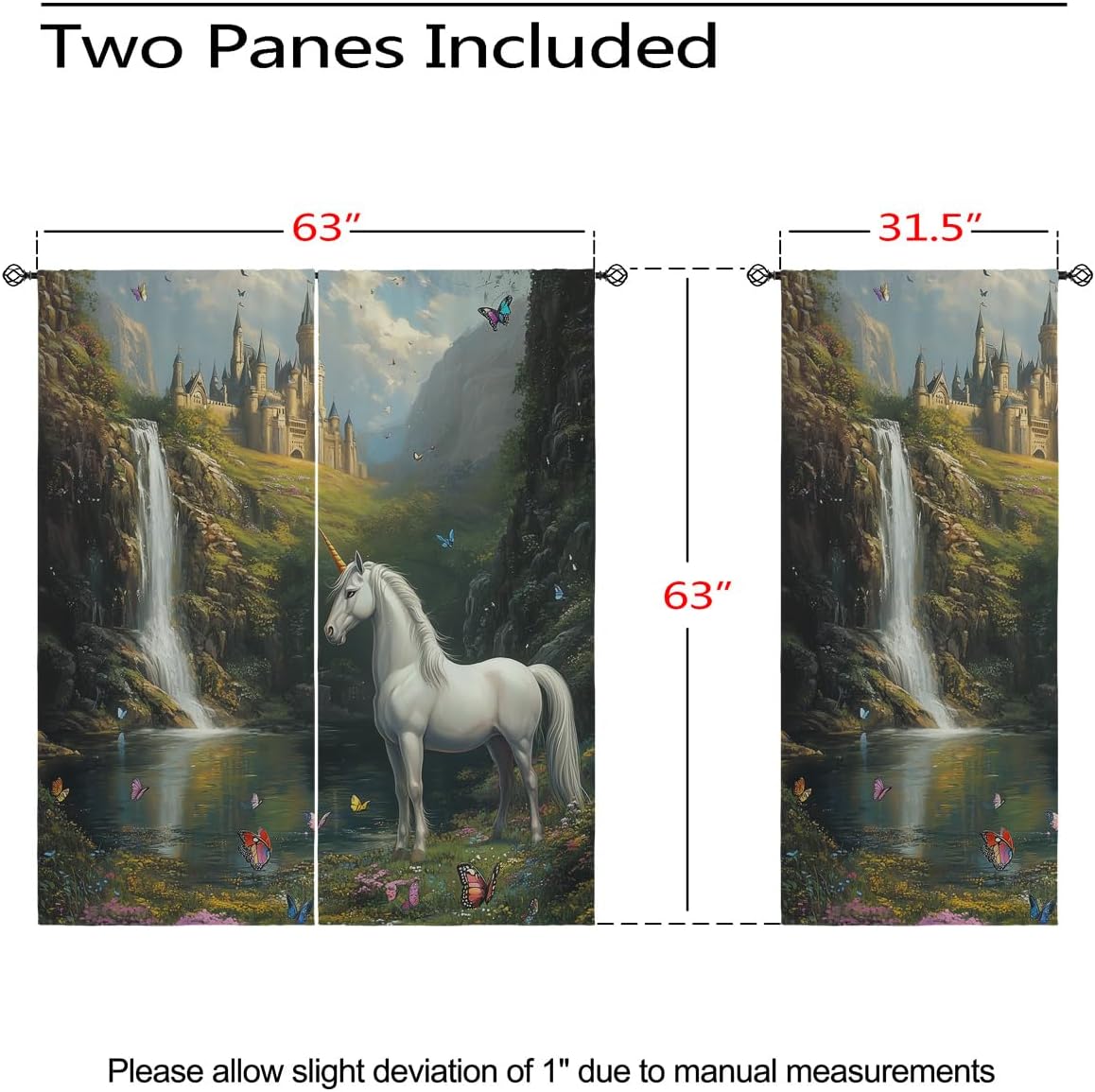 These print curtains are perfect for Living room, bedroom, kids room, kitchen, yard, patio, parlor, sliding door with Magic Castle, Fairy Tale Unicorn Butterfly Wonderland pattern.- Unique design:· Save energy costs by insulating against heat and cold.· Reduce noises from busy streets and high-traffic areas.· Protect furniture from sun damage and fading.· Provides complete privacy when needed· Perfect for any bedroom, office kids room and living room.- Package Included:· Blackout window curtains 2 Pcs set ( two panels).- Material:· Our Blackout Curtain Liners are crafted from a durable soft and thick triple weaved blackout fabric which can block out sunlight and UV rays. The darker color of the fabric, the more light it can block.- Easy Care Instructions:· Machine washable in cold water· Do not bleach.· tumble dry on low· low temperature ironing- Notes:· For your curtains to be more perfect, please choose a size 5-10 Inch larger than the actual window width.· here may be slight differences in colors on different displays. If you have any questions about the product, please feel free to contact us.