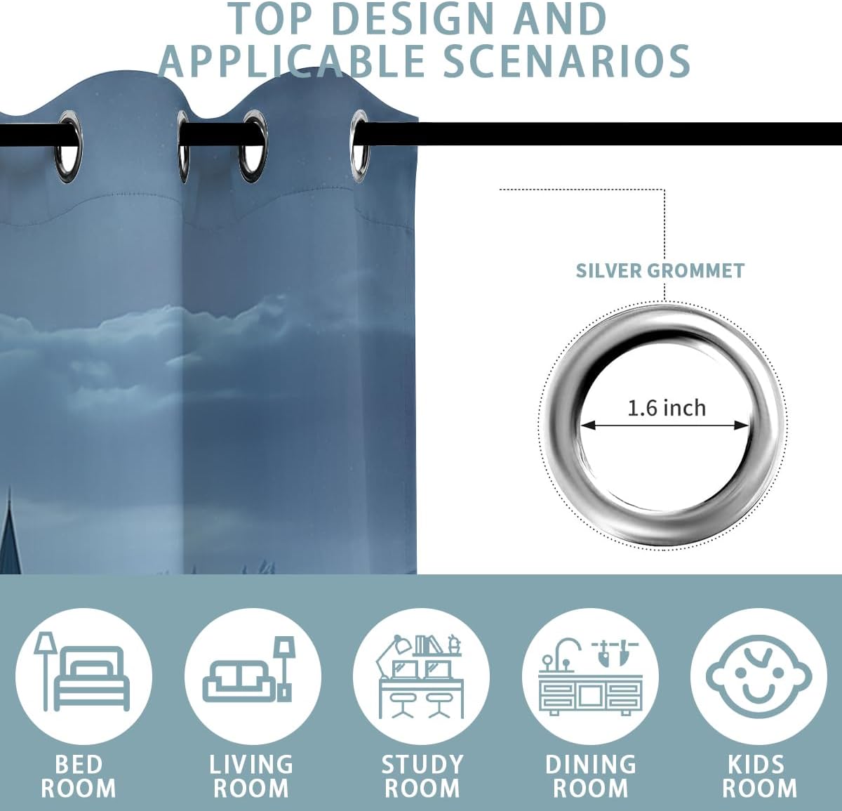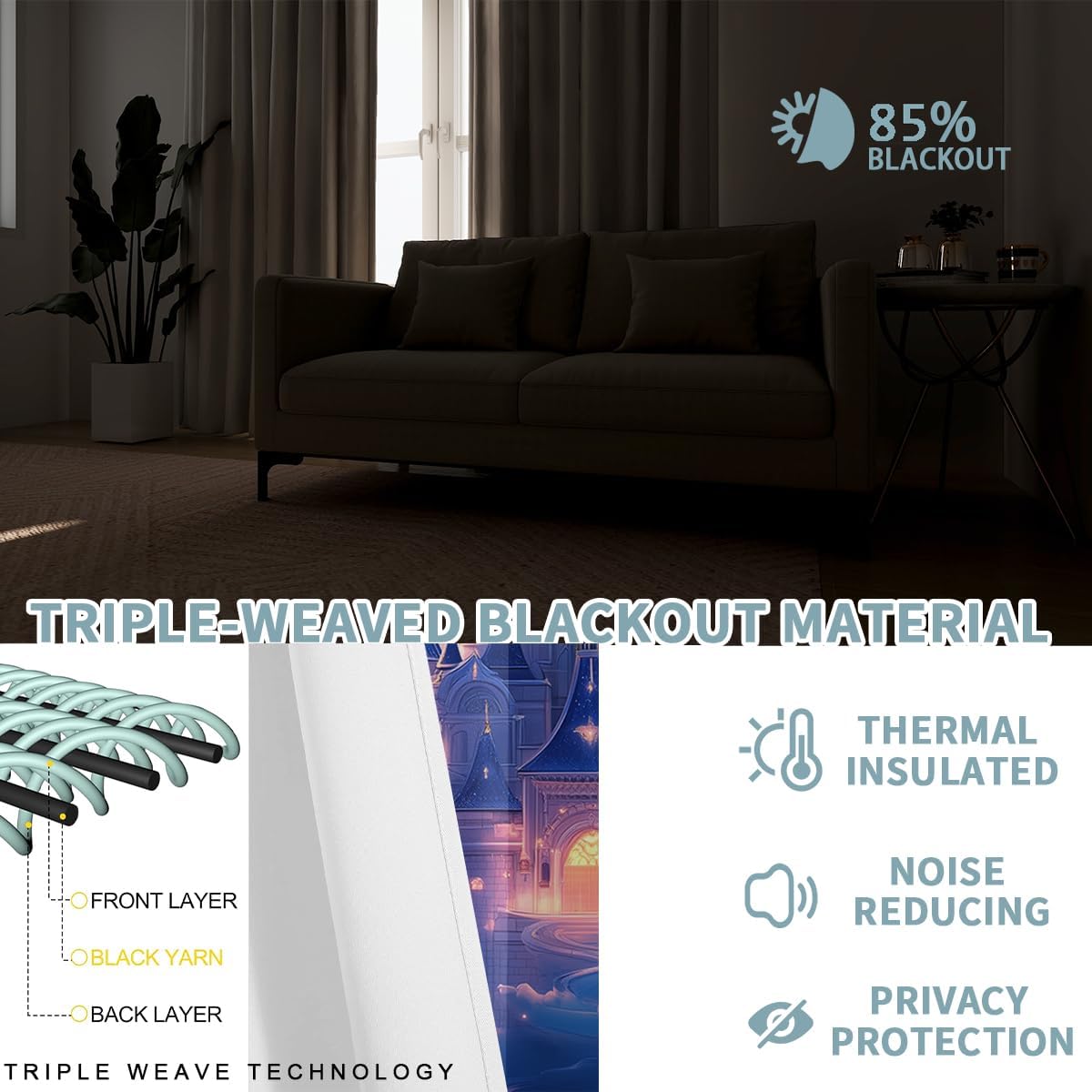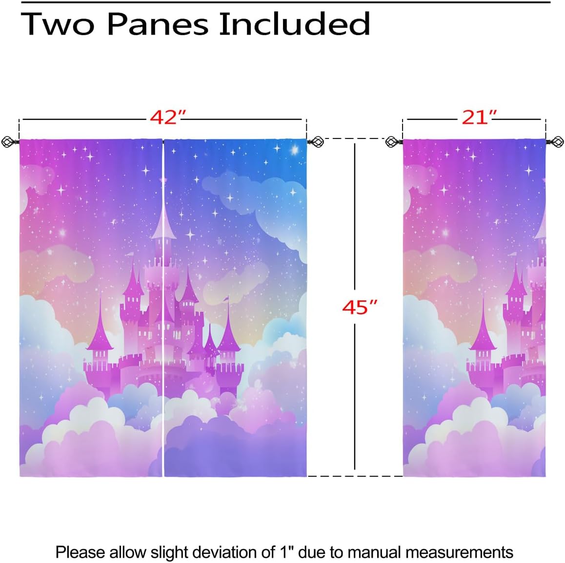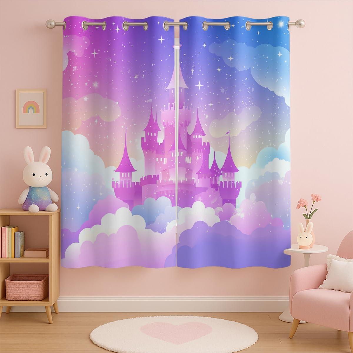 These print curtains are perfect for Living room, bedroom, kids room, kitchen, yard, patio, parlor, sliding door with Magic Castle, Fairy Tale Unicorn Butterfly Wonderland pattern.- Unique design:· Save energy costs by insulating against heat and cold.· Reduce noises from busy streets and high-traffic areas.· Protect furniture from sun damage and fading.· Provides complete privacy when needed· Perfect for any bedroom, office kids room and living room.- Package Included:· Blackout window curtains 2 Pcs set ( two panels).- Material:· Our Blackout Curtain Liners are crafted from a durable soft and thick triple weaved blackout fabric which can block out sunlight and UV rays. The darker color of the fabric, the more light it can block.- Easy Care Instructions:· Machine washable in cold water· Do not bleach.· tumble dry on low· low temperature ironing- Notes:· For your curtains to be more perfect, please choose a size 5-10 Inch larger than the actual window width.· here may be slight differences in colors on different displays. If you have any questions about the product, please feel free to contact us.