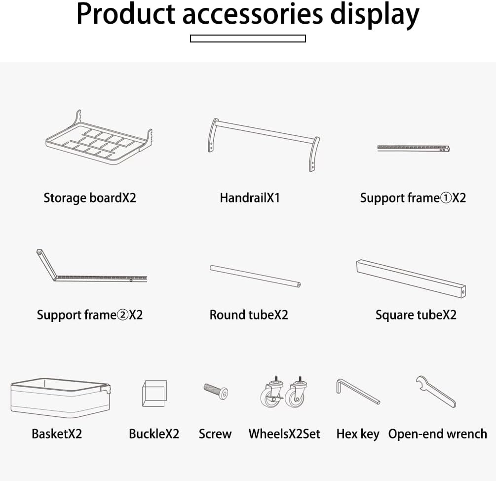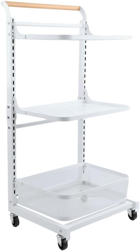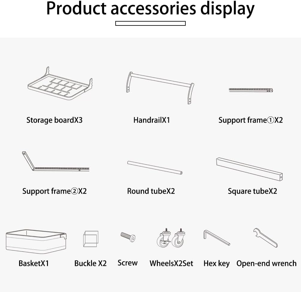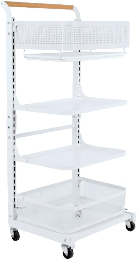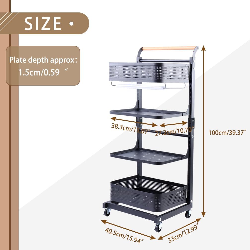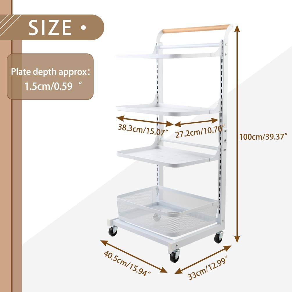 Material: Iron with Plastic Spraying + Wooden Handle Color: White / Black Size Approx.: 3 Tier (3 Plates)----Entire Size: 40.5 x 33 x 78cm/ 15.94'' x 12.99'' x 30.7'' 3 Tier (2 Plates + 1 Basket)----Entire Size: 40.5 x 33 x 78cm/ 15.94'' x 12.99'' x 30.7'' 4 Tier (4 Plates)----Entire Size: 40.5 x 33 x 100cm/ 15.94'' x 12.99'' x 39.37'' 4 Tier (3 Plates + 1 Basket)----Entire Size: 40.5 x 33 x 100cm/ 15.94'' x 12.99'' x 39.37'' 4 Tier (2 Plates + 2 Baskets)----Entire Size: 40.5 x 33 x 100cm/ 15.94'' x 12.99'' x 39.37'' 4 Tier (2 Plates + 1 Basket + 1 Compartment Basket )----Entire Size: 40.5 x 33 x 100cm/ 15.94'' x 12.99'' x 39.37'' 5 Tier (5 Plates)----Entire Size: 40.5 x 33 x 122cm/ 15.94'' x 12.99'' x 48.03'' Plate Size: 38.3 x 27.2 x 1.5cm/ 15.07'' x 10.7'' x 0.59'' Bottom Basket Size: 38.3 x 28.2 x 10.1cm/ 15.07'' x 11.1'' x 3.97'' Compartment Basket Size: 38.7 x 27.7 x 10.2cm/ 15.23'' x 10.9'' x 4.01'' Package Included: 1x Rolling Storage Cart Note: 1.Please allow 1-2cm error due to manual measurement. Please make sure you do not mind before you bid. 2.The colors may have different as the difference display, please understand.