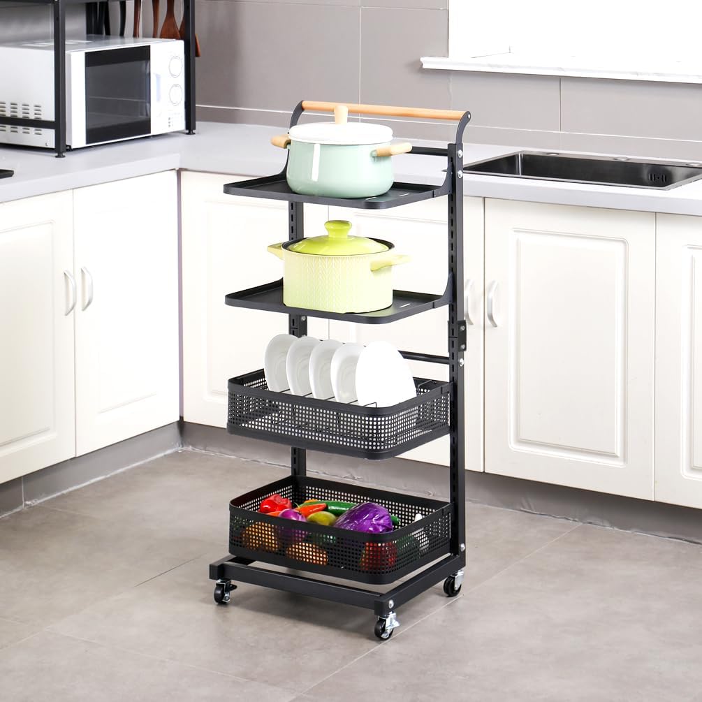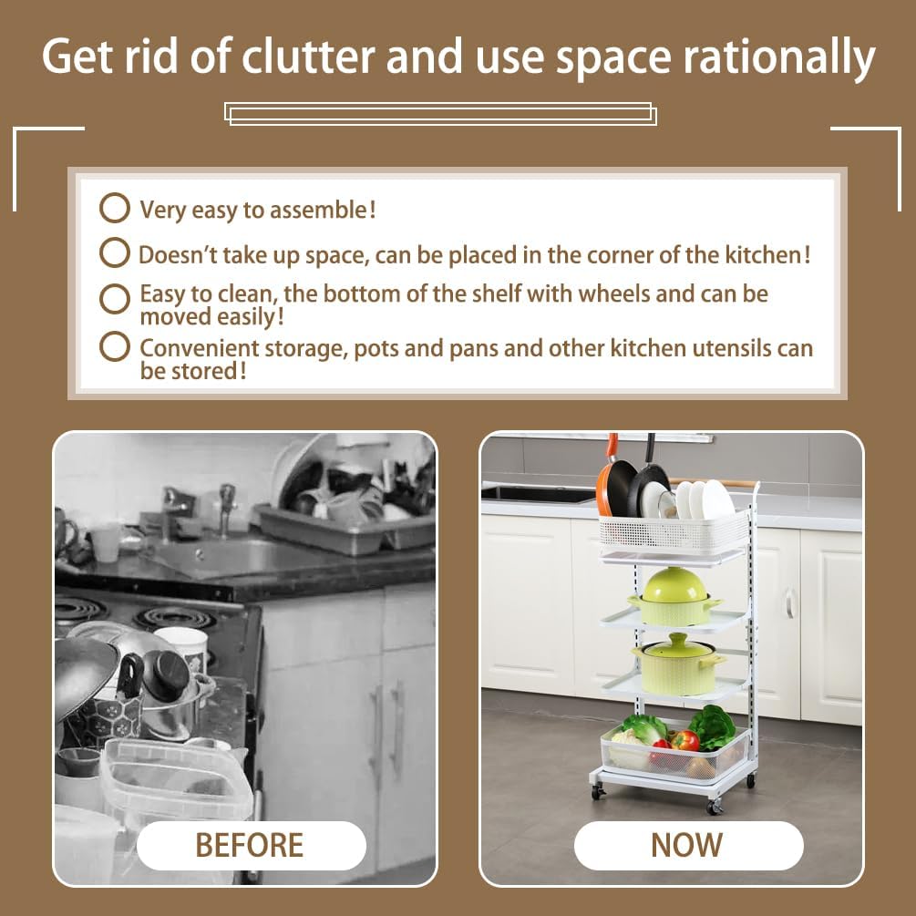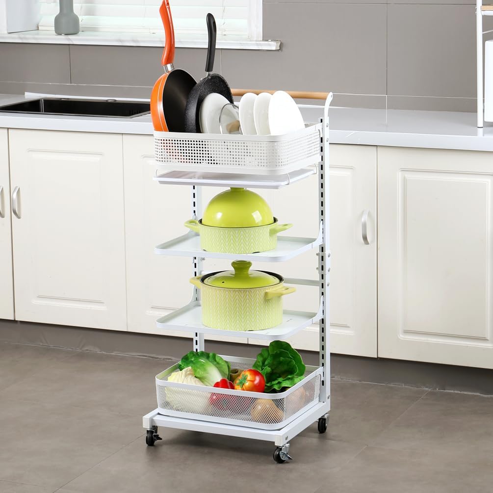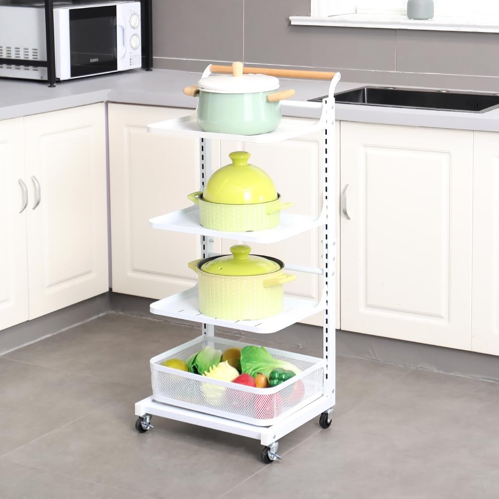 Material: Iron with Plastic Spraying + Wooden Handle Color: White / Black Size Approx.: 3 Tier (3 Plates)----Entire Size: 40.5 x 33 x 78cm/ 15.94'' x 12.99'' x 30.7'' 3 Tier (2 Plates + 1 Basket)----Entire Size: 40.5 x 33 x 78cm/ 15.94'' x 12.99'' x 30.7'' 4 Tier (4 Plates)----Entire Size: 40.5 x 33 x 100cm/ 15.94'' x 12.99'' x 39.37'' 4 Tier (3 Plates + 1 Basket)----Entire Size: 40.5 x 33 x 100cm/ 15.94'' x 12.99'' x 39.37'' 4 Tier (2 Plates + 2 Baskets)----Entire Size: 40.5 x 33 x 100cm/ 15.94'' x 12.99'' x 39.37'' 4 Tier (2 Plates + 1 Basket + 1 Compartment Basket )----Entire Size: 40.5 x 33 x 100cm/ 15.94'' x 12.99'' x 39.37'' 5 Tier (5 Plates)----Entire Size: 40.5 x 33 x 122cm/ 15.94'' x 12.99'' x 48.03'' Plate Size: 38.3 x 27.2 x 1.5cm/ 15.07'' x 10.7'' x 0.59'' Bottom Basket Size: 38.3 x 28.2 x 10.1cm/ 15.07'' x 11.1'' x 3.97'' Compartment Basket Size: 38.7 x 27.7 x 10.2cm/ 15.23'' x 10.9'' x 4.01'' Package Included: 1x Rolling Storage Cart Note: 1.Please allow 1-2cm error due to manual measurement. Please make sure you do not mind before you bid. 2.The colors may have different as the difference display, please understand.